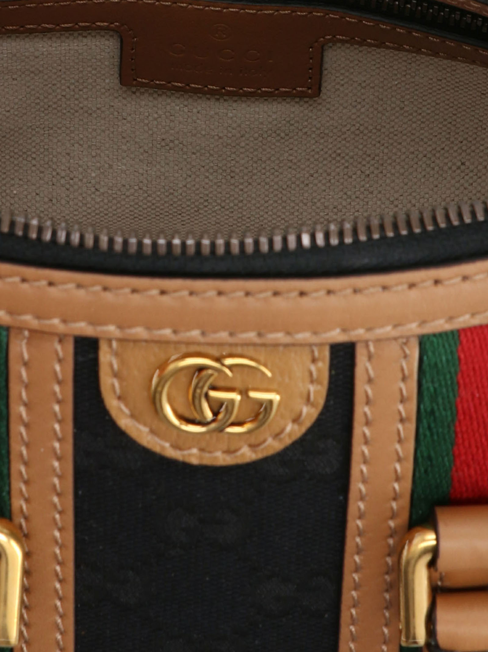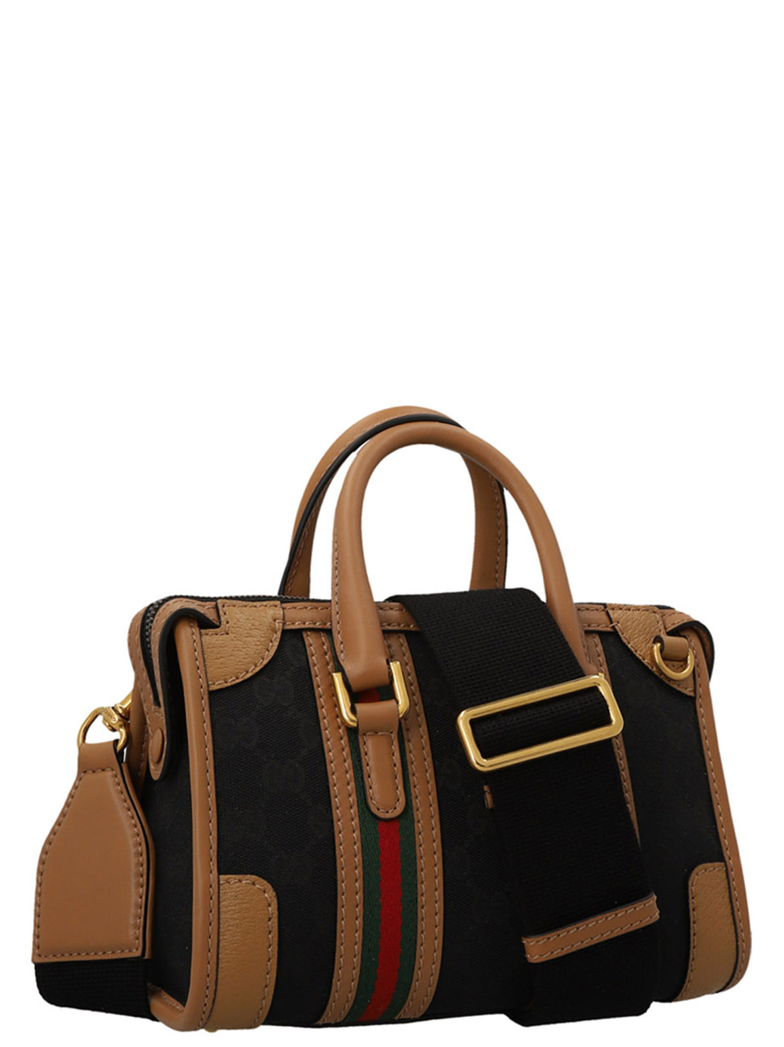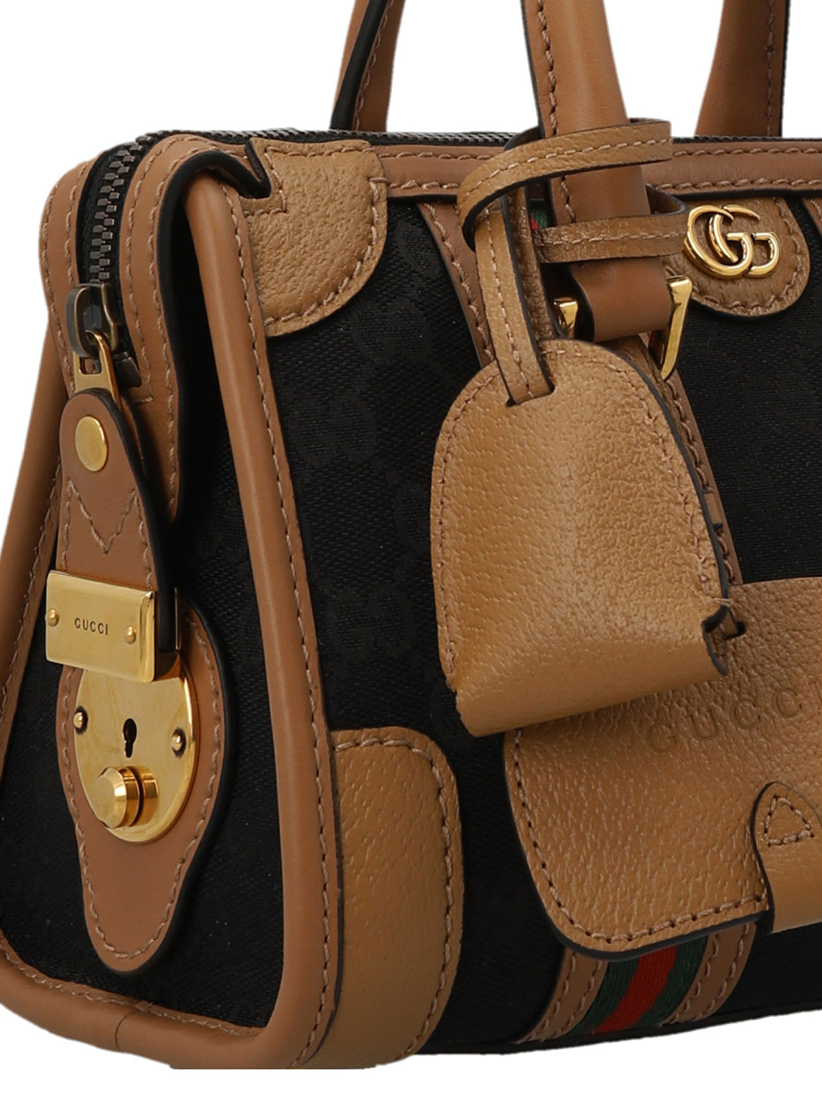 Black Original GG’ mini handbag in black ‘Original GG’ fabric with clear brown leather finishing, gold web tape, red and red web tape, double G, removable padlock with leather keyring, metal protective feet, side padlock, removable fabric shoulder strap and a zip closure.