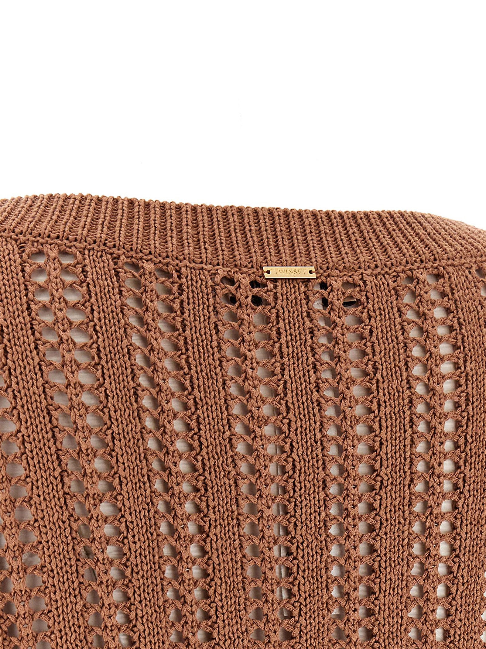 Cotton and viscose blend sweater with perforated knitting pattern, tone-on-tone ostrich feather application on the front, boat neck, long sleeves with dropped shoulders and flared sleeve bottoms.