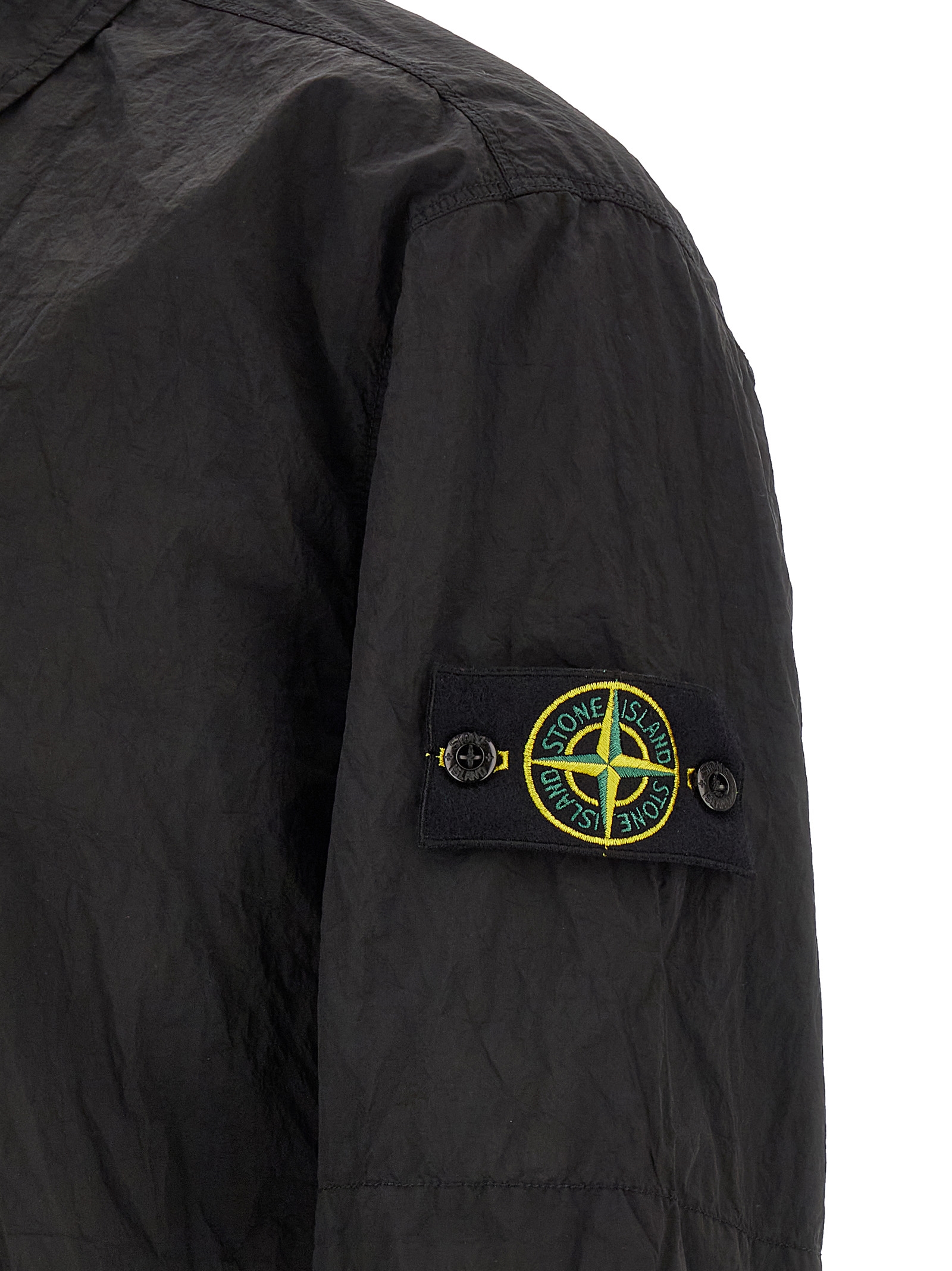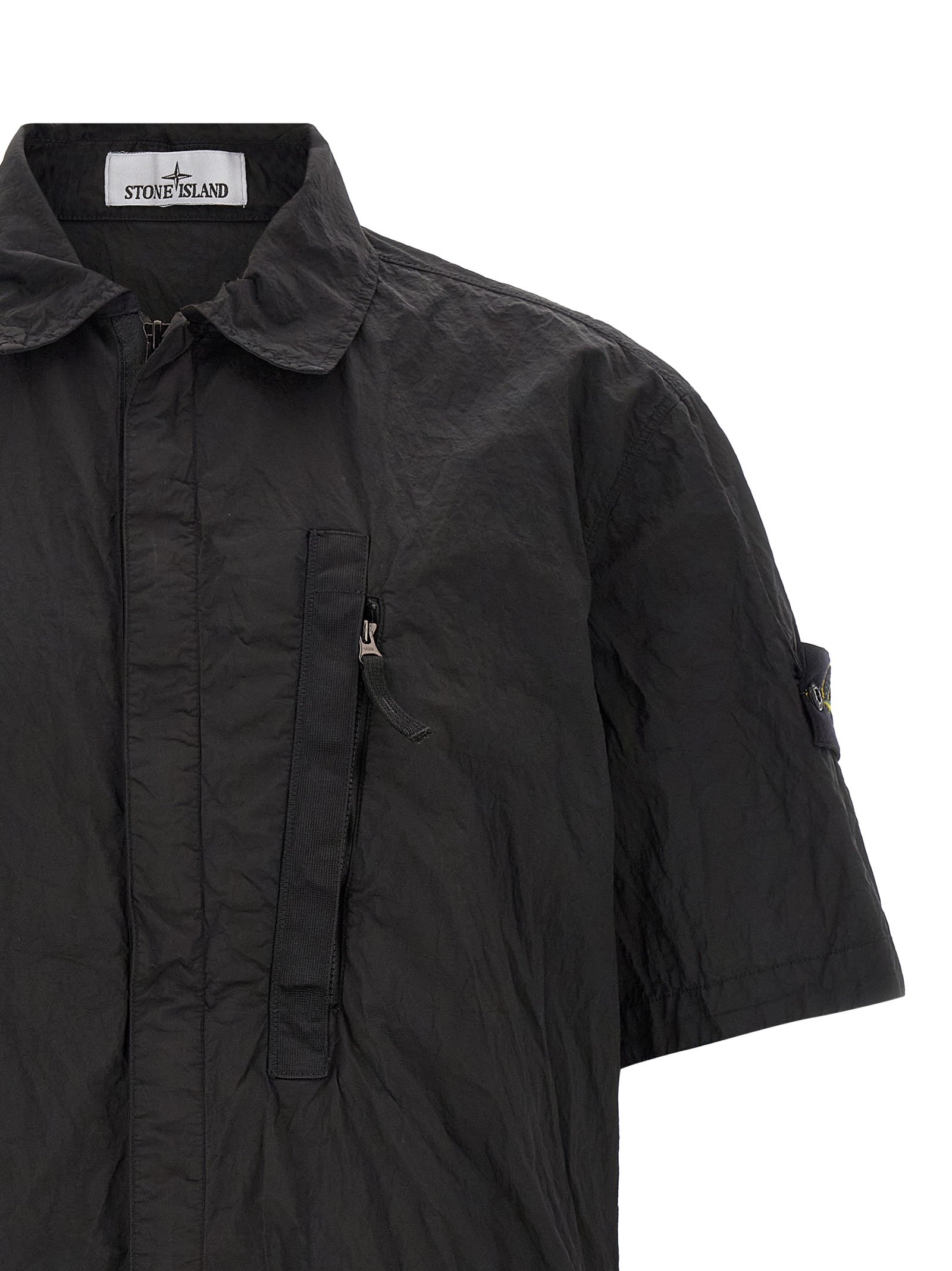 Overshirt in Stone Island Nylon Metal fabric subjected to a double wrinkled effect dyeing process, front hidden zip closure, breast pocket, short sleeves with Logo Badge applied.