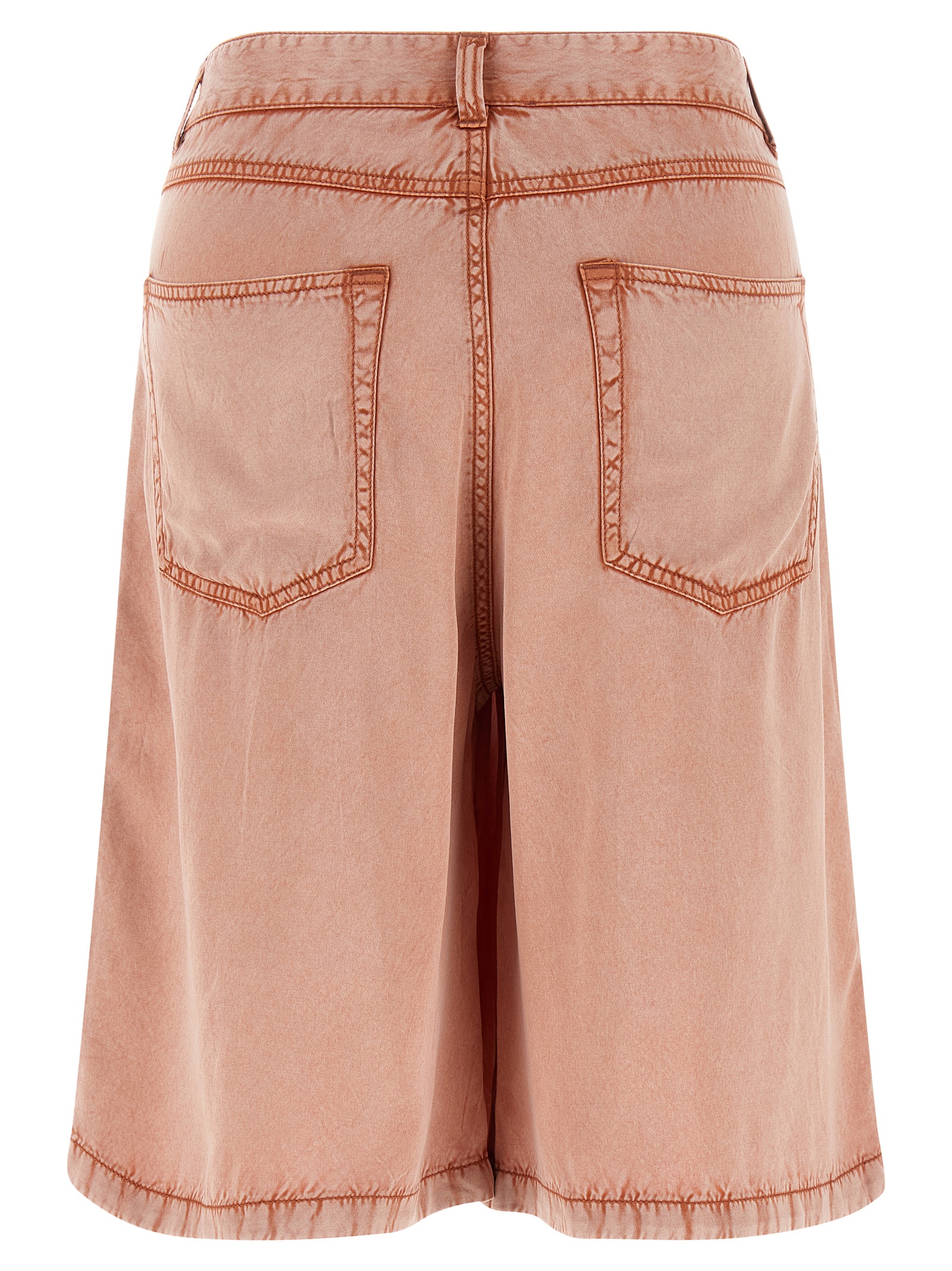 ‘P-Desi’ fluid viscose bermuda shorts with trompe l’oeil jeans print, flared, wide leg, zip and front button closure, five pockets.