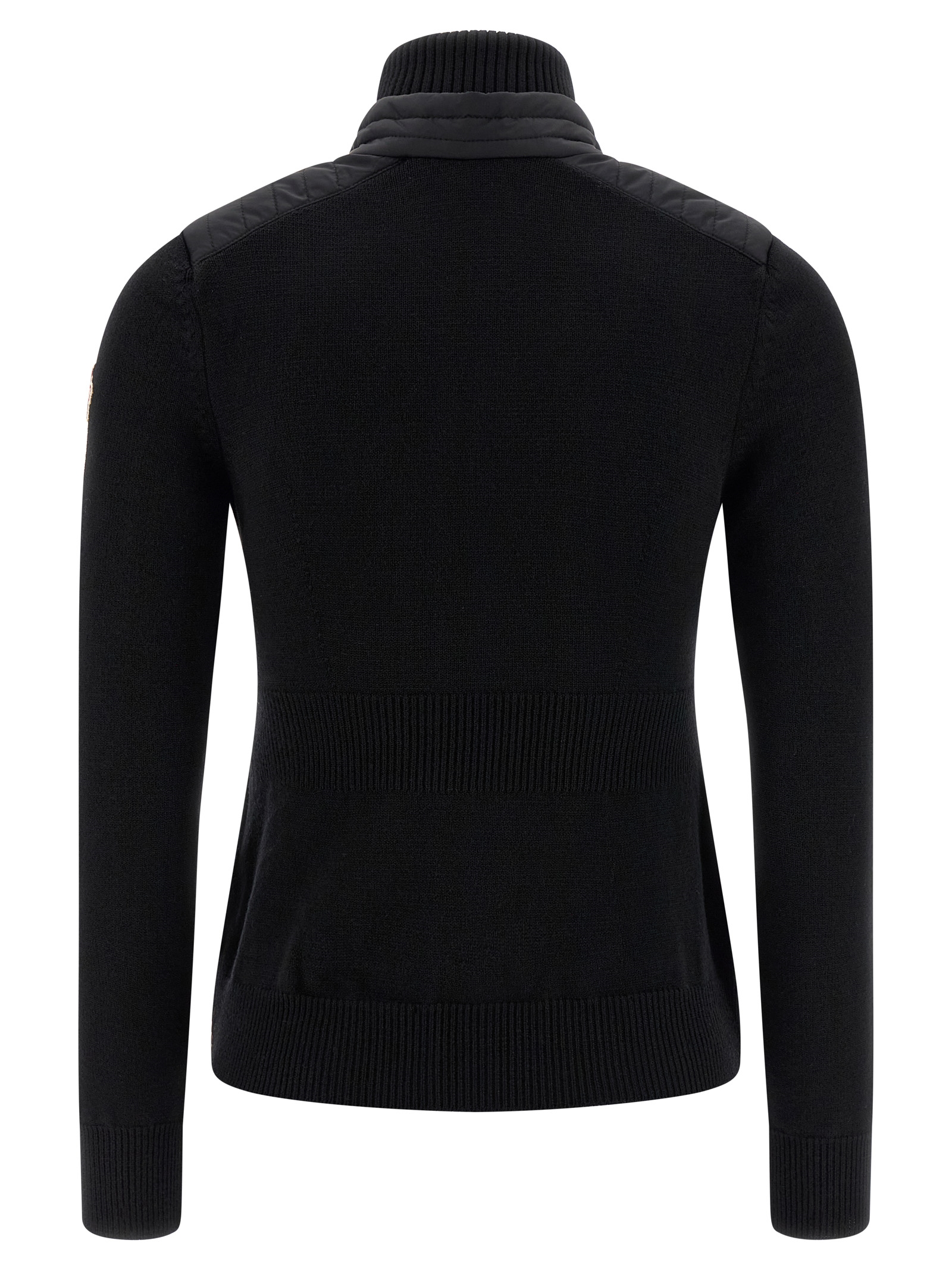 Stretch wool blend cardigan with micro ripstop front with goose down padding, double layer high neck, zip and front snap button closure, long cuffed sleeves and logo patch appliqué.