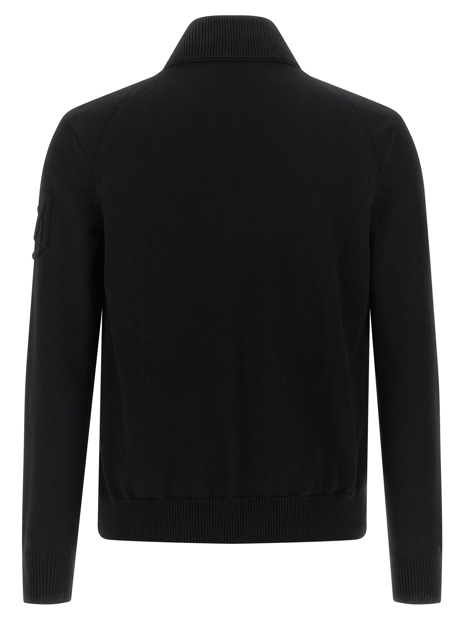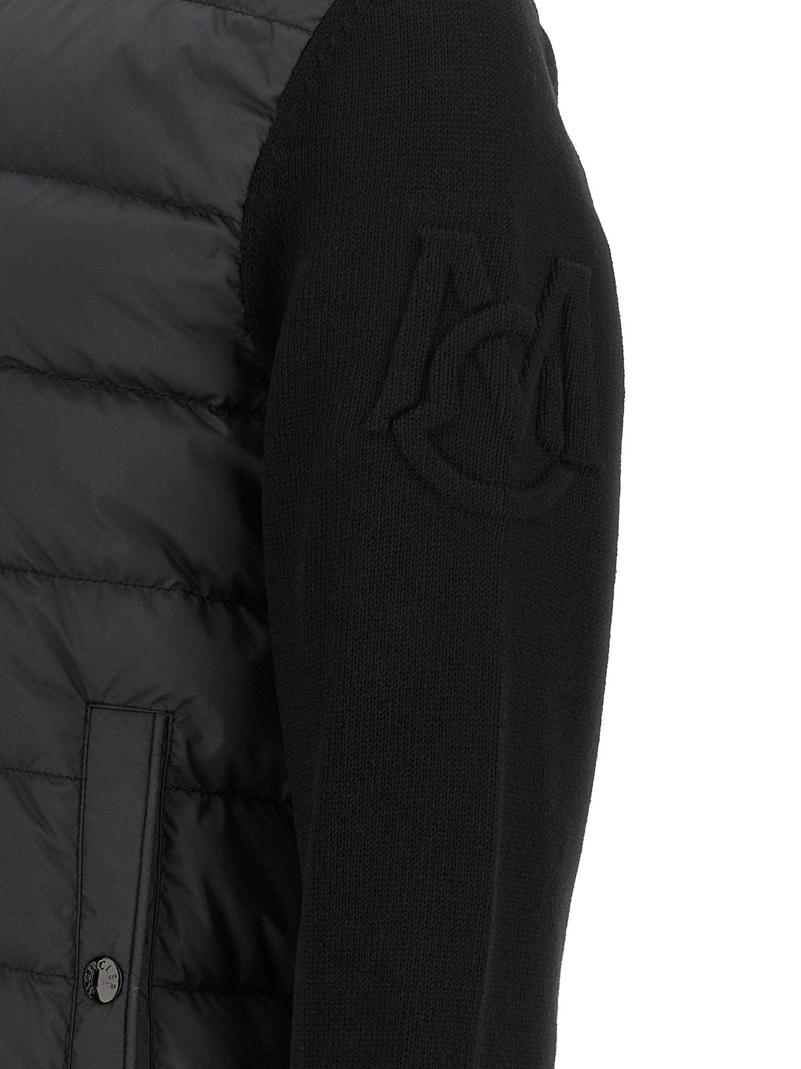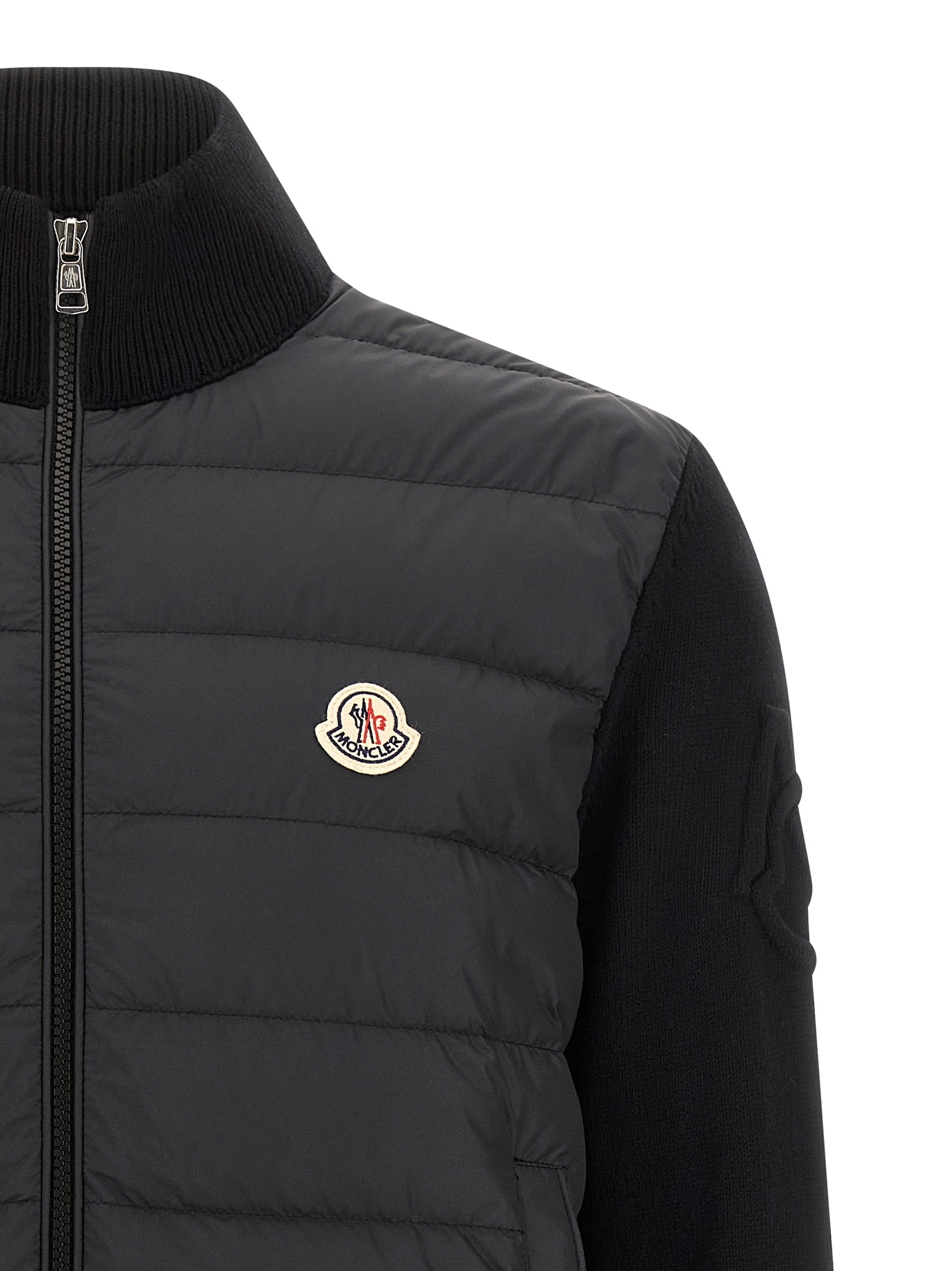 5 fineness cotton cardigan with quilted and padded micro chic front, high neck, felt logo patch and front zip closure, pockets, long cuffed sleeves and embossed logo.