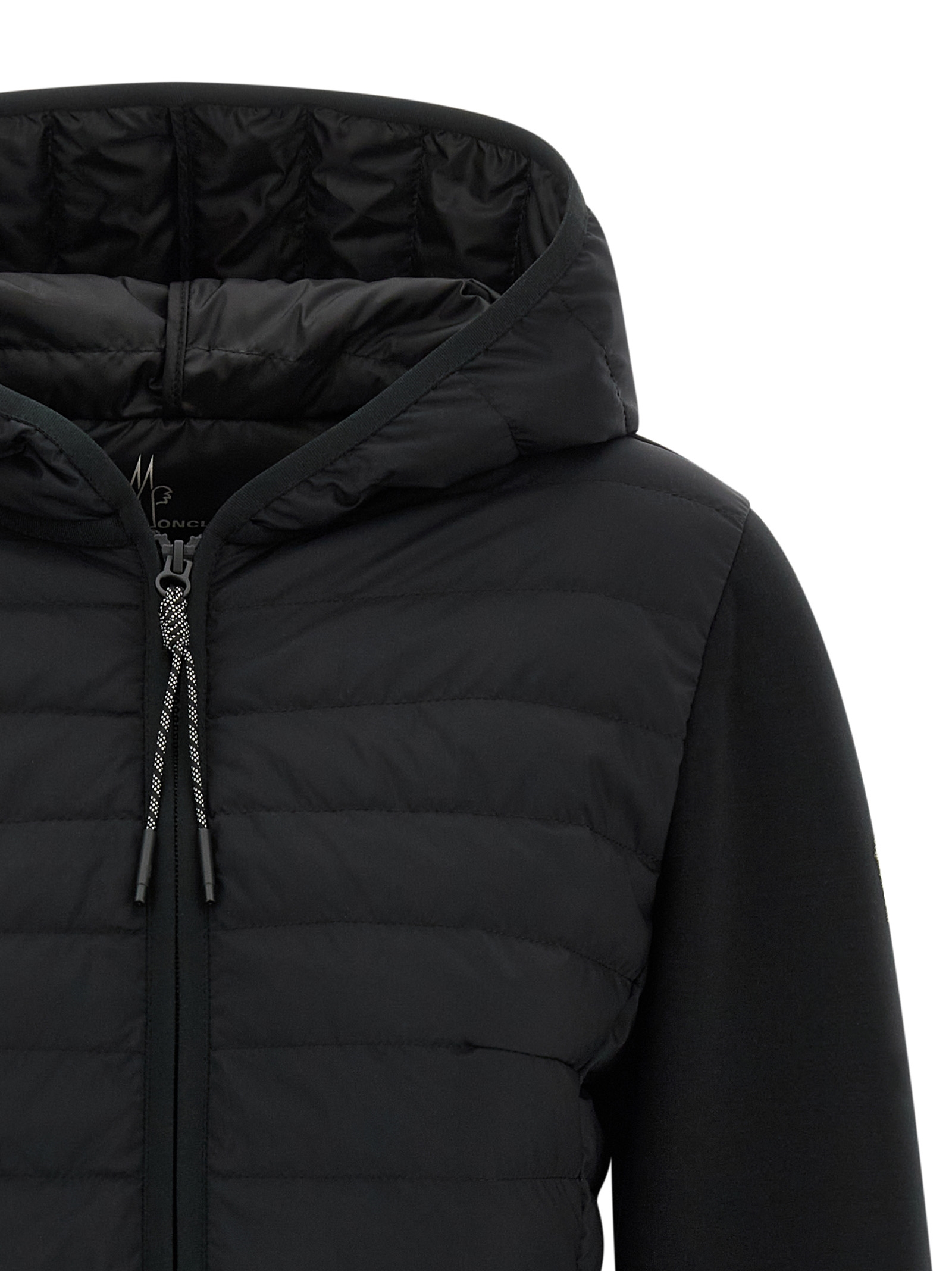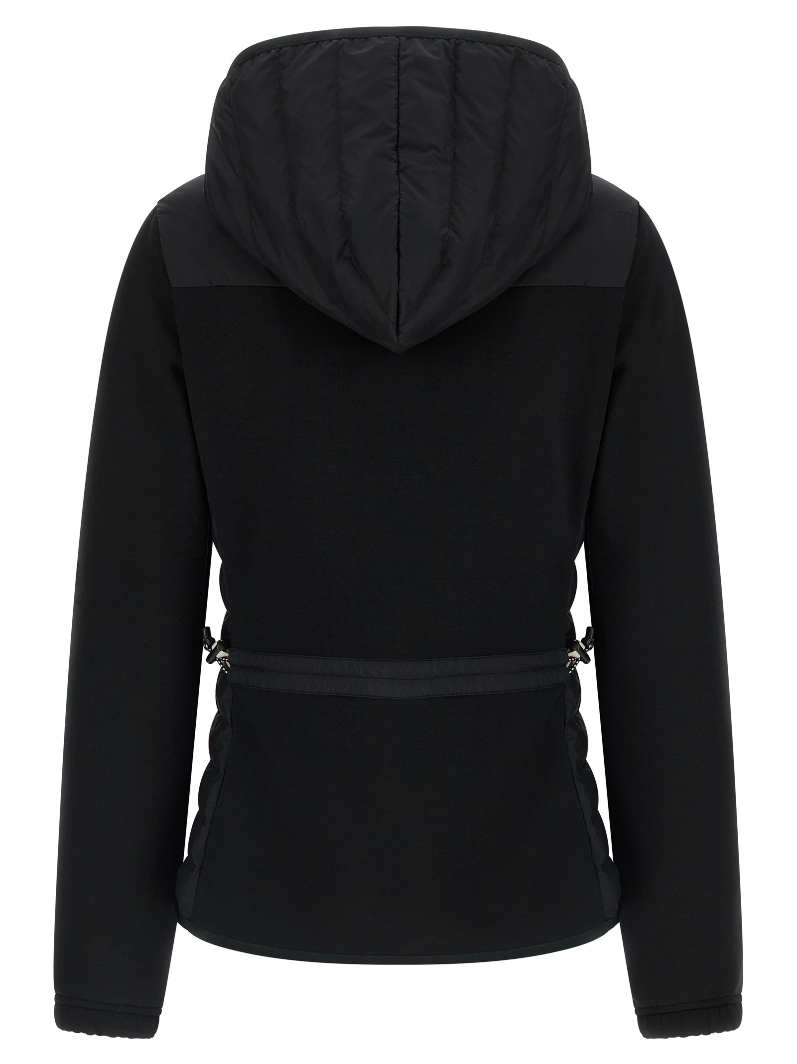 Hoodie in polyester and viscose blend doubled fabric with quilted and slightly padded goose down front saison longue part, front zip closure, pockets, long sleeves with elastic cuffs and logo patch appliqué, and back drawstring at the waist.