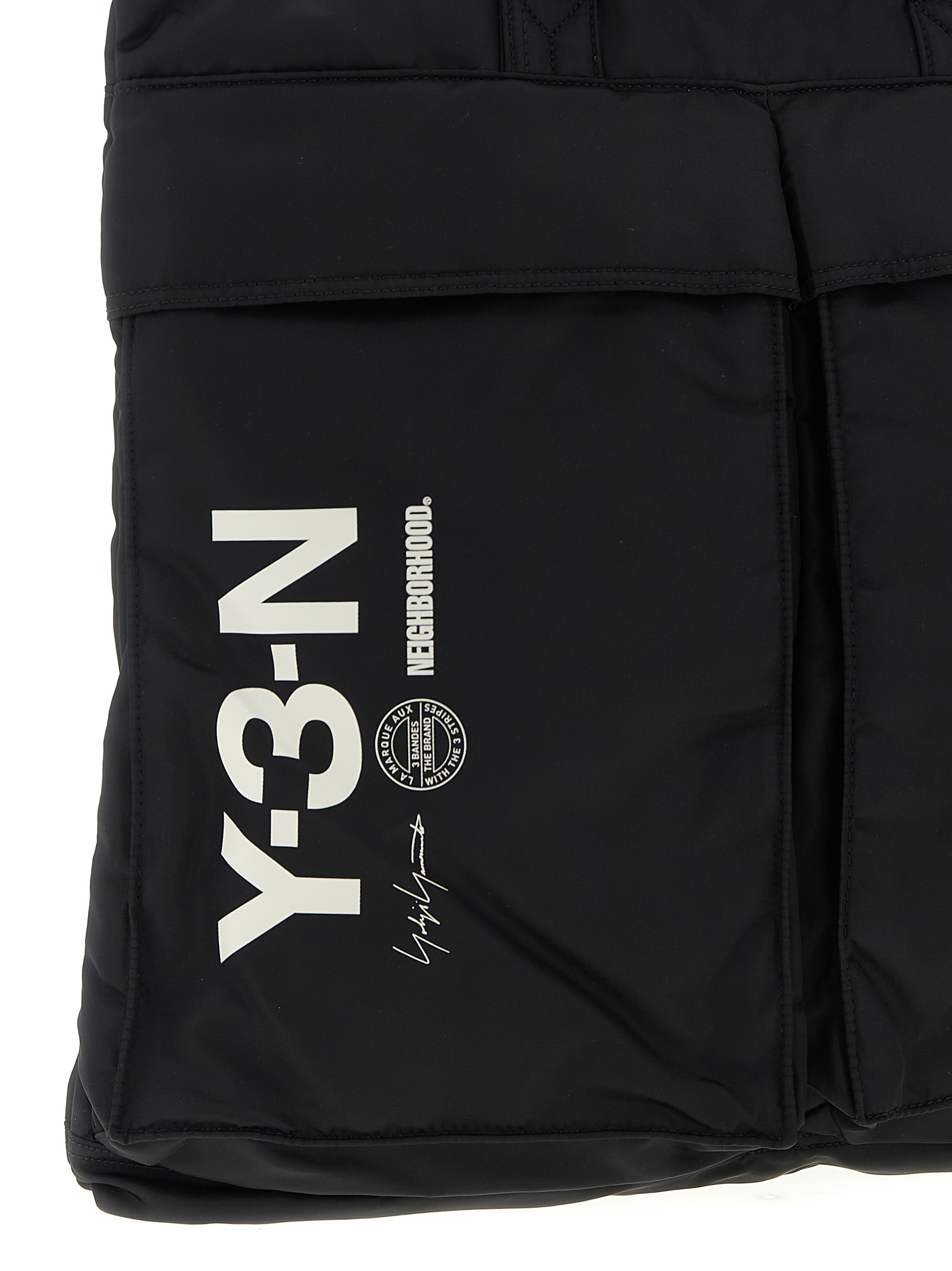 Lightly padded nylon handbag with front ‘NBHD’ print, front pockets, zip closure, fixed handles, adjustable and removable shoulder strap.
