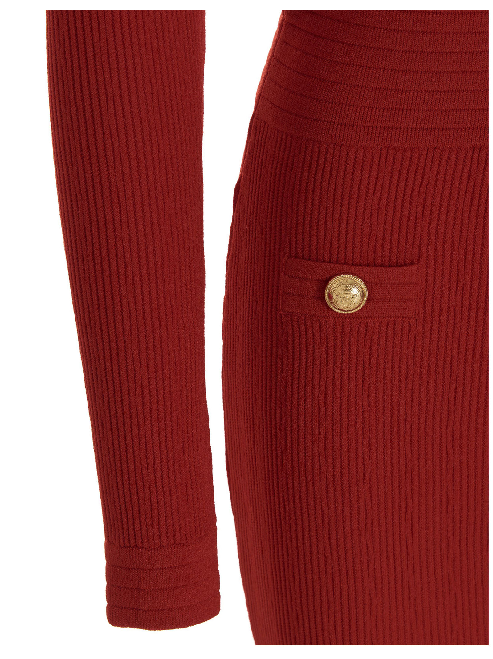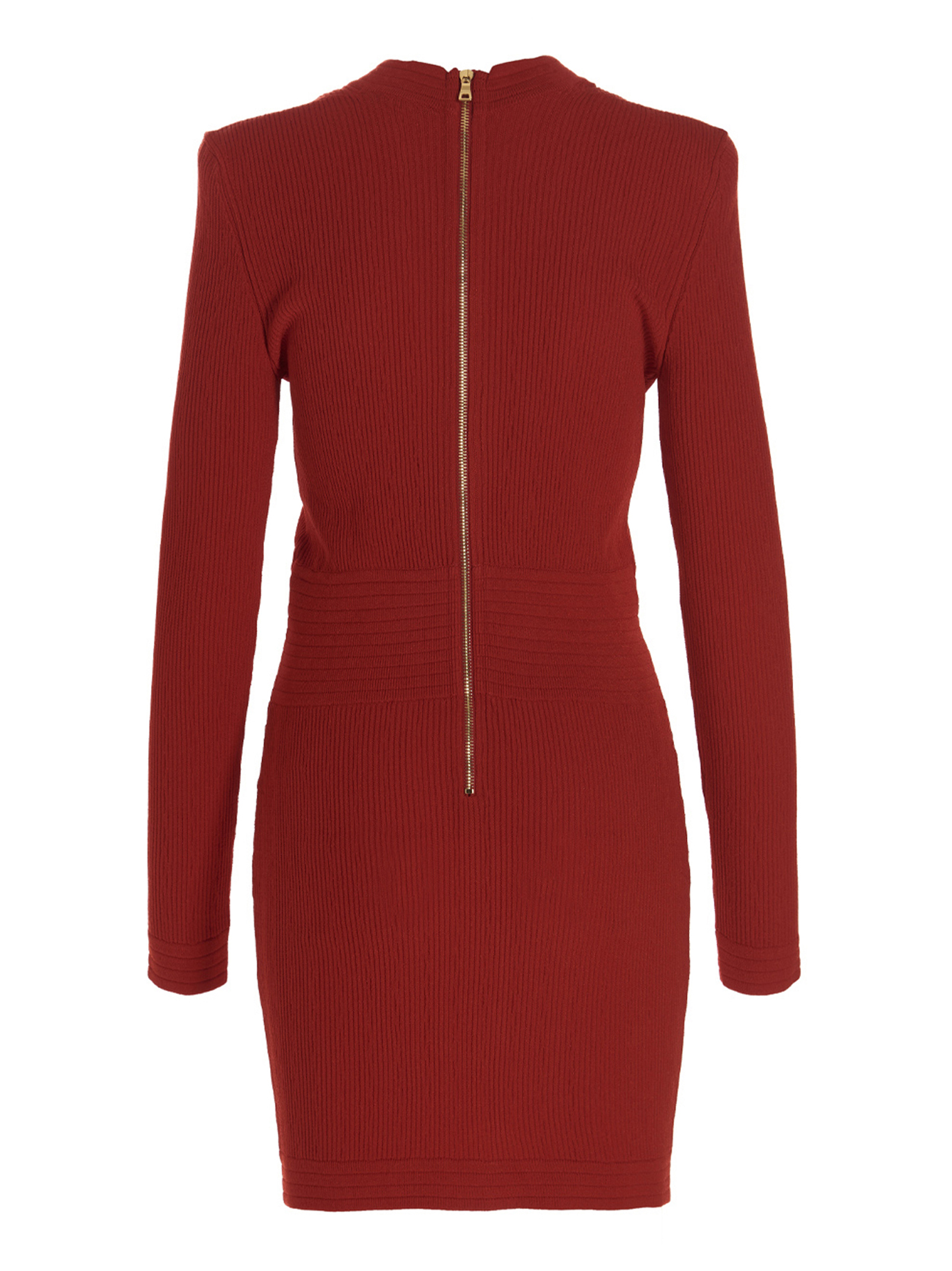 Stretch viscose dress with padded shoulders, a V-neck and gold buttons.