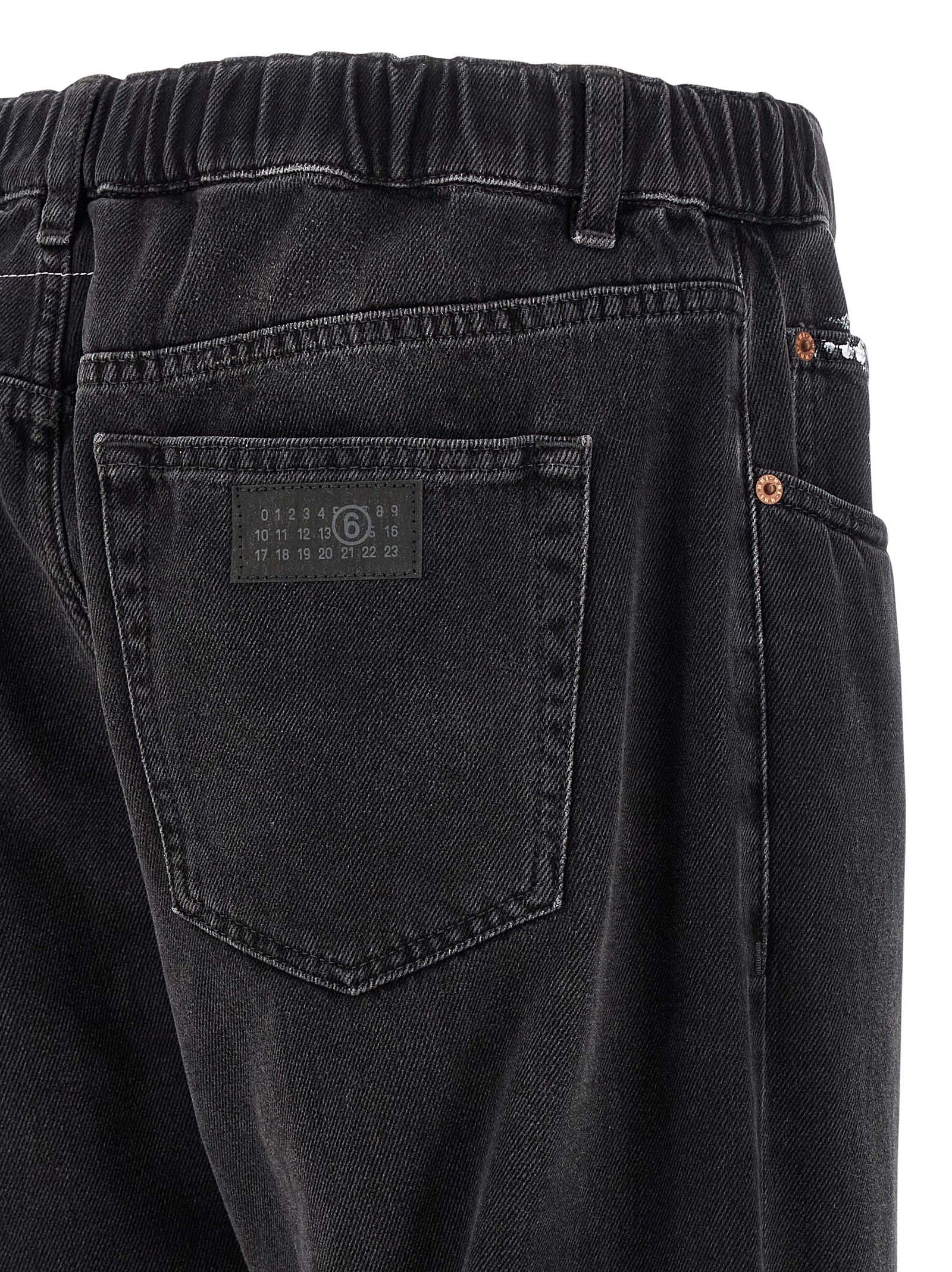 ‘Paint’ cotton denim jeans with elastic waistband, button and zip closure, frayed stain-effect details on the hem, 5 pockets.