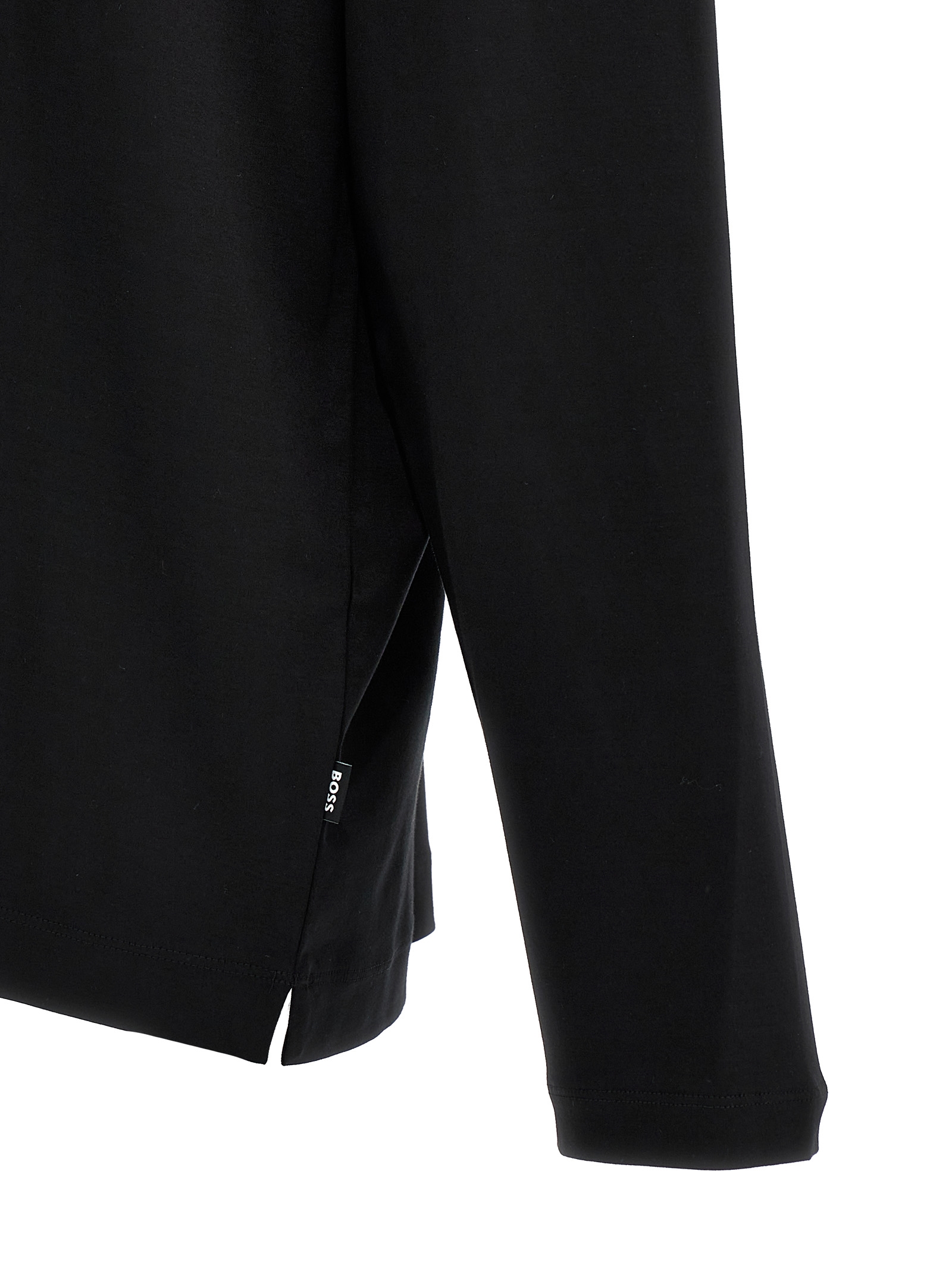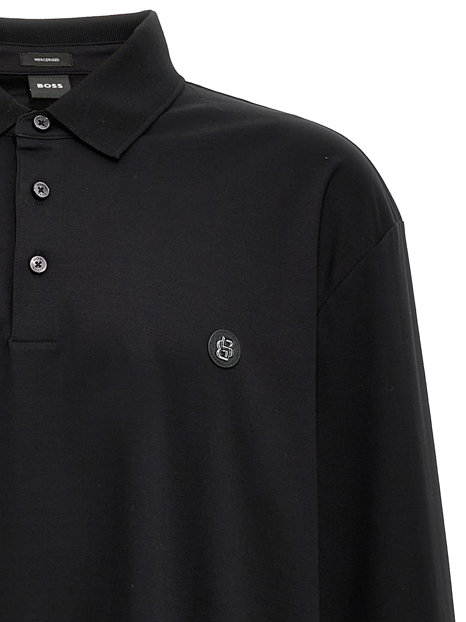 ‘Paley 01’ stretch cotton polo shirt with leather and metal logo appliqué on the front, collar and buttons, long sleeves, side vents.
