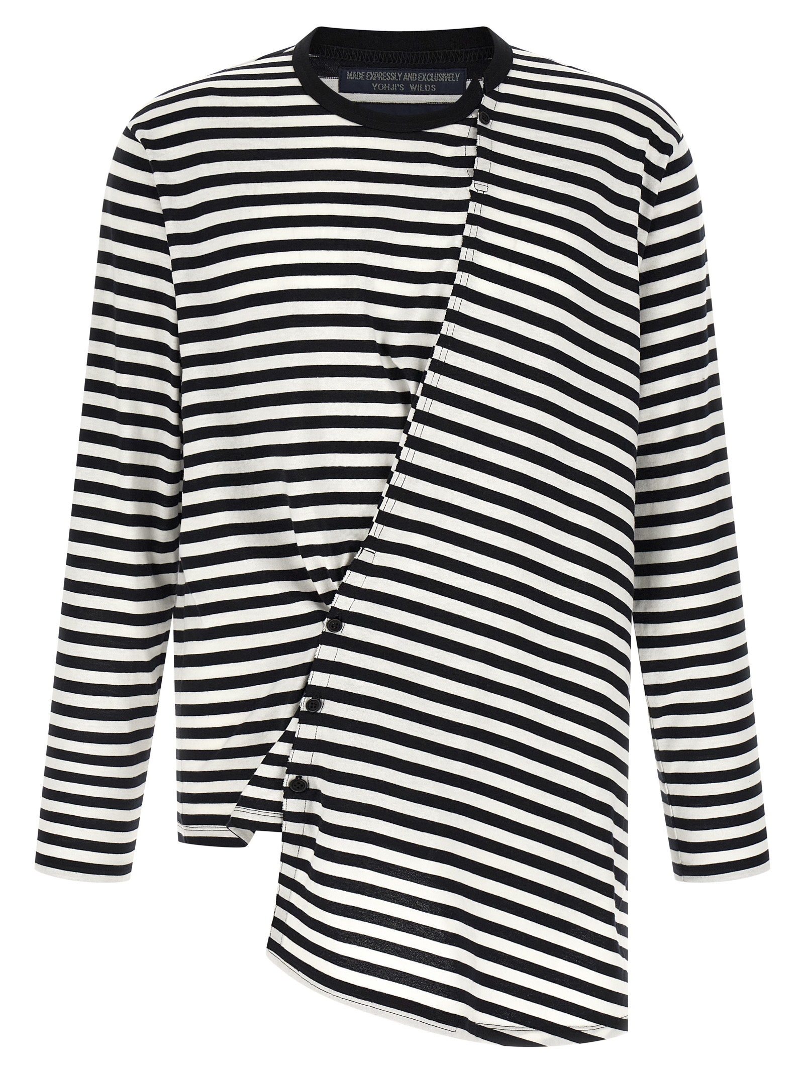 ‘Paneled’ striped cotton jersey sweater, crew neck Loose fit with asymmetric details, panels joined on the front with buttons and buttonholes, dropped shoulders, long sleeves.