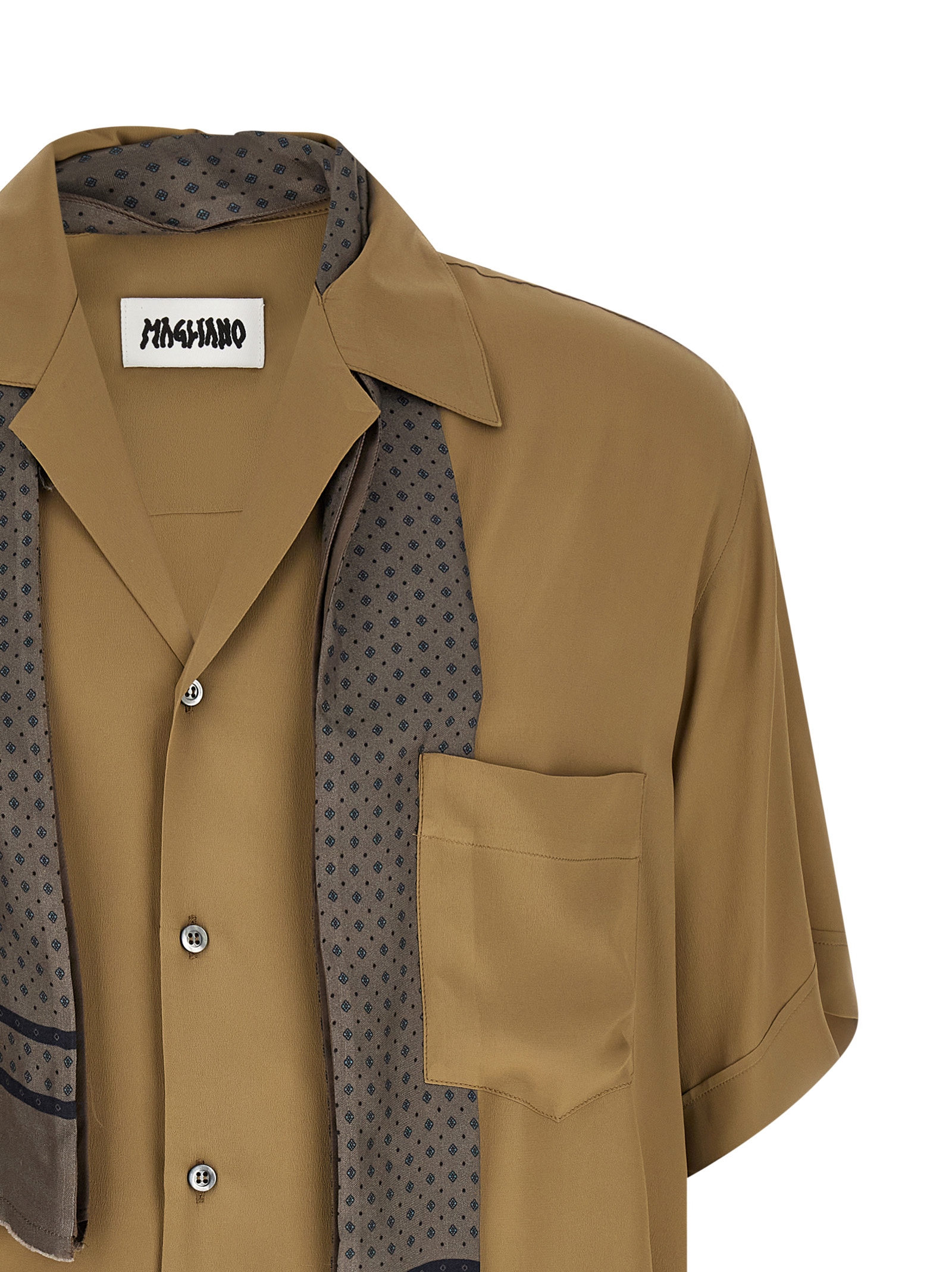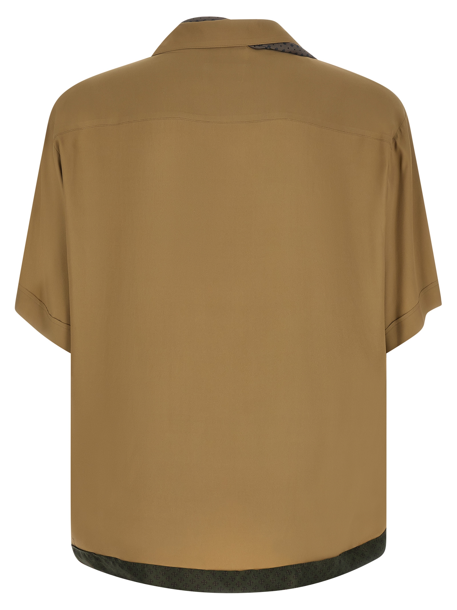 ‘Pasolini’ crêpe bowling shirt with contrast silk Ascot collar inserted and sewn on pockets, front button closure, short sleeves with dropped shoulders, side slits, contrast insert on the hem.