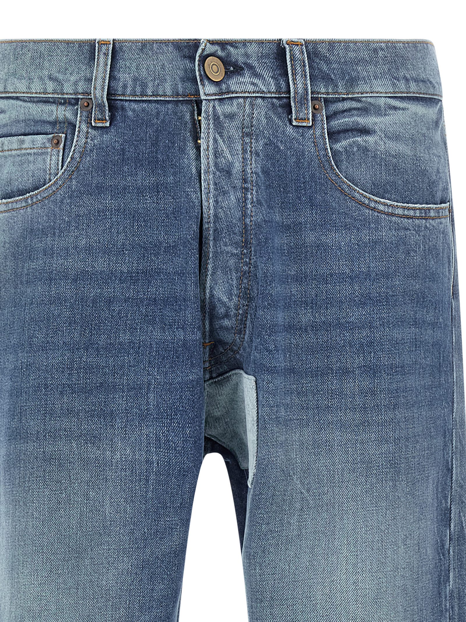 Used-effect discolored cotton denim jeans with front contrast patch, contrast stitching, front button closure, straight leg, five pockets, ‘Four stitches’ and back trompe l’oeil logo tag.