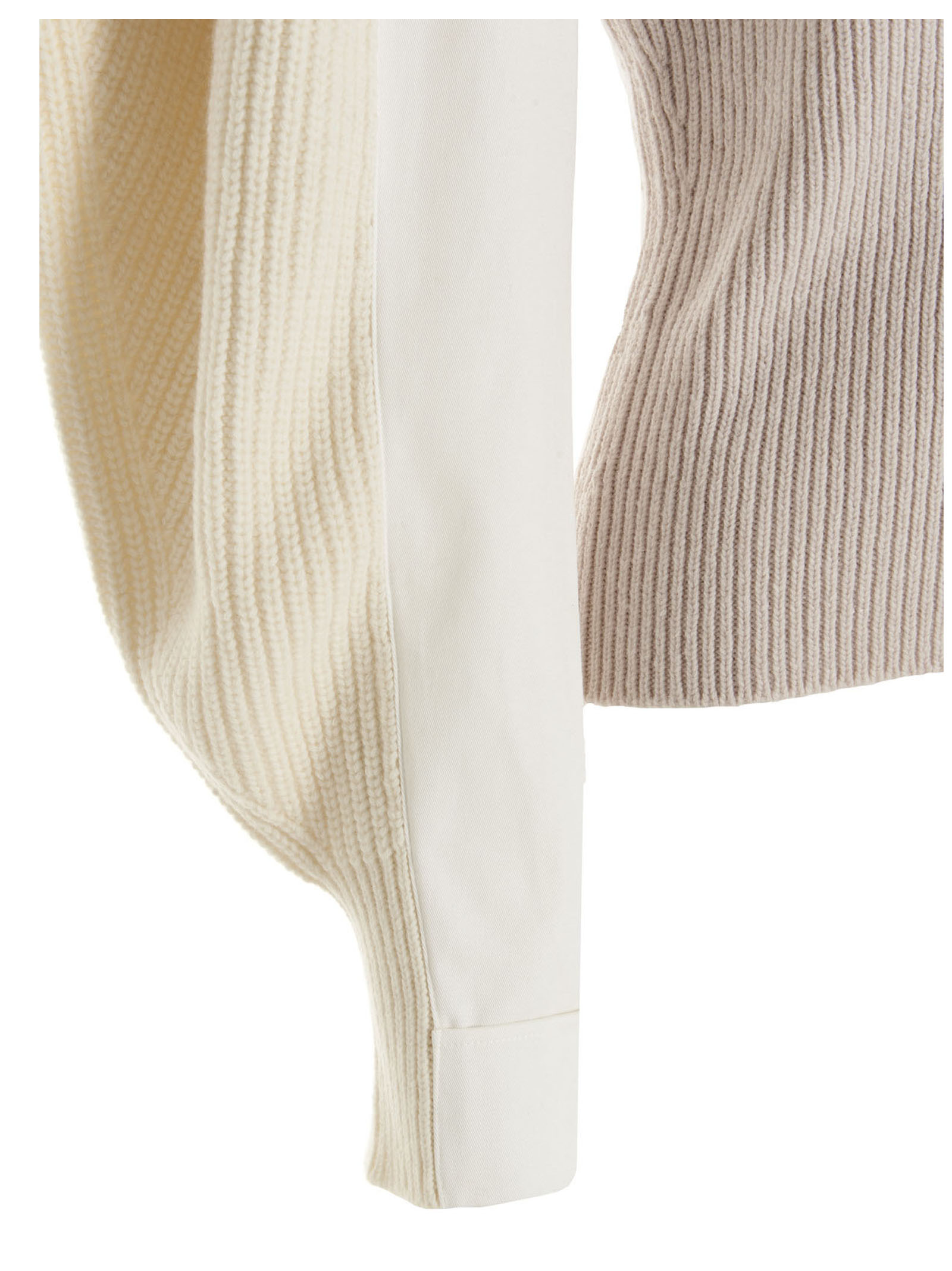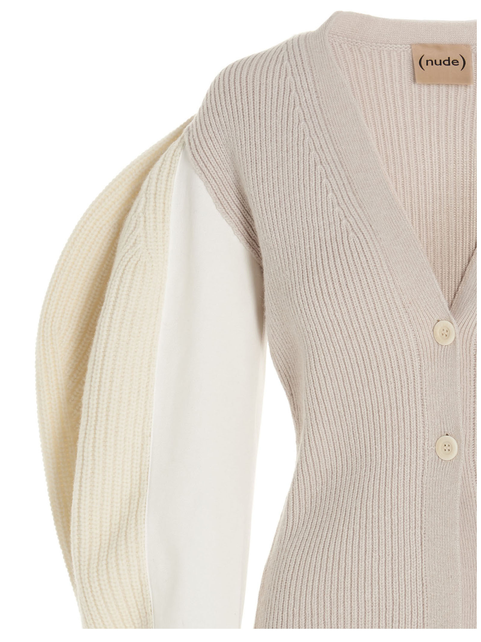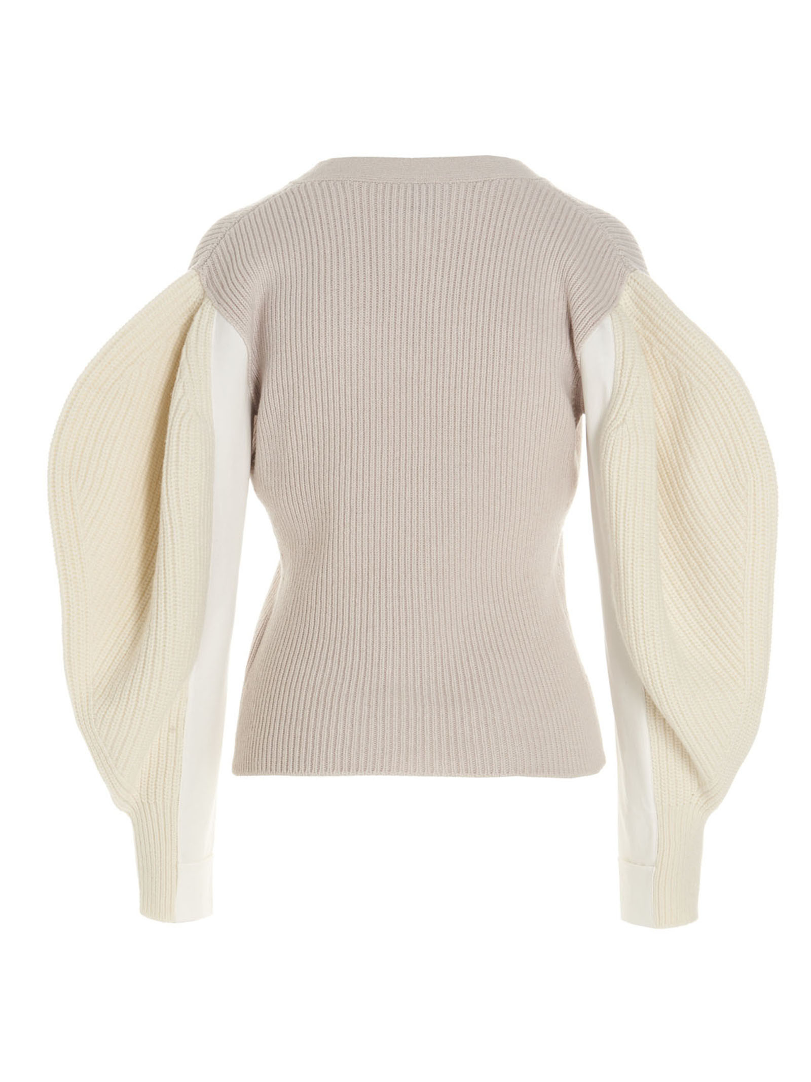 Patchwork wool cardigan with puff sleeves and a V-neck.