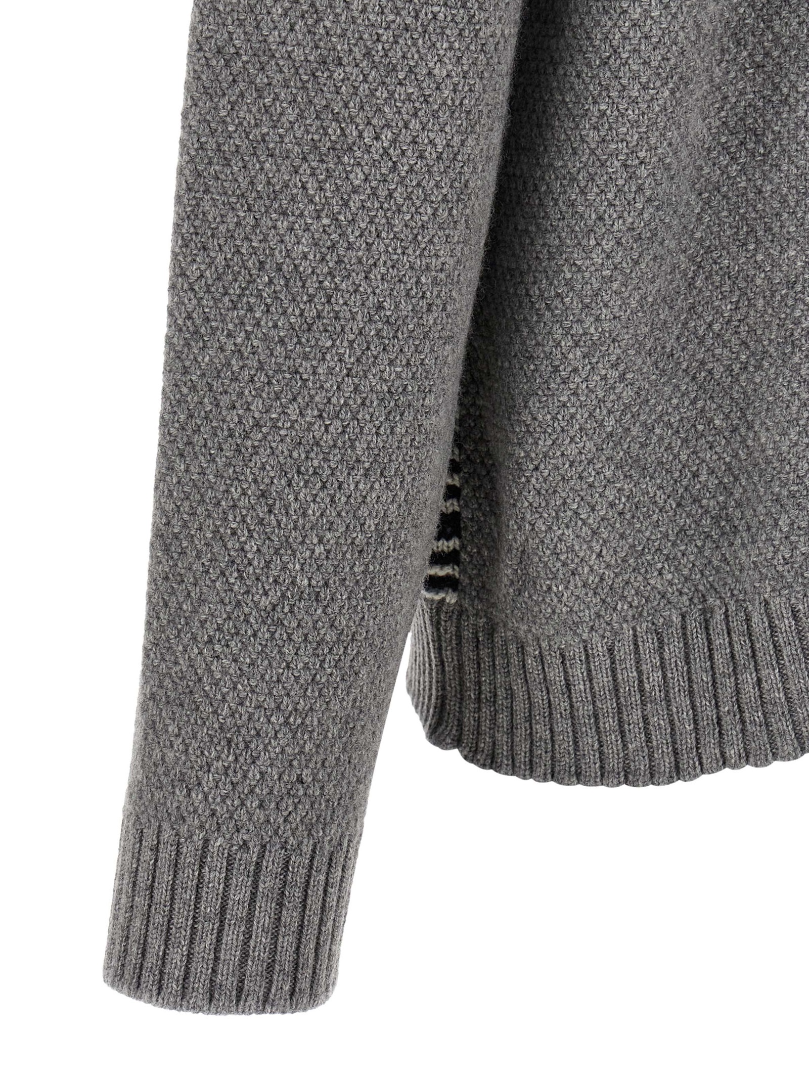 Wool cardigan, patchwork effect inlays, V-neck, front button closure, long cuffed sleeves.