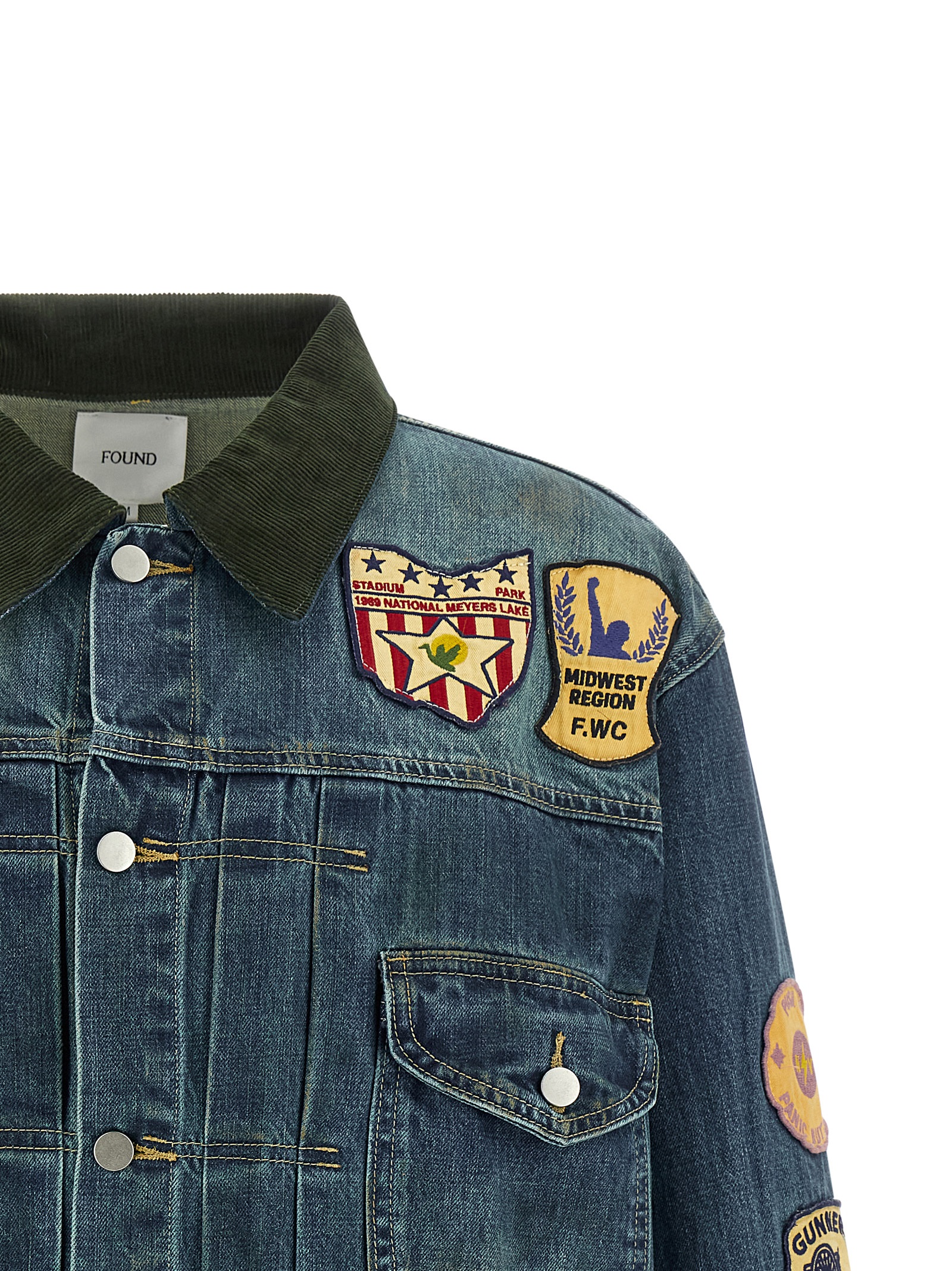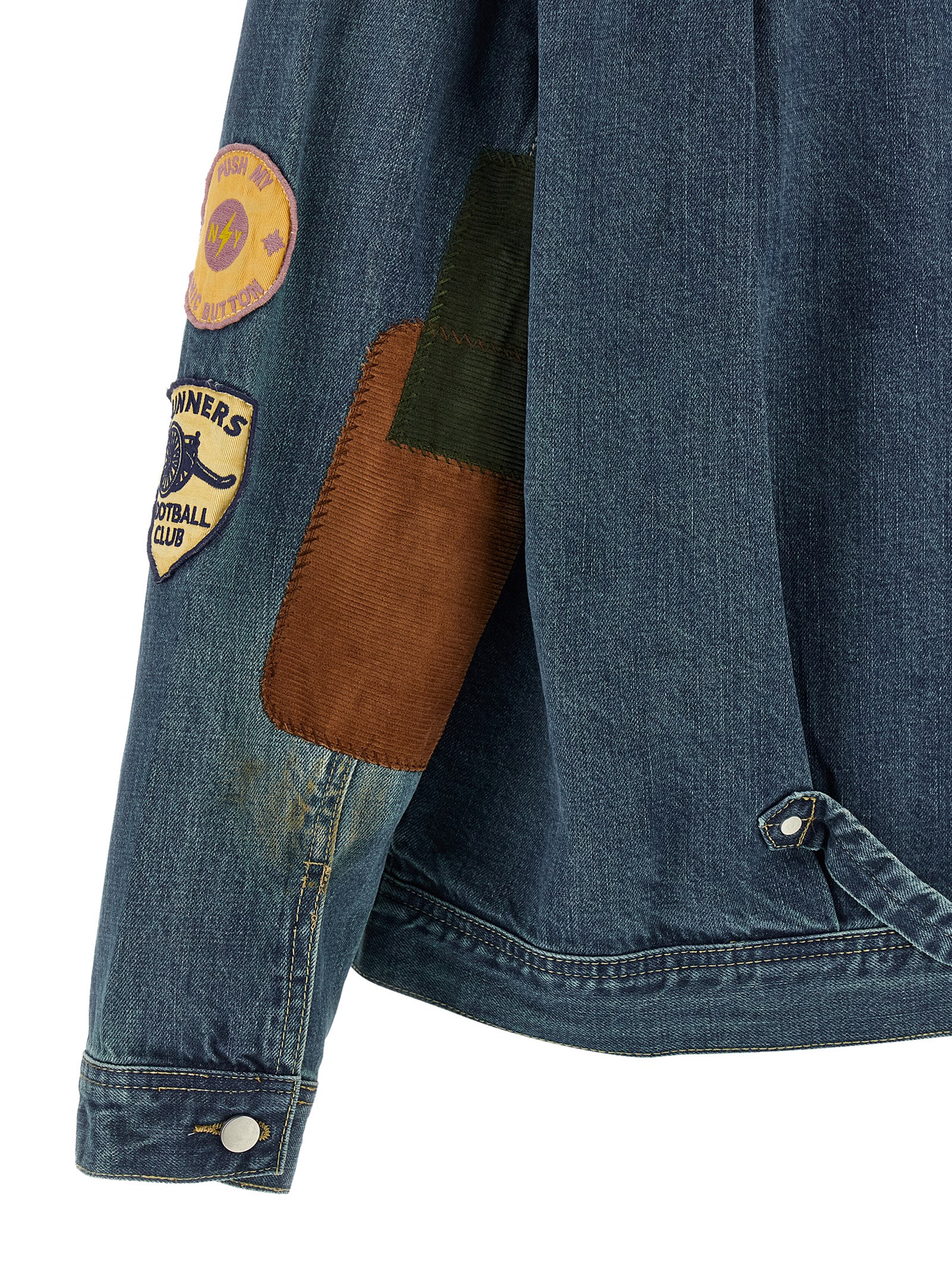 ‘Patchwork’ vintage-effect stone washed cotton denim jacket, contrast stitching, front and sleeve patches, contrast corduroy shirt collar, front metal button closure, breast pocket, long cuffed sleeves, dropped shoulder and corduroy patch on the elbow, adjustable back clamp and strap, unlined.