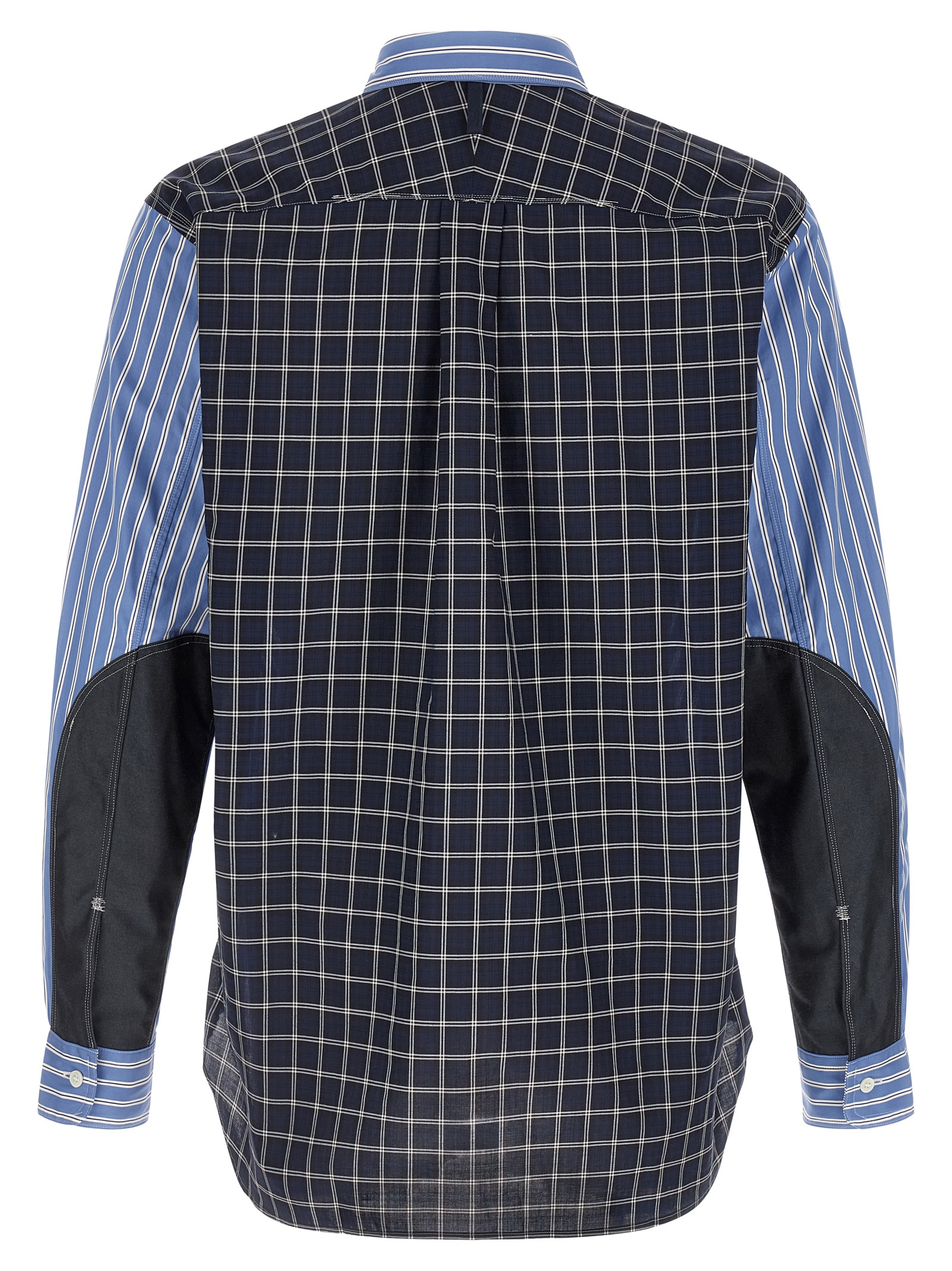 Patterned cotton poplin shirt, patchwork construction, breast pocket, front mother-of-pearl button closure, long sleeves with contrast cuffs and patch, back rack with cannon pleats, rounded hem.