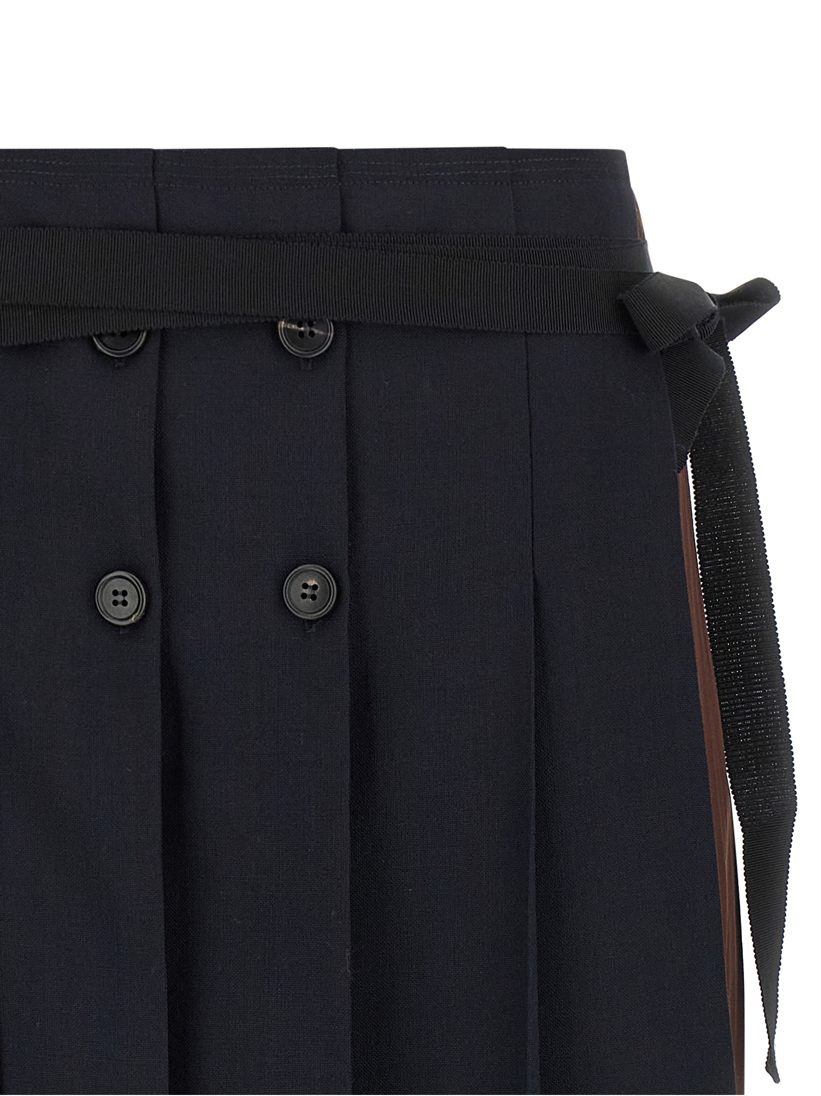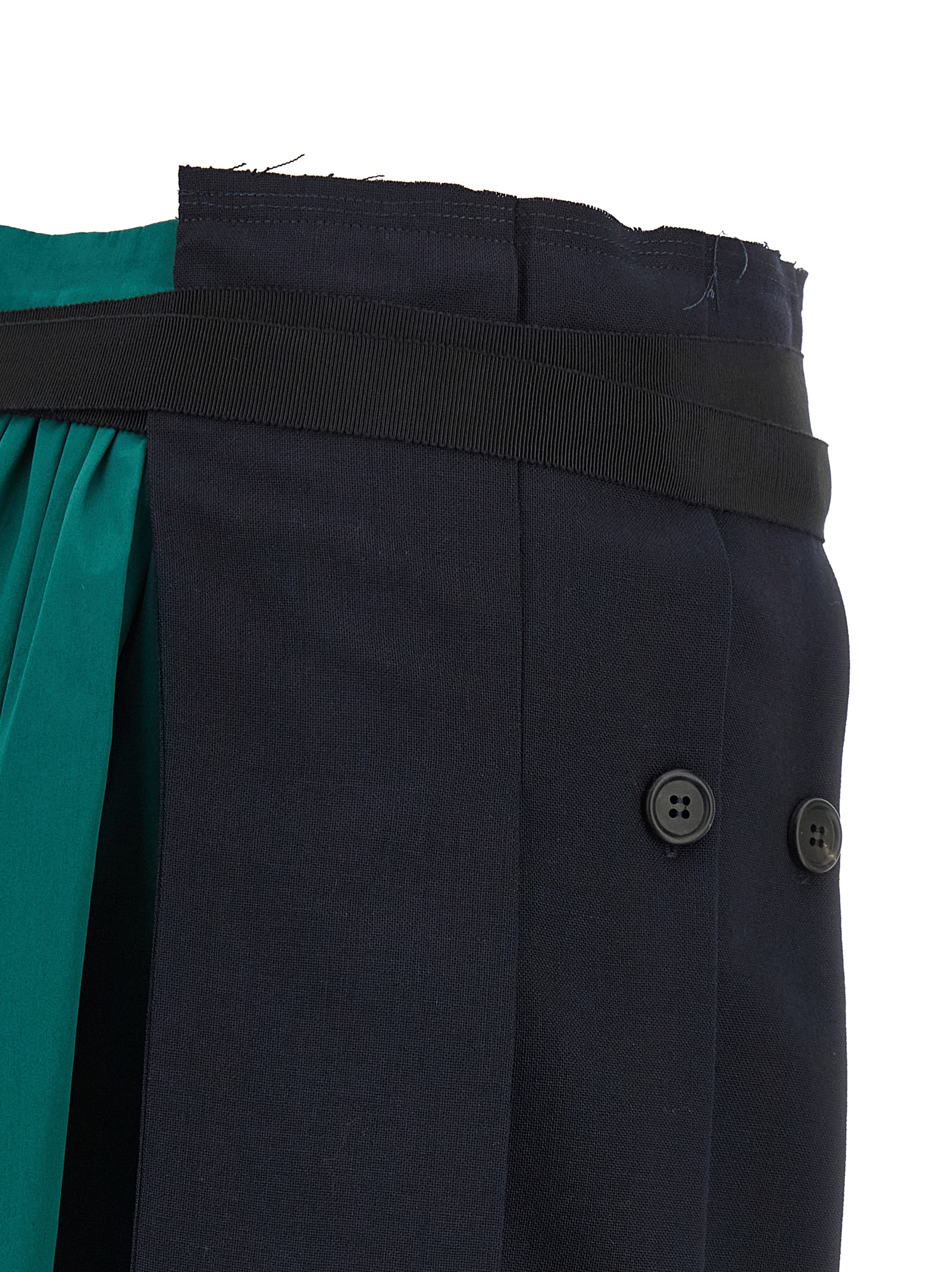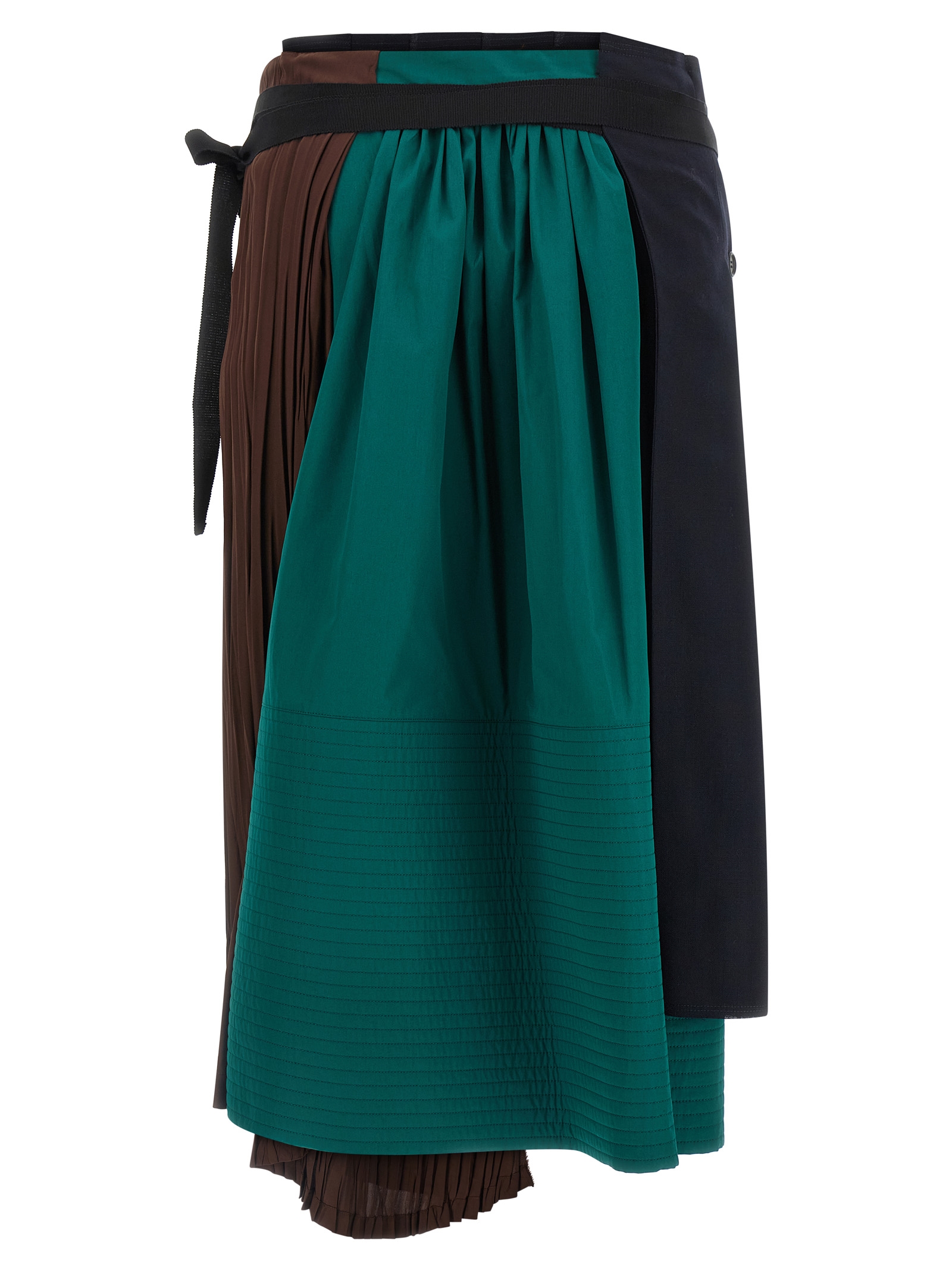 Midi skirt made of panels of different fabrics, patchwork construction with draping and pleats, asymmetrical silhouette, wallet model with button closure and grosgrain ribbon.