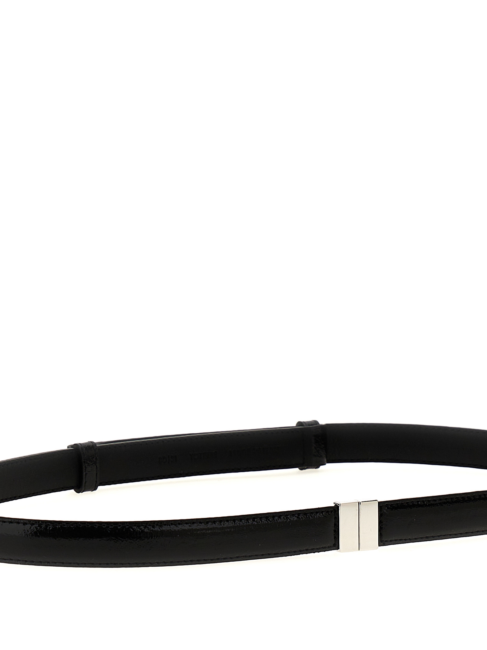 Shiny patent leather belt with silver metal sliding closure.