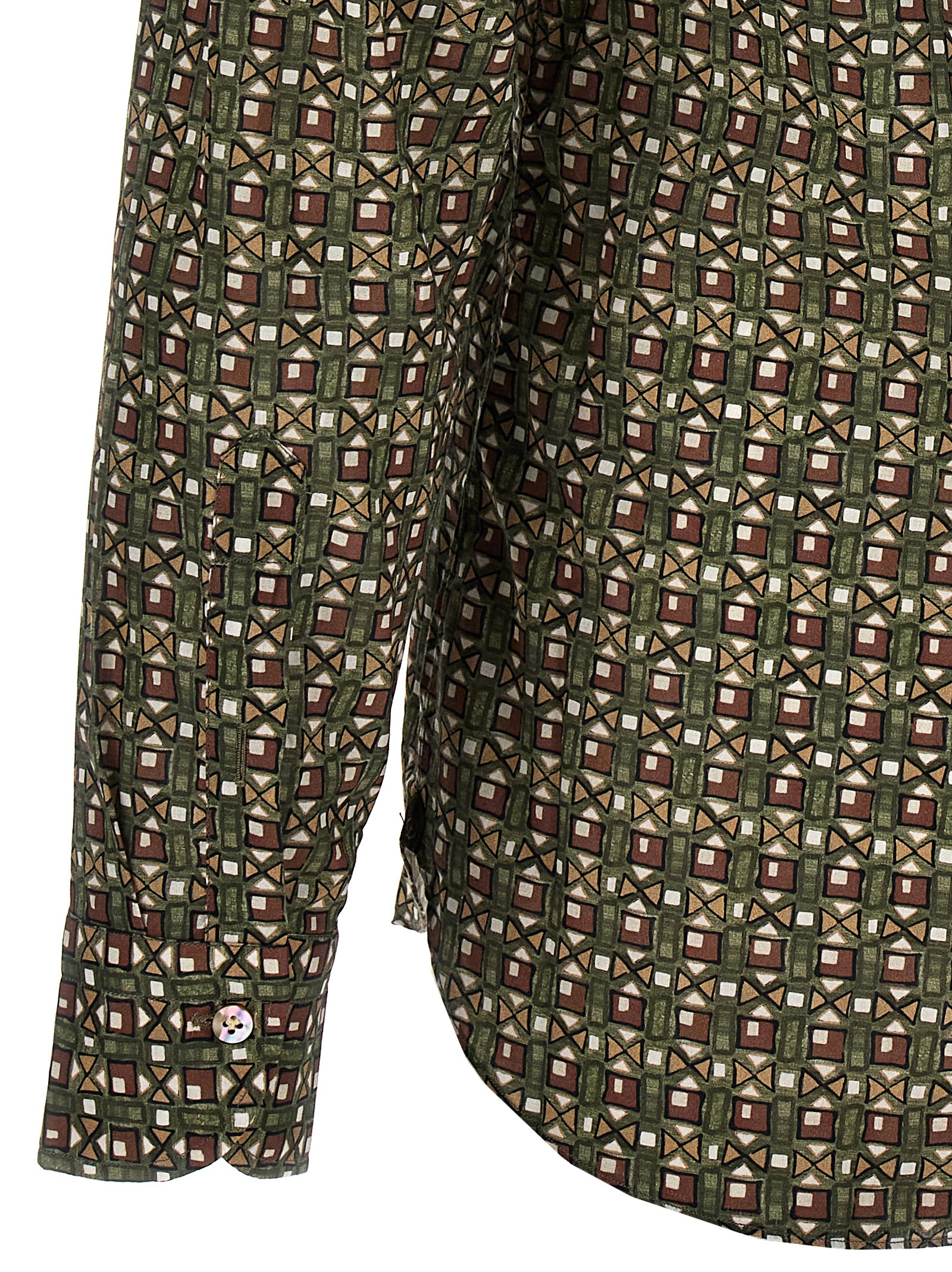 Patterned print cotton shirt with button closure, long cuffed sleeves.