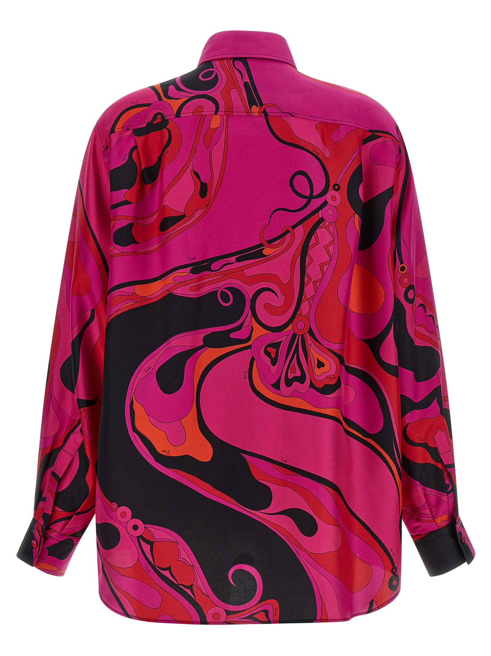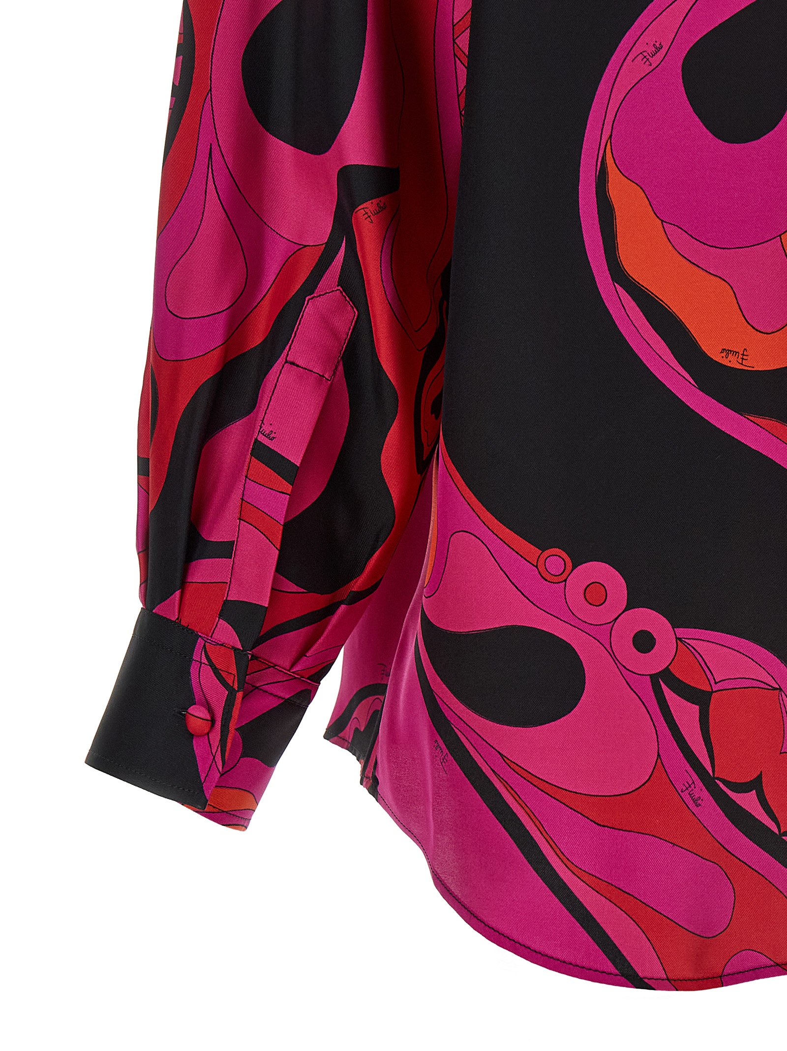 Patterned silk twill shirt, pointed collar, chest pocket, front button closure, long sleeves with cuffs and dropped shoulder, rounded and asymmetrical hem.