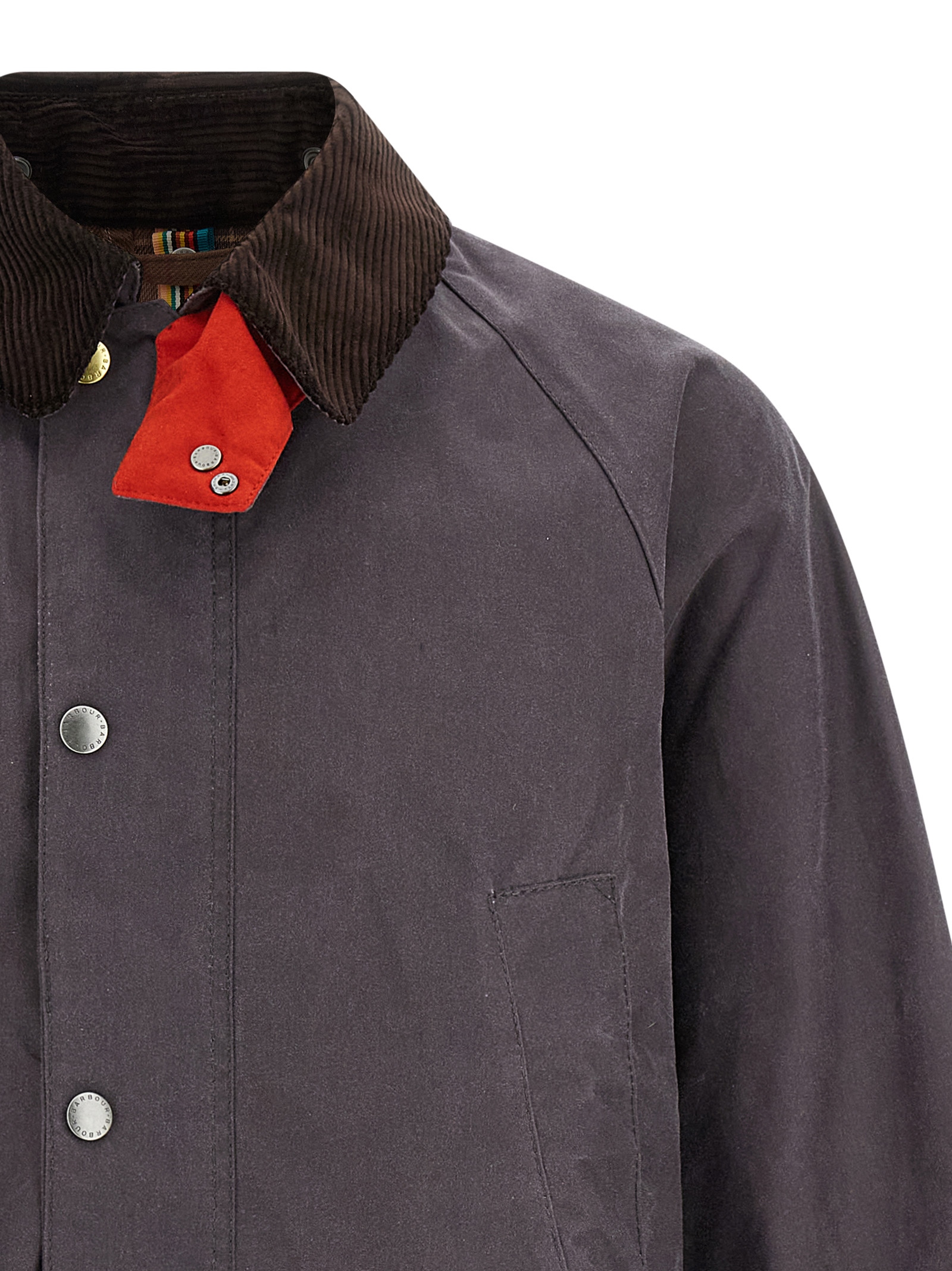 Paul Smith Loves Barbour ‘Bedale®’ Thornproof waxed cotton jacket with an average weight of 170 gr with contrast details, cotton lining with Classic Barbour tartan pattern and Friesian cow print, corduroy collar with contrast velvet chinstrap, zip closure and front snap buttons, pockets, long sleeves, gussets with snap buttons and rear air vents, Nylon waterproof inner band.