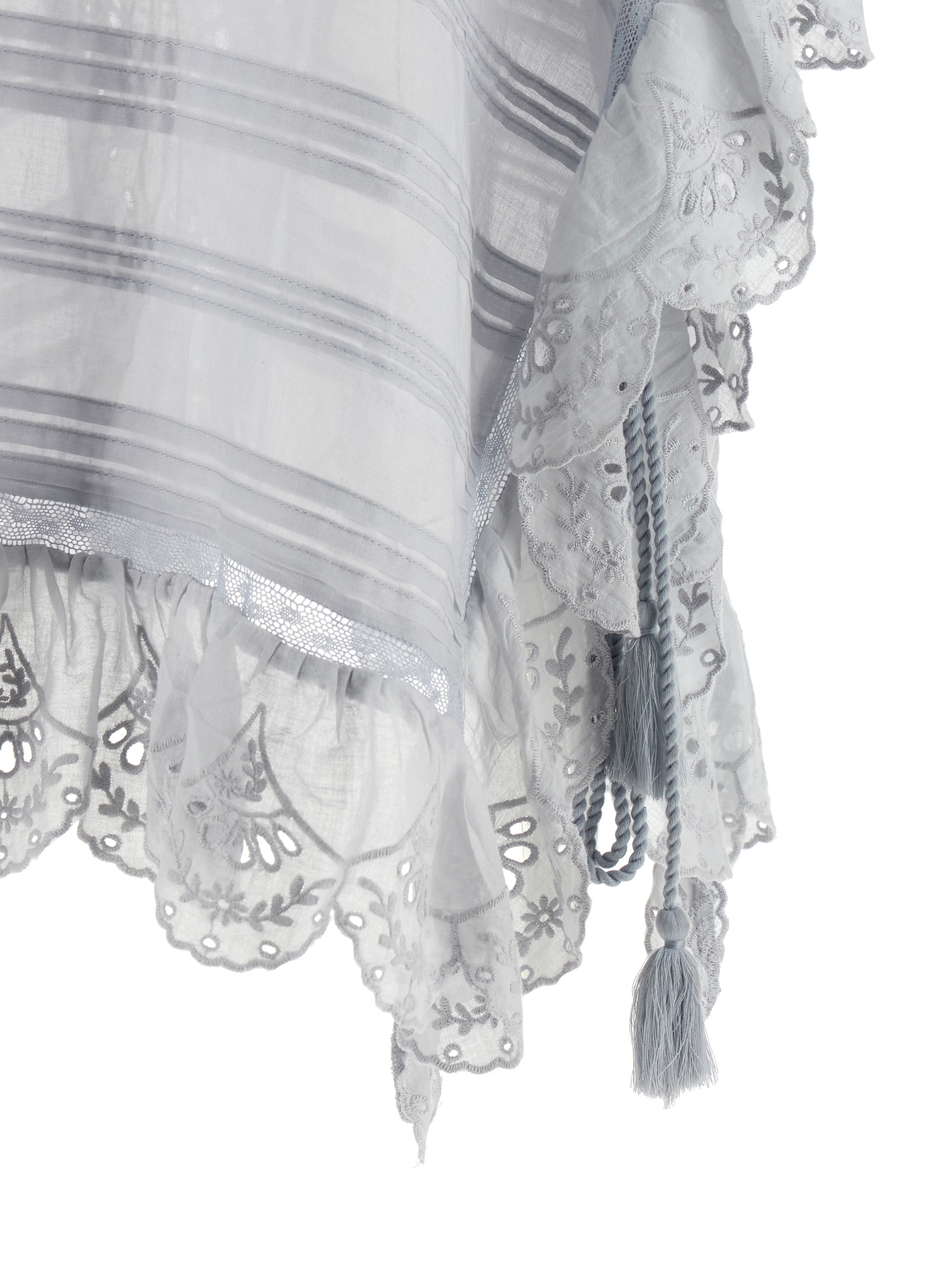 ‘Payton’ sangallo cotton top with tone-on-tone floral lace insert, ruffles at the edges, round neckline with tie-up cord, wide short sleeves, side lanyards with tassels to tie, asymmetrical hem.