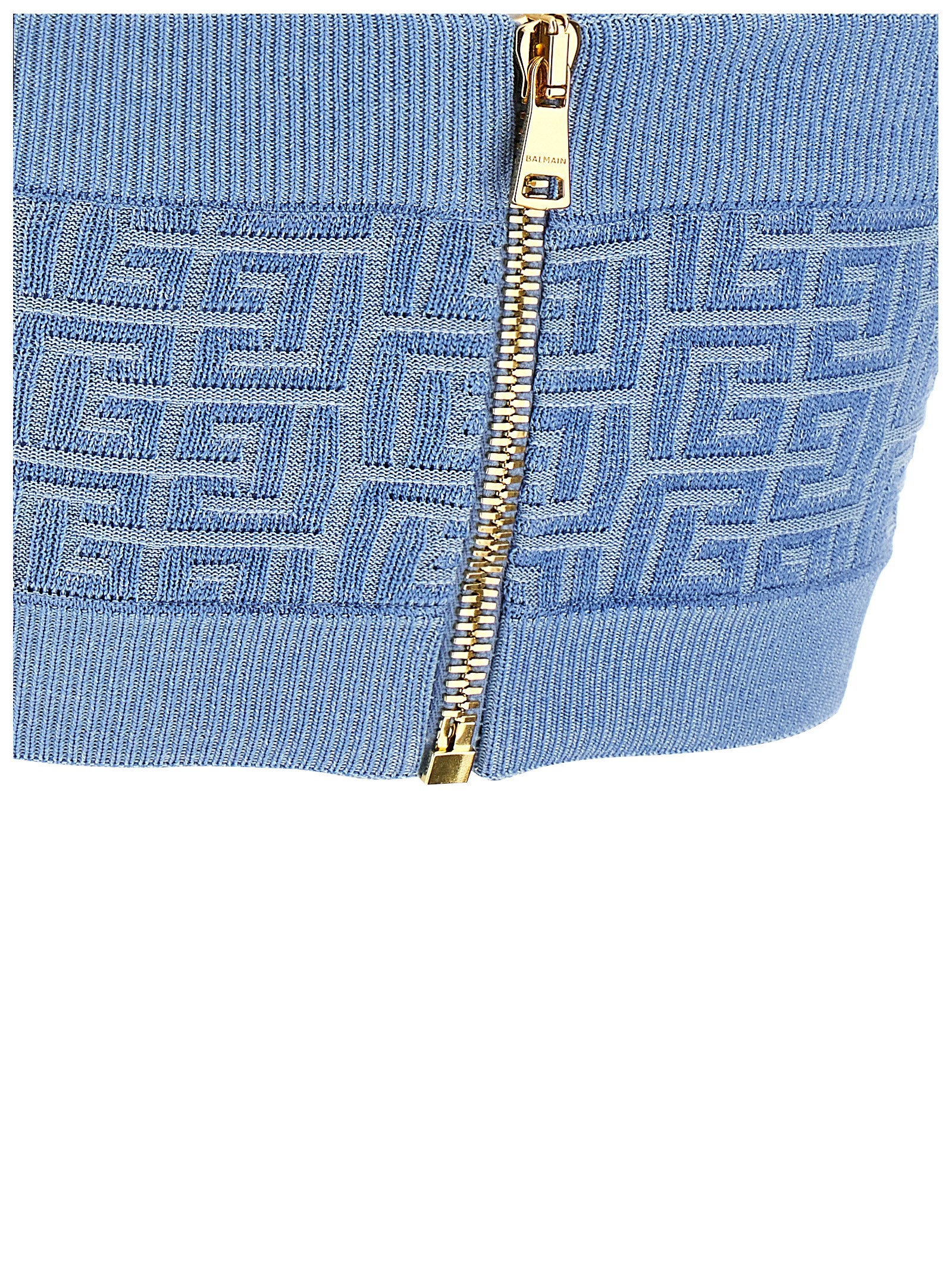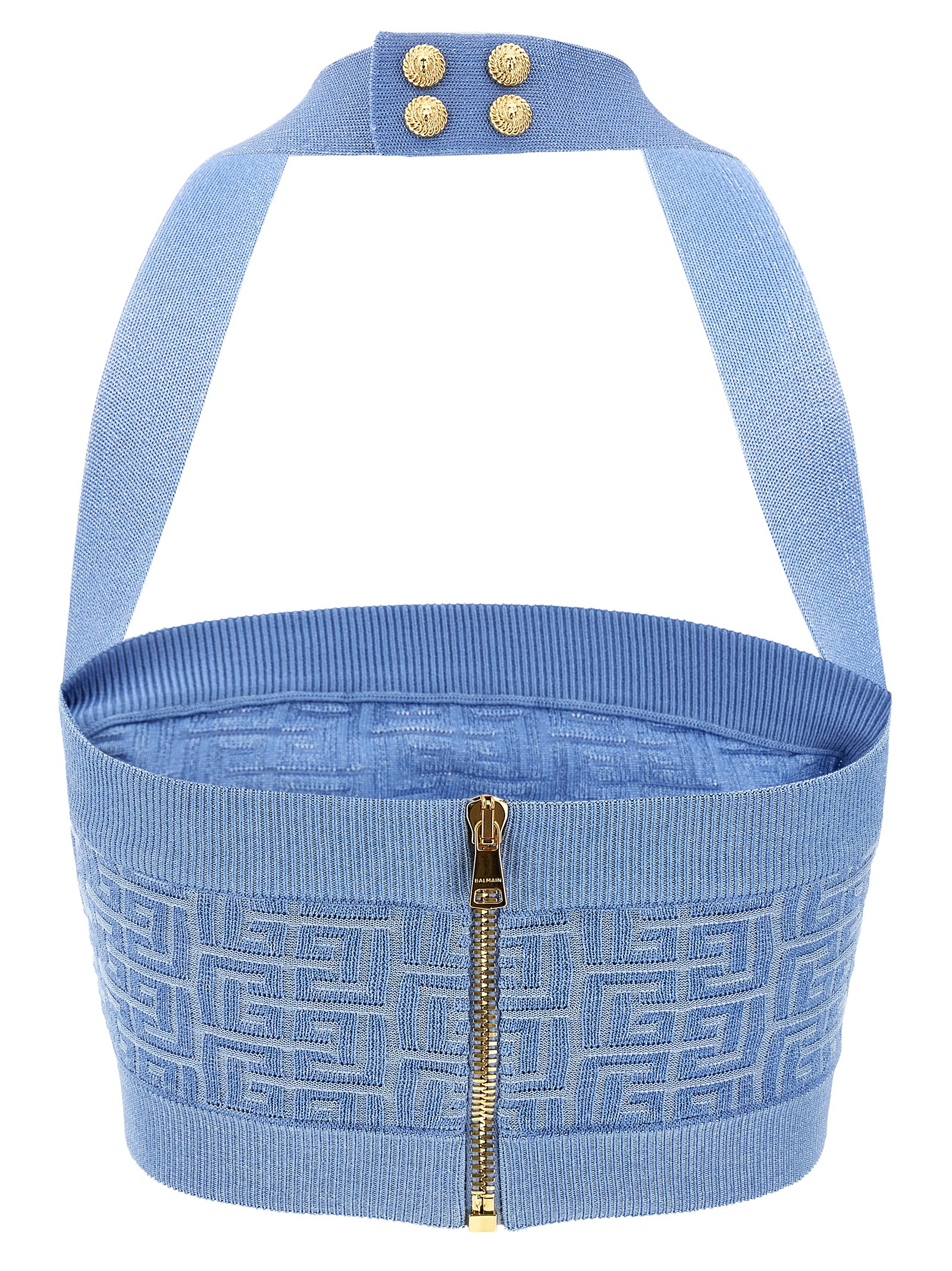 Shiny knit top with labyrinth PB monogram pattern, snap button closure on the neck, back zip closure, crop style.