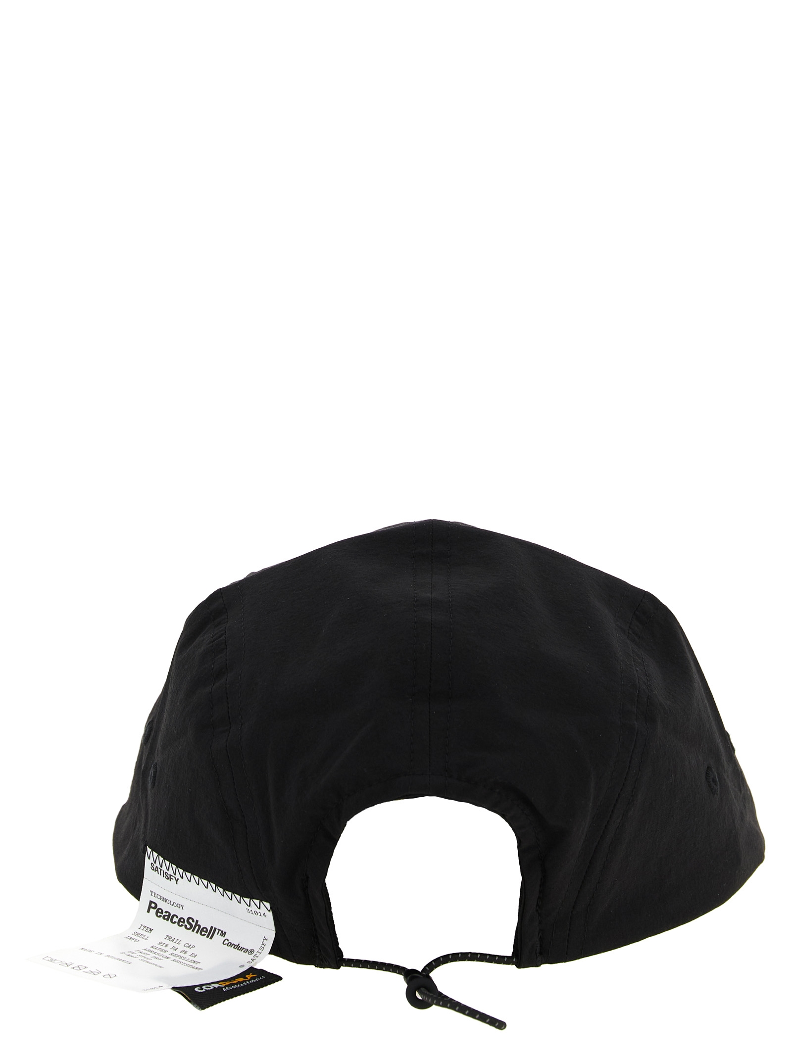 Lightweight, abrasion-resistant and water-repellent Peaceshell™ Cordura® stretch nylon cap, short visor, reflective ‘©SATISFY’ logo print on the front, back drawstring, completely detachable washing instruction label on the outside.