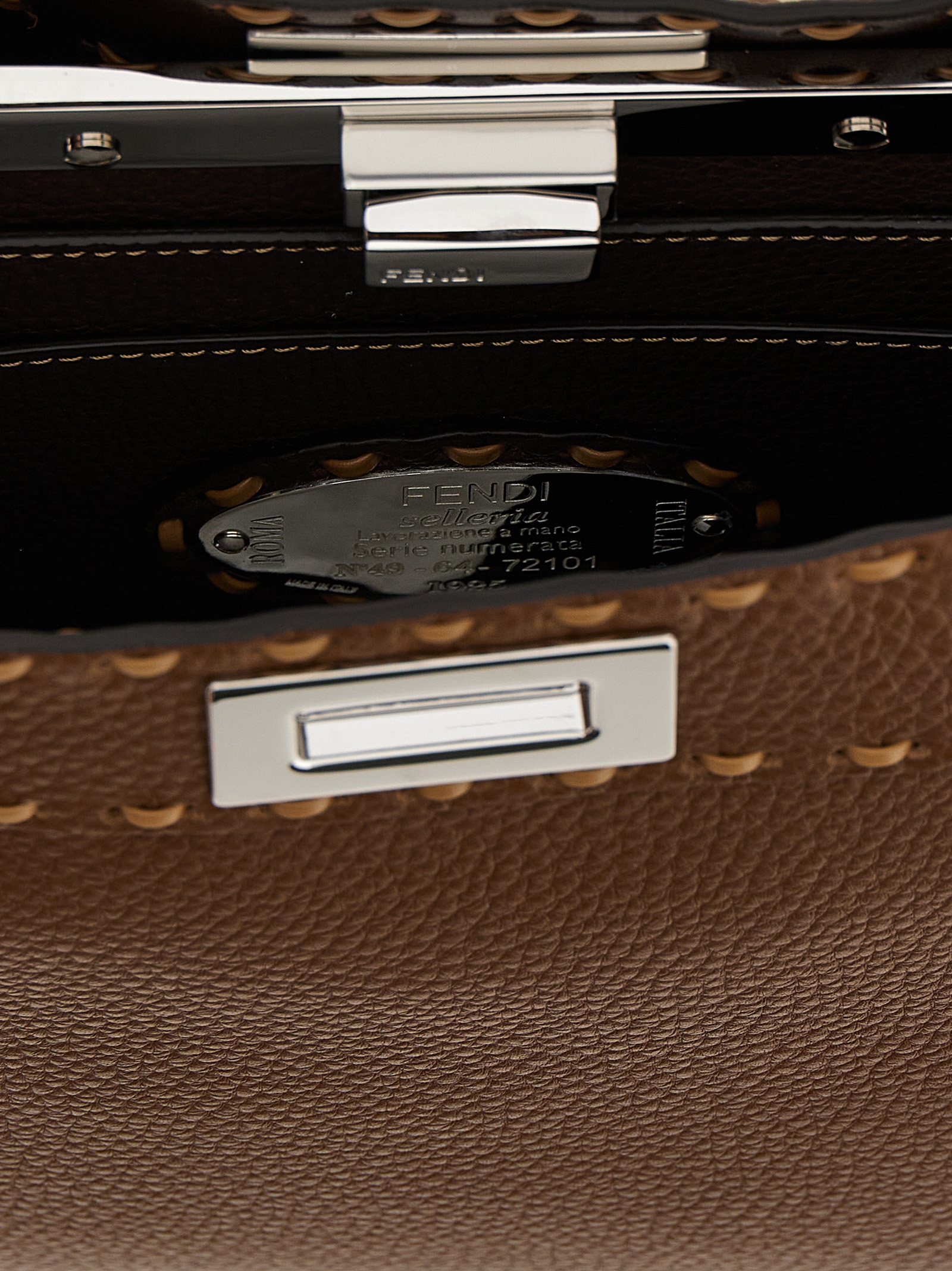 ‘Peekaboo ISeeU Small’ natural grain Romano leather handbag with 556 tone-on-tone macro stitching, iconic twist closure on both sides, fixed handle, adjustable and removable shoulder strap.