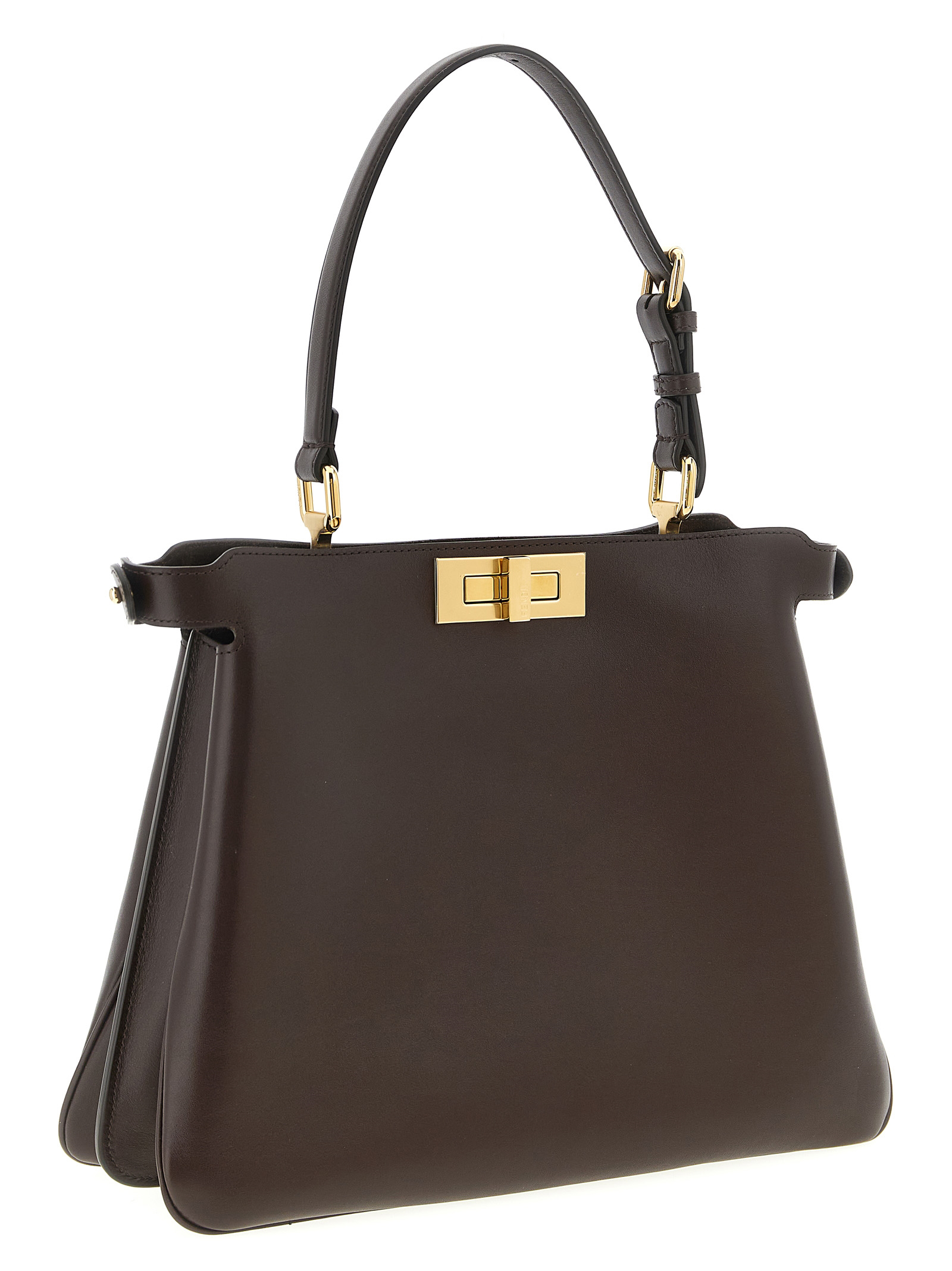 ‘Peekaboo Soft Medium’ smooth calf leather handbag with ‘FF’ jacquard interior, iconic metal turn lock on both sides, adjustable handle, adjustable and removable shoulder strap.
