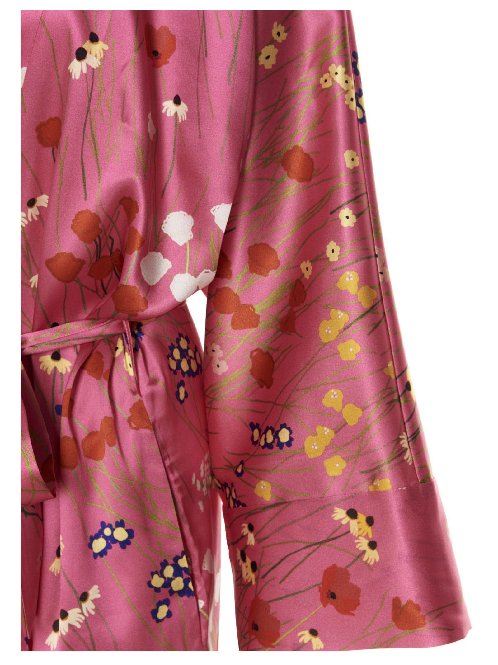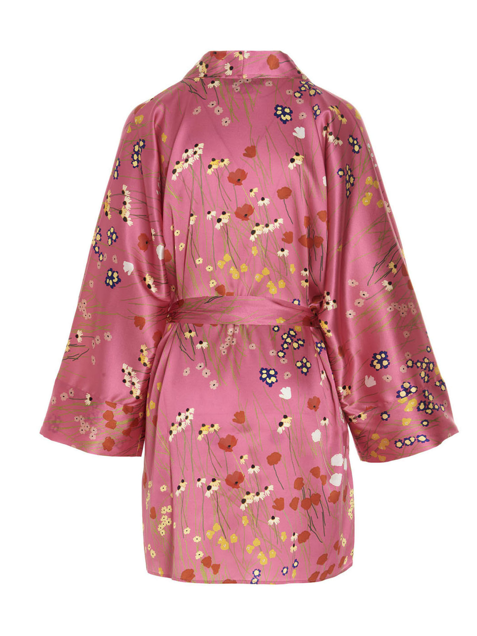 Peignoir’ silk wrap-style dress featuring an adjustable belt at the waist and an all-over logo print.
