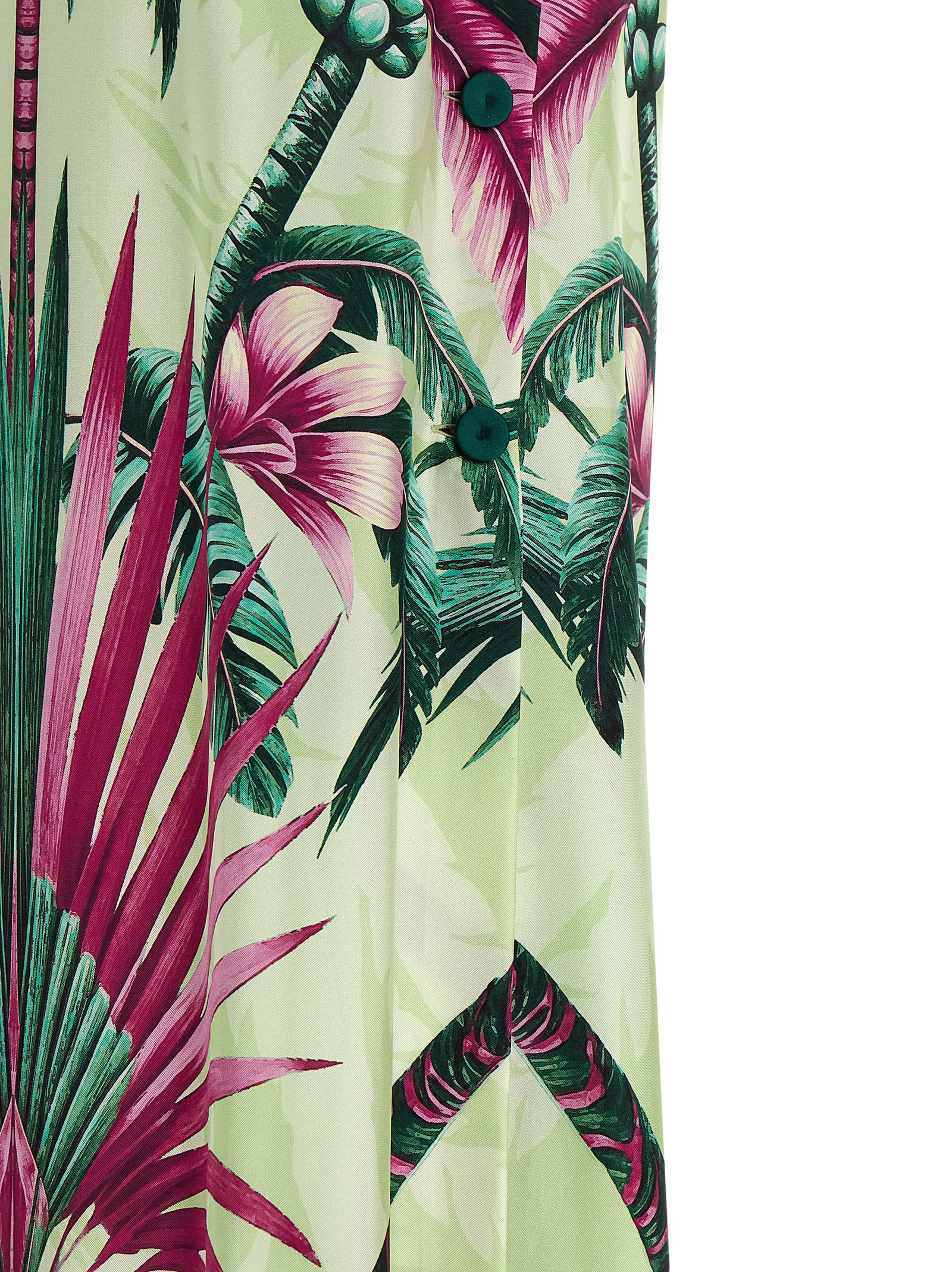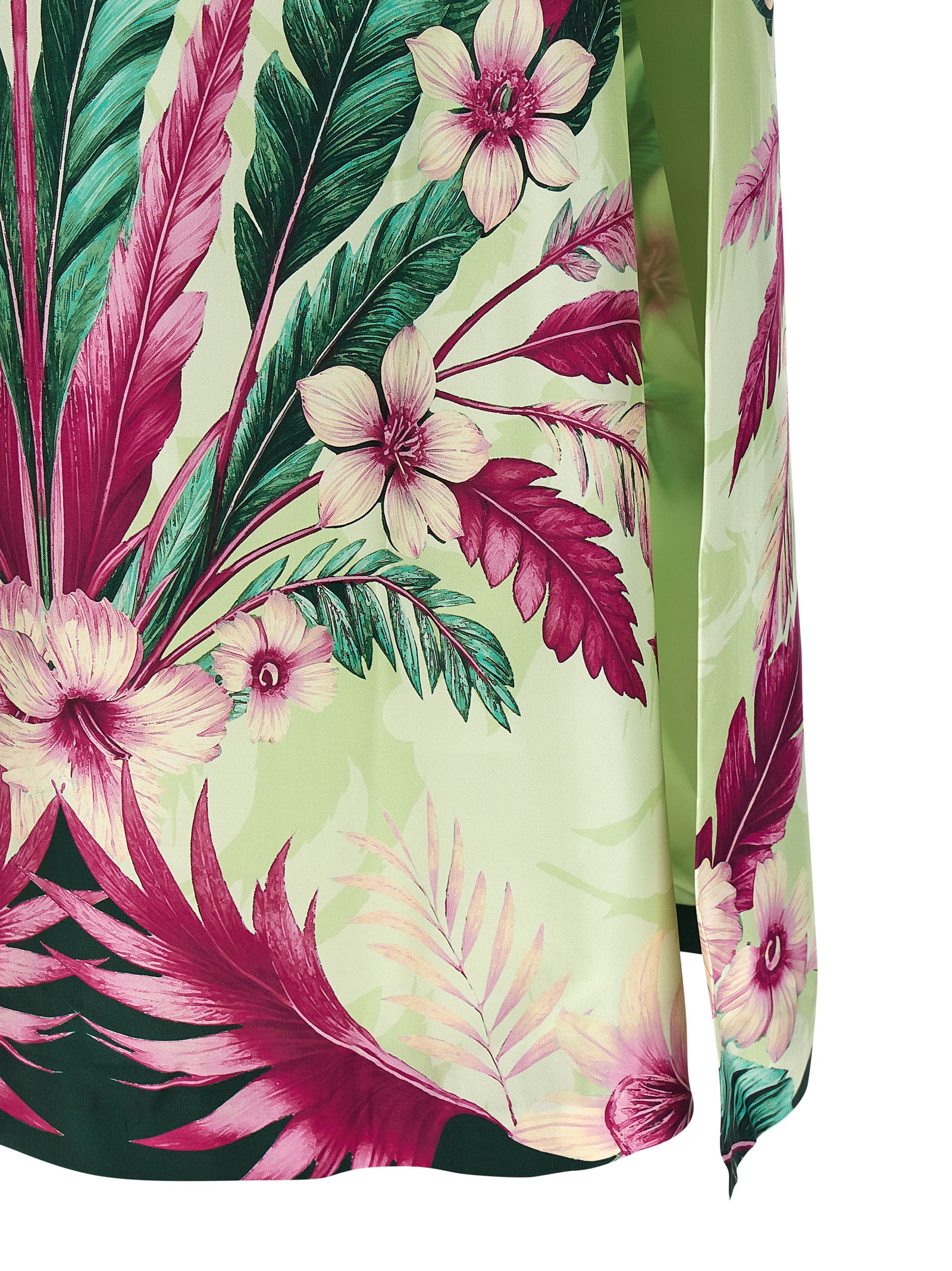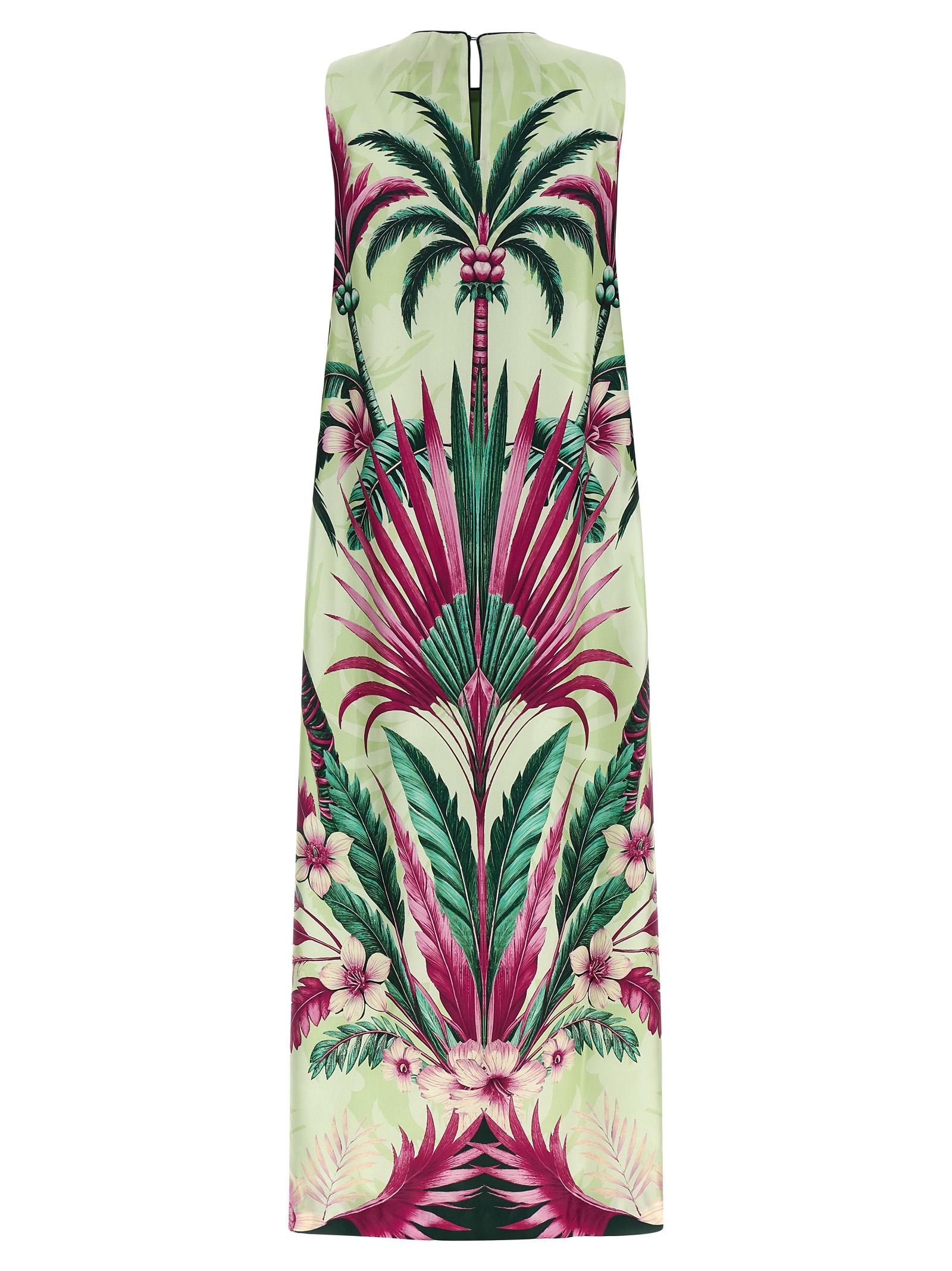 Long ‘Penelope’ dress in ‘Palm bouquet’ print silk twill, flared silhouette, crewneck with back button closure and cut-out teardrop detail, sleeveless, sides with wide slits and buttons.