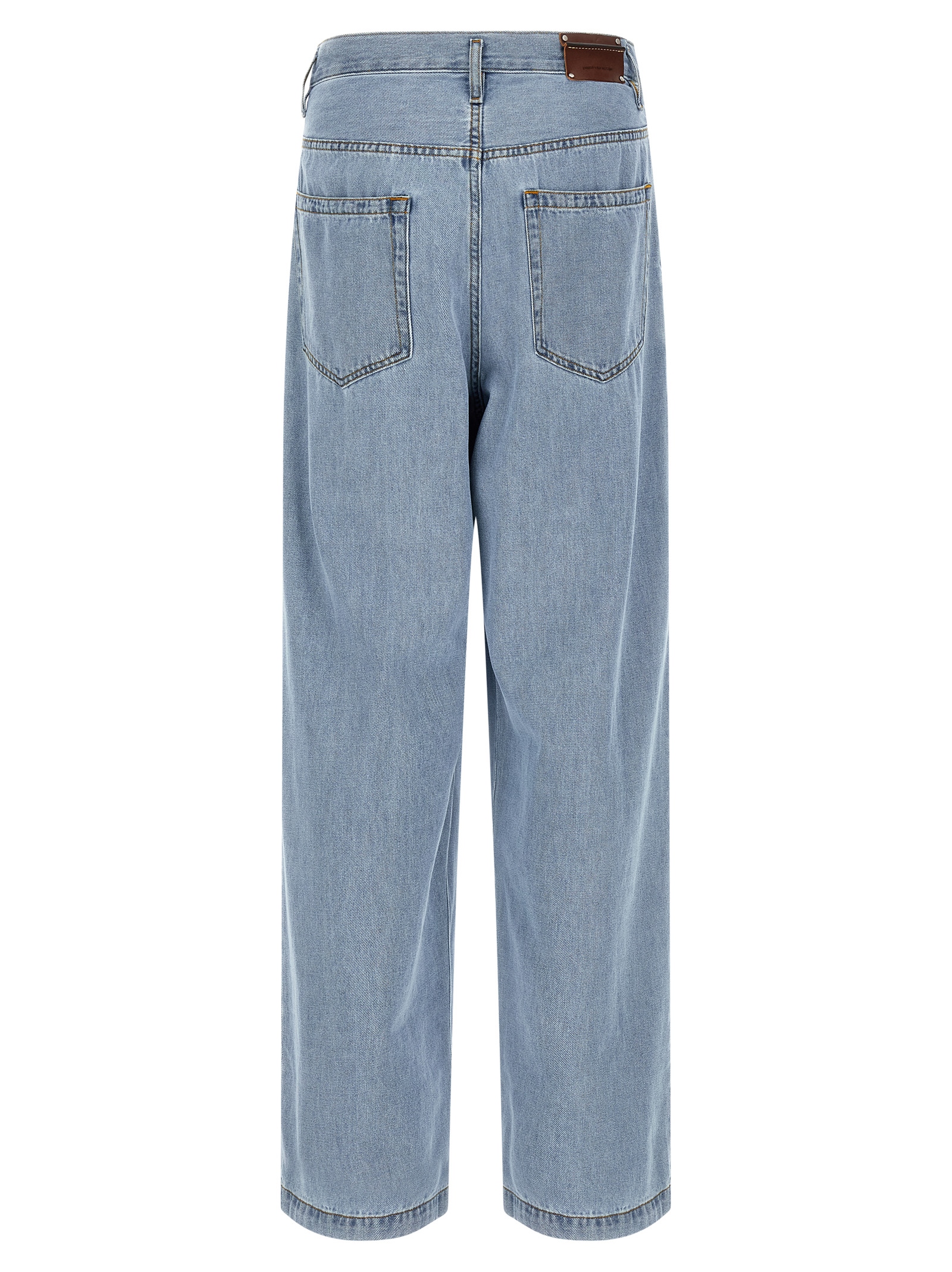Penning Den jeans in cotton denim with contrast stitching, pleats, wide leg, front button closure, five pockets, and leather logo label at the back.