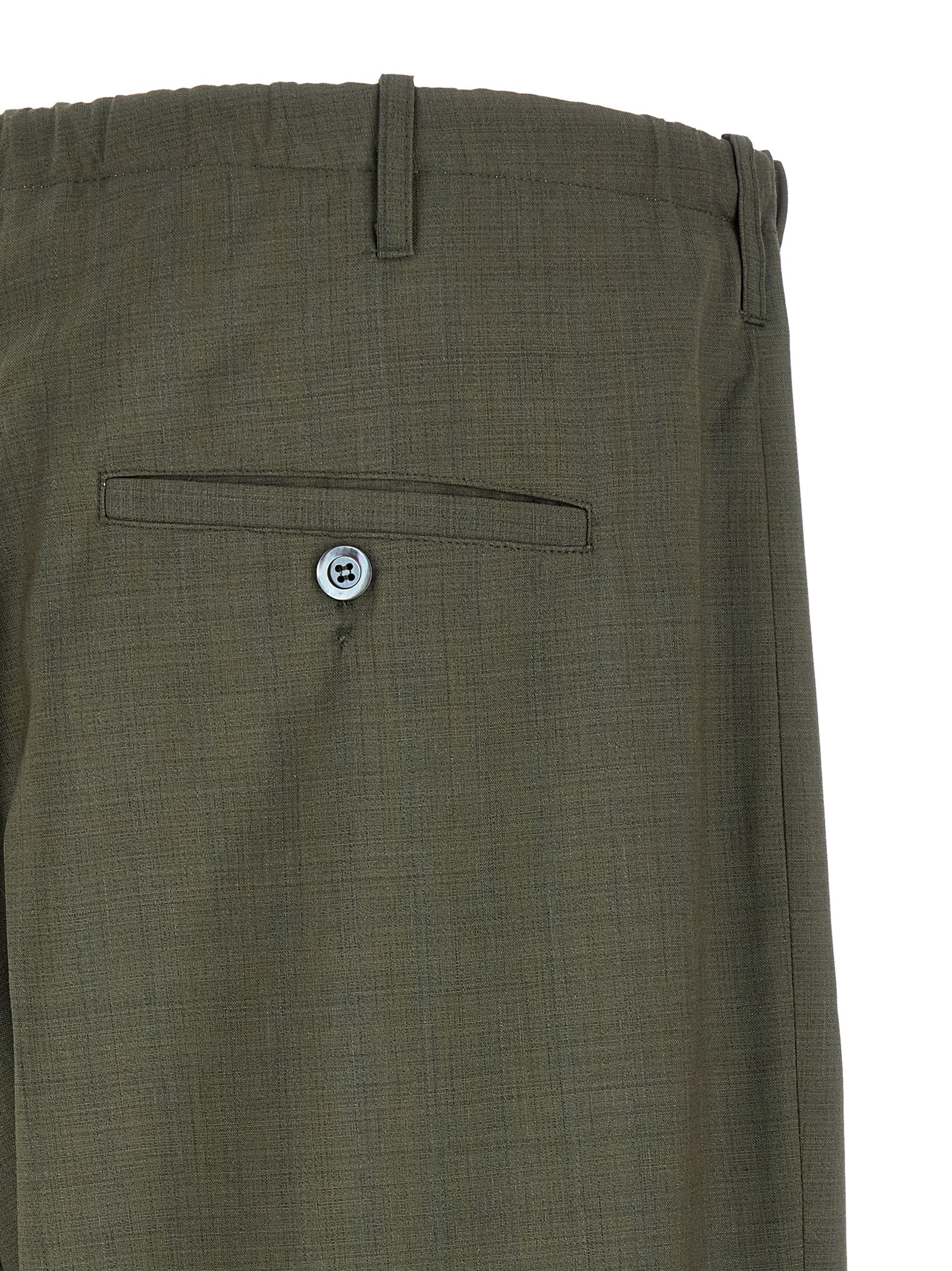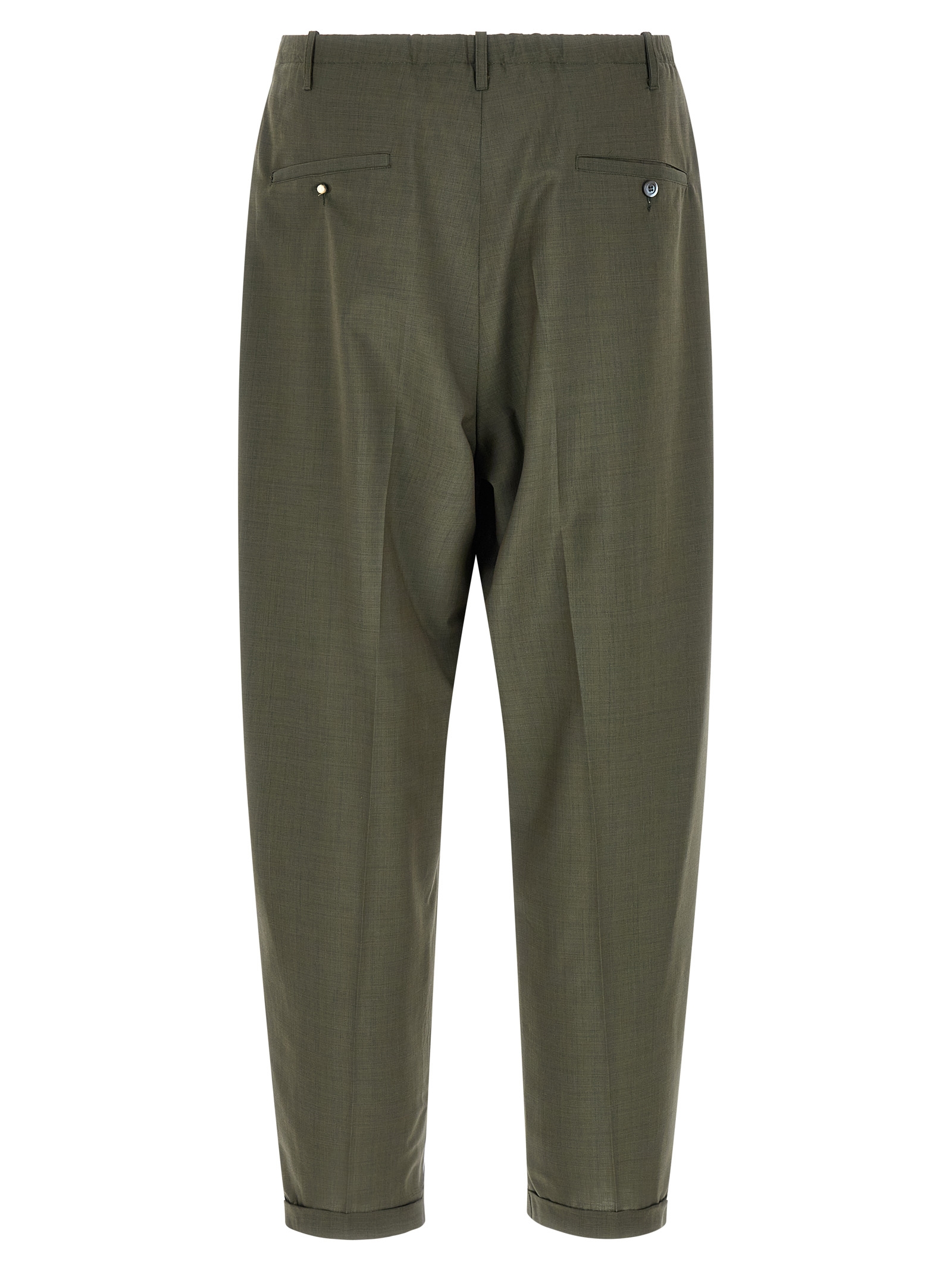 ‘People’s’ cool wool pants, pince, stretched pleat, tapered leg, zip flap, drawstring elastic waistband, pockets, turn-up hem.