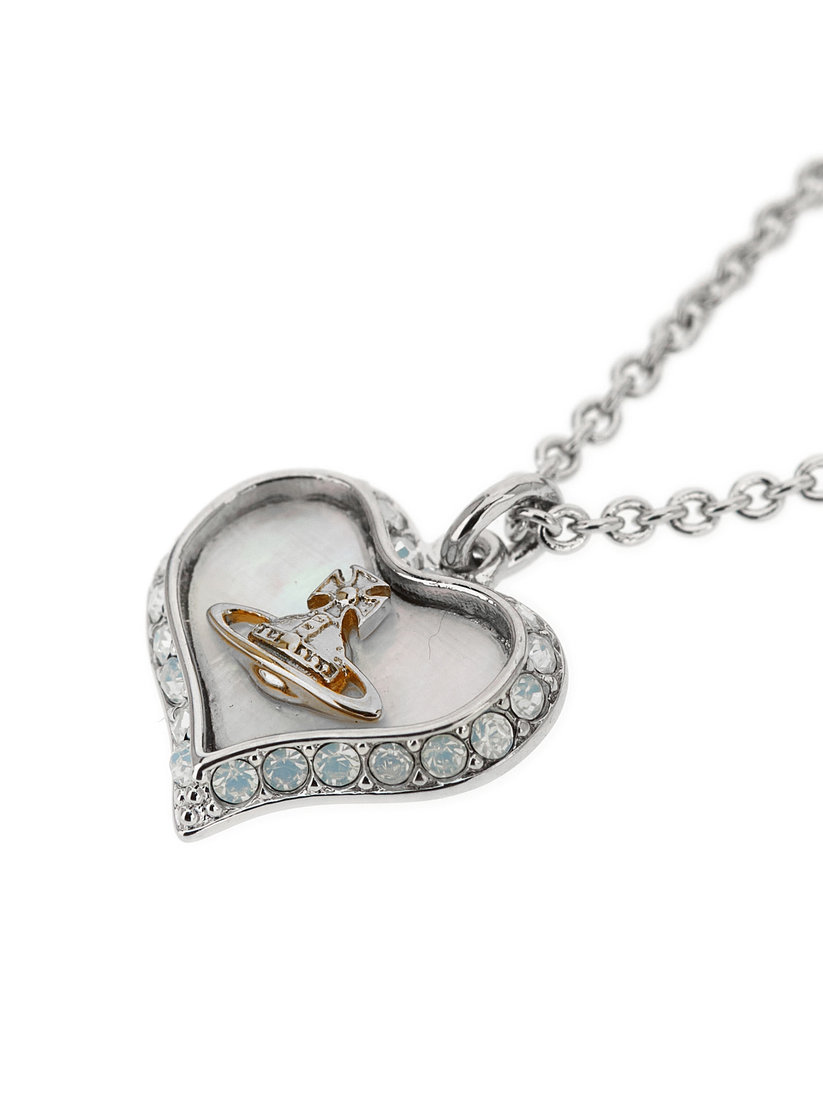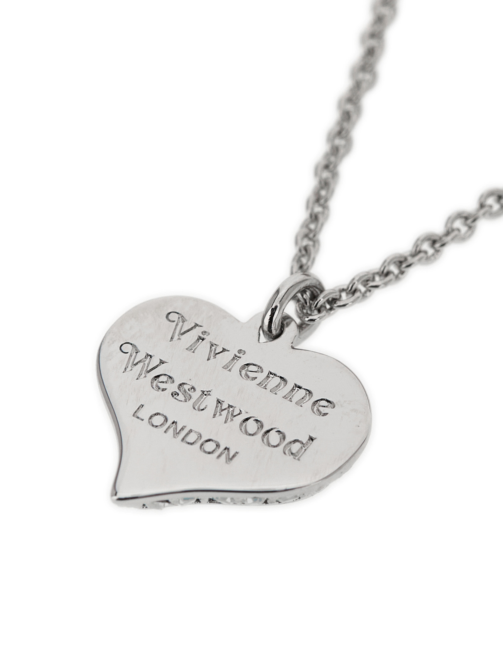 Petra’ necklace in silver-plated metal, heart pendant with rhinestones and embossed logo, and snap hook closure.