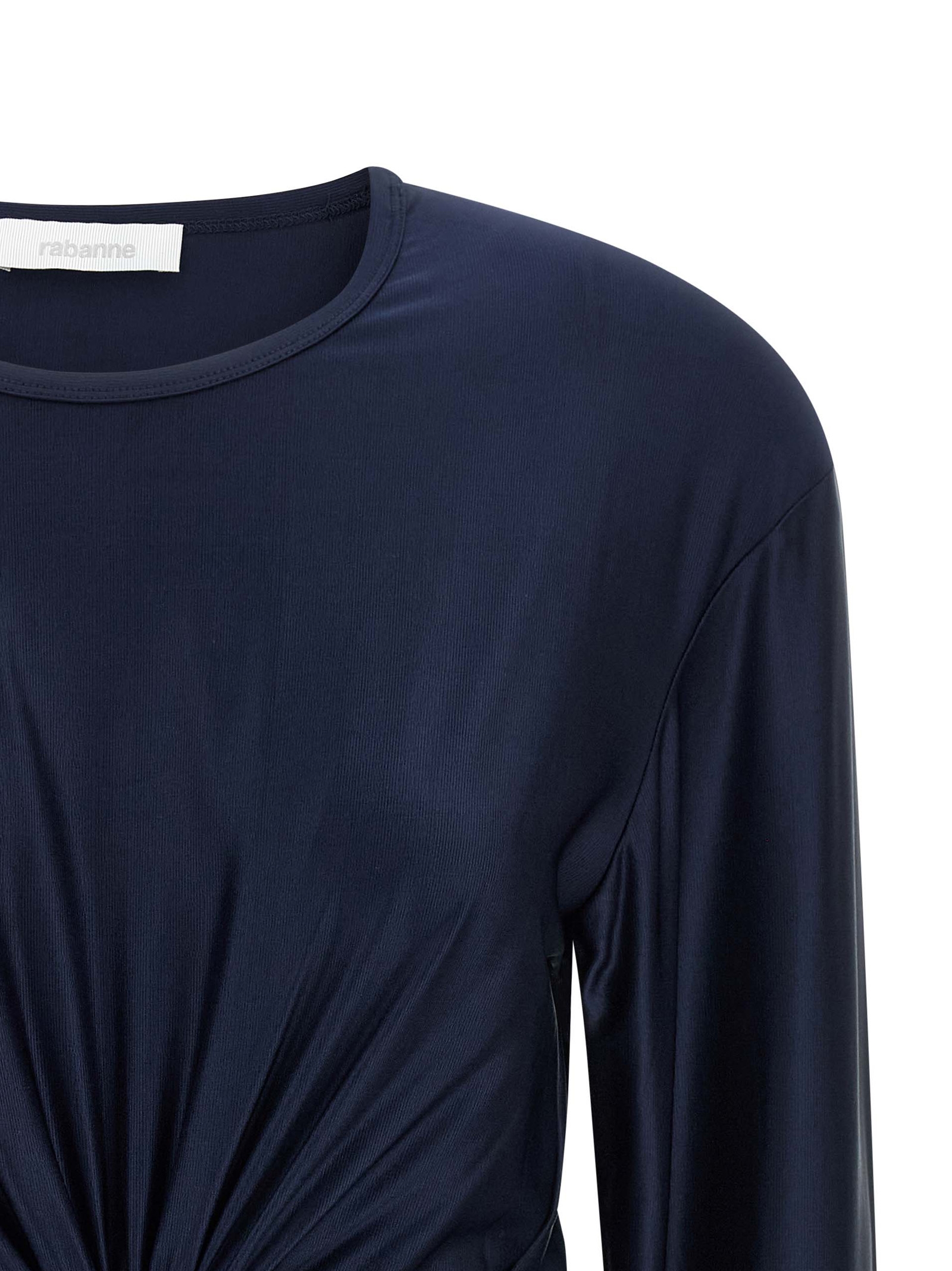 Satin viscose top, metal ‘Piercing Detail’ with front crystals that creates draping, crop model, crew neck, long sleeves, asymmetrical hem.