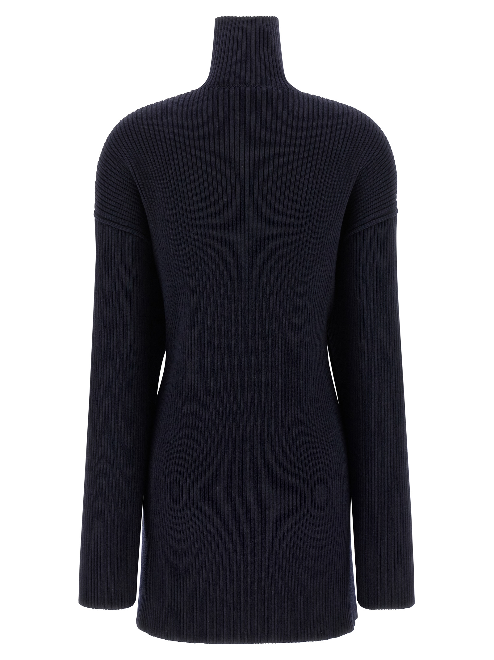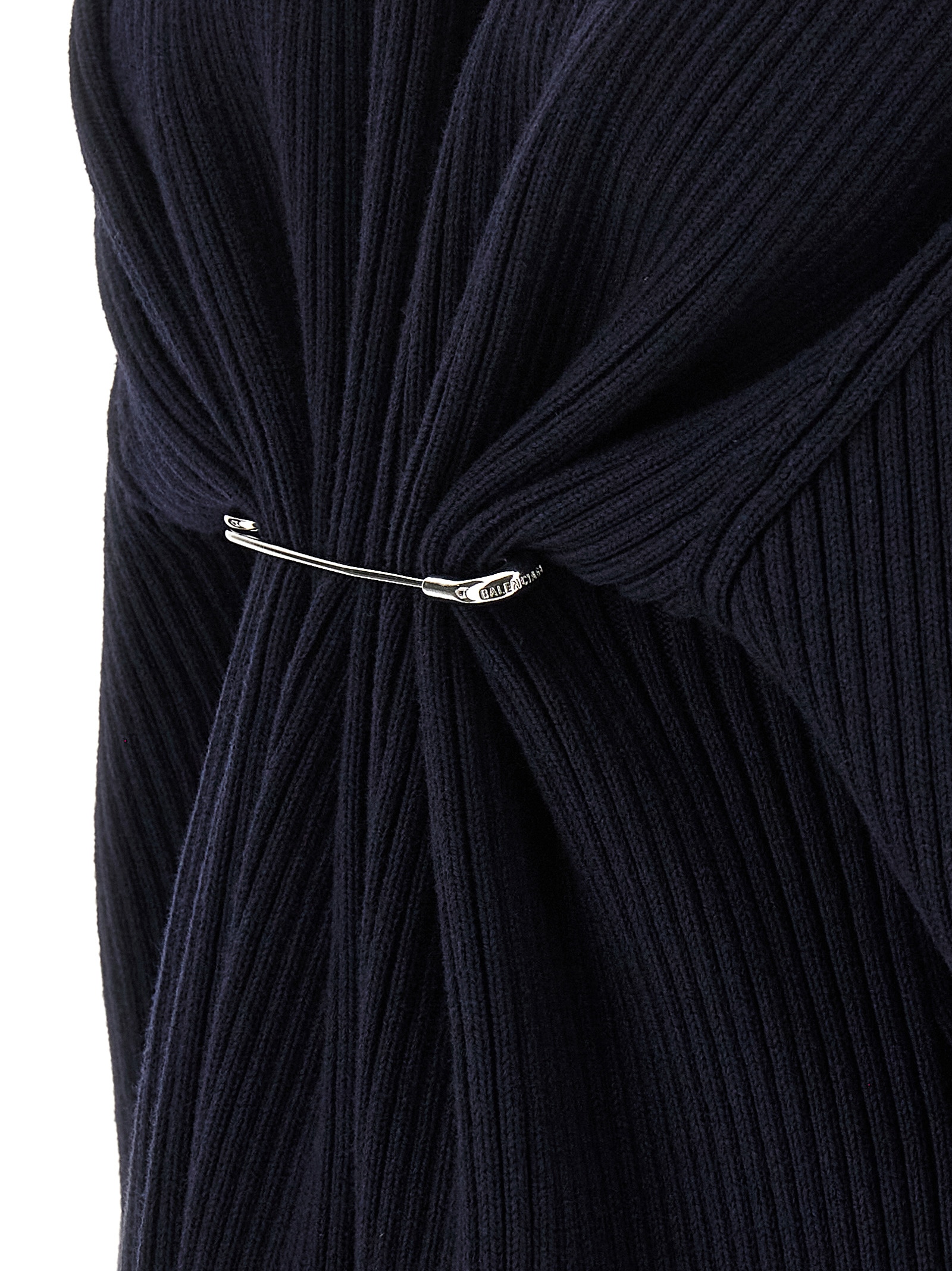 ‘Pinched’ ribbed knit mini dress, high neck with maxi front safety pin detail, long sleeves.