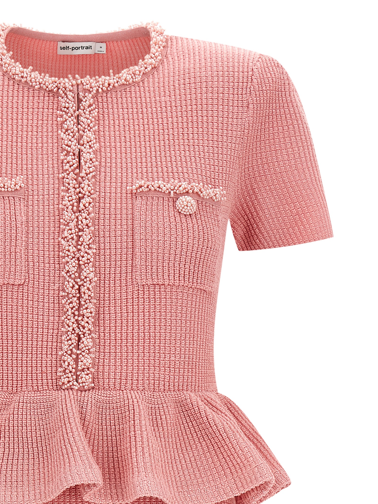Pink Peplum Knit Midi’ waffle knit dress with tone-on-tone beads on the front, crew neck, front hook closure, pockets, peplos waistband, removable padded shoulder straps, short sleeves, sheath skirt.