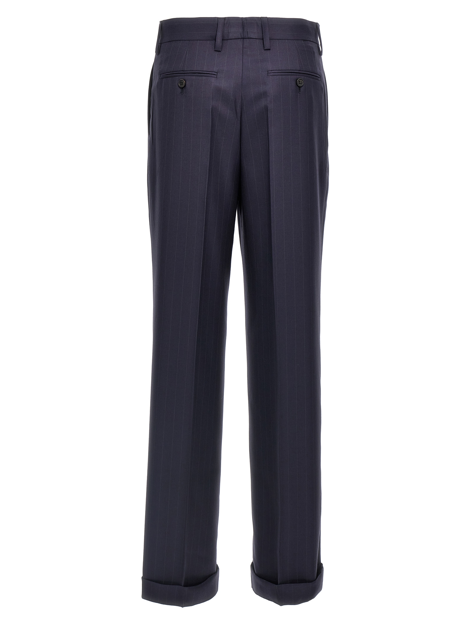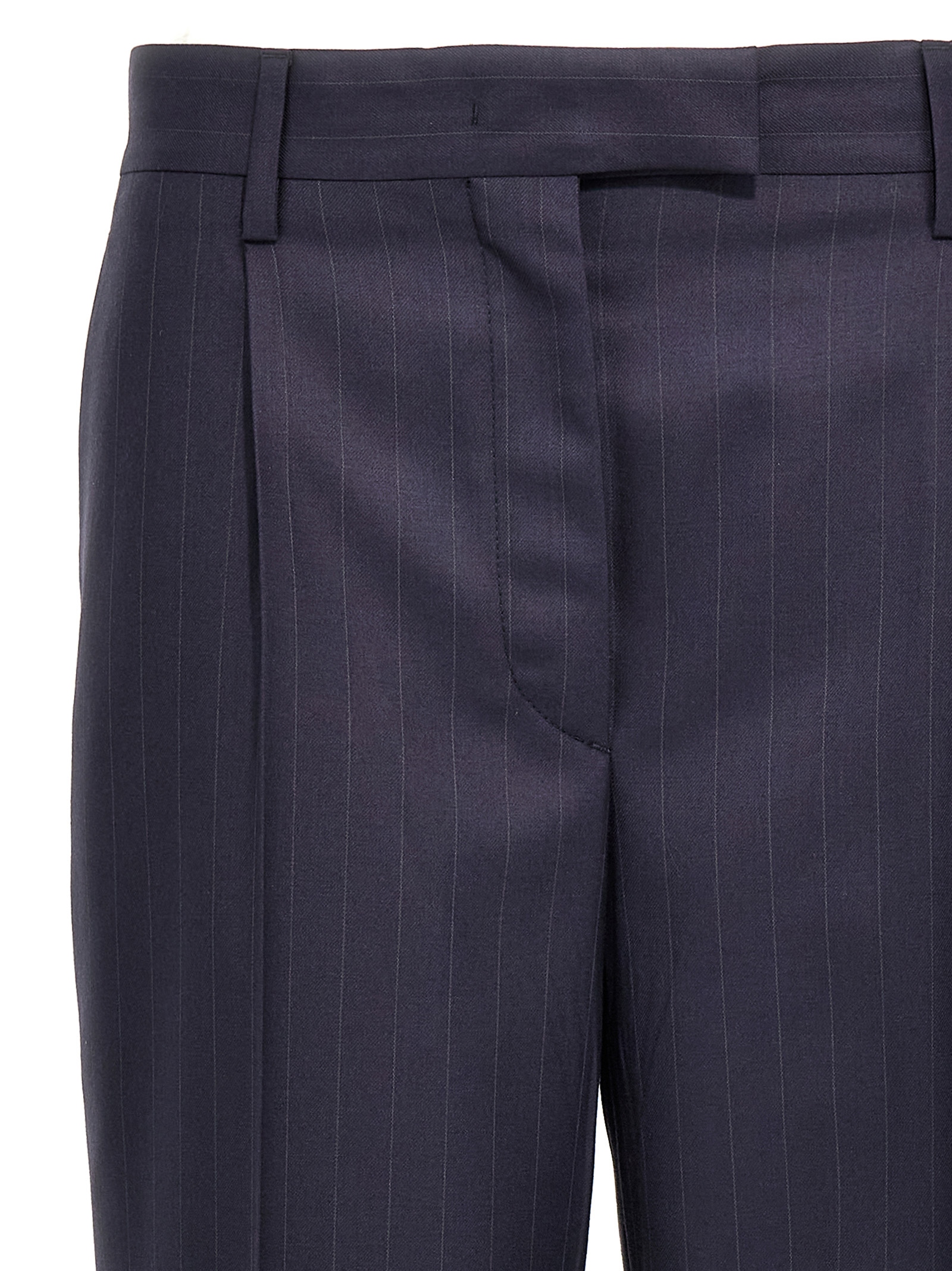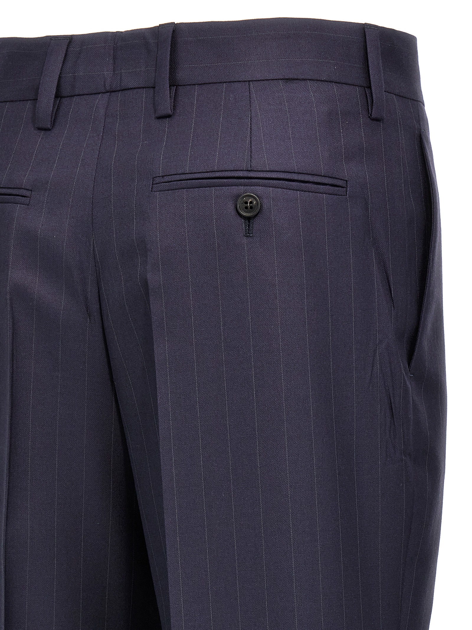 Pinstripe gabardine trousers, straight leg, stretched pleat, pockets, zip hook and front button closure, turn-up hem.