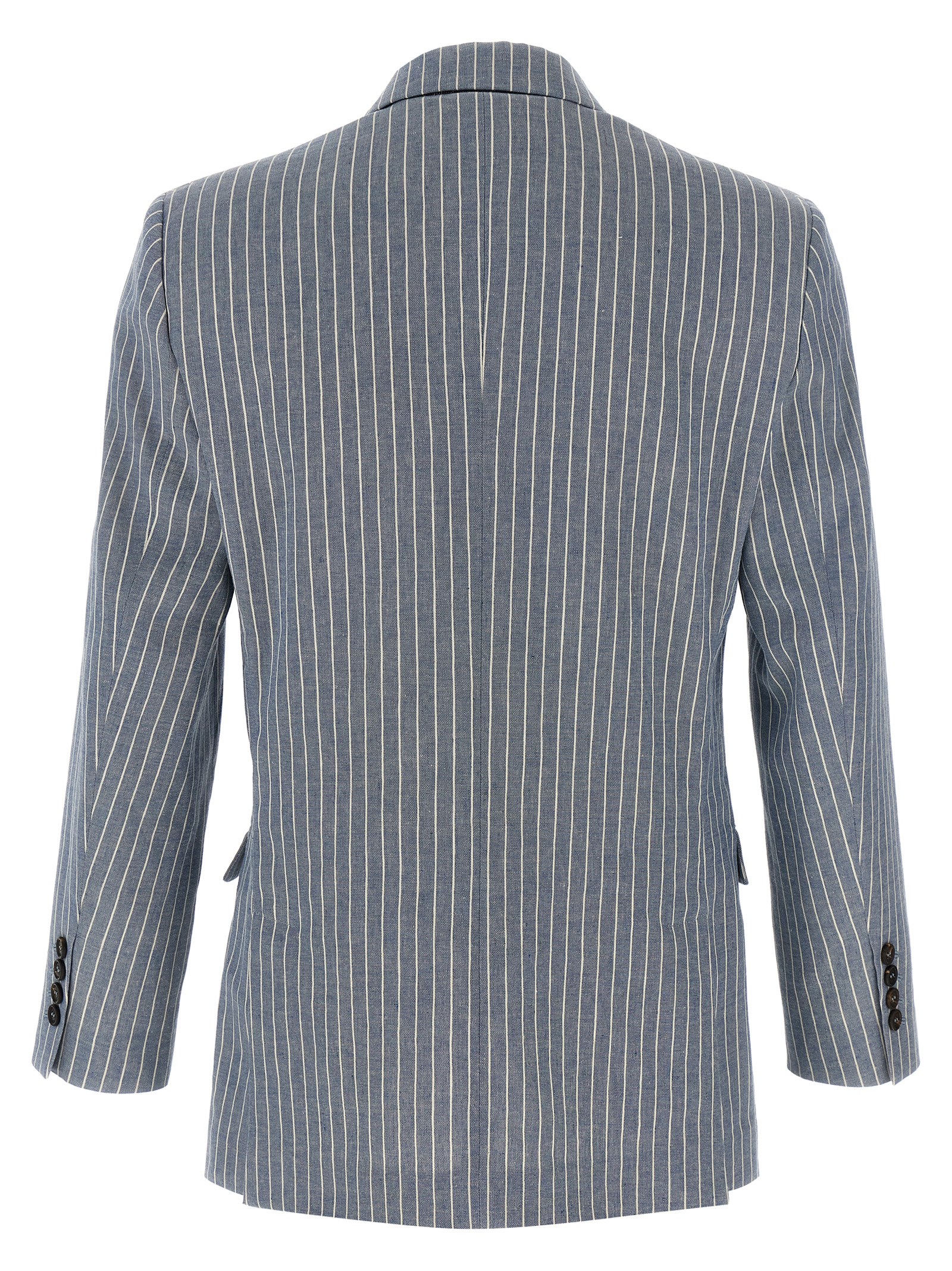 Single-breasted blazer in pinstriped linen and hemp twill with monile, front horn button closure, back Monile detail, mirror lapels, half lining in crêpe and silk blend, chest pocket and low flap pockets, long sleeves, slightly padded shoulder strap, back vents.
