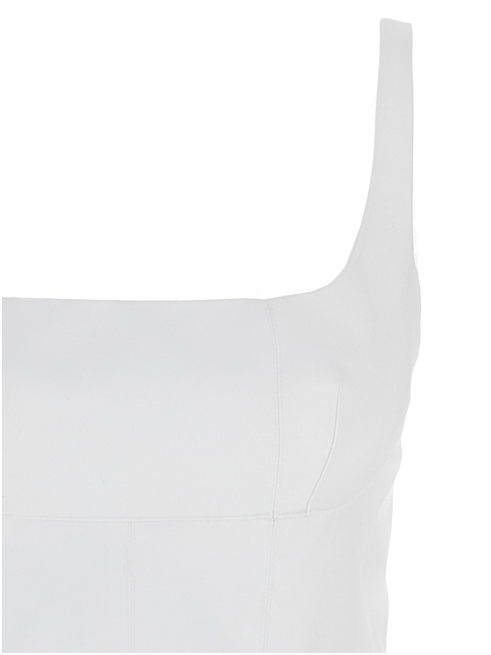 Cotton blend mini dress with pleated hem, square neckline, sleeveless, back zip closure.