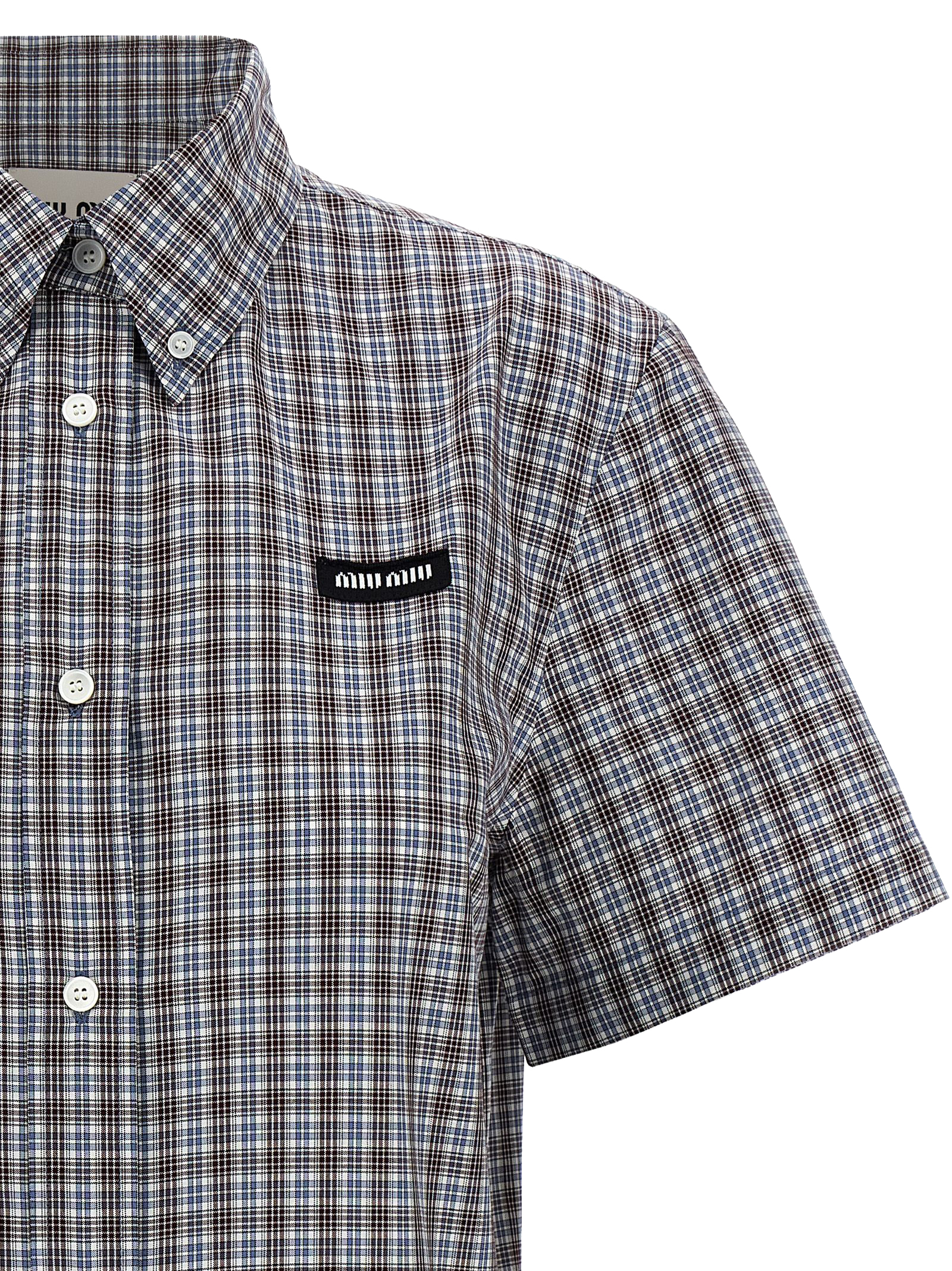 Mini dress in cotton poplin with all-over check print, button-down shirt model, logo embroidery and front button closure, pleated skirt, and short sleeves.