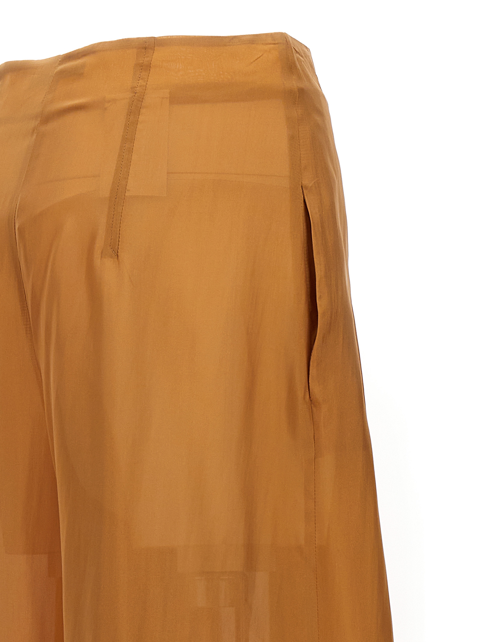 Pleated silk pants with zip and button closure and a loose leg.