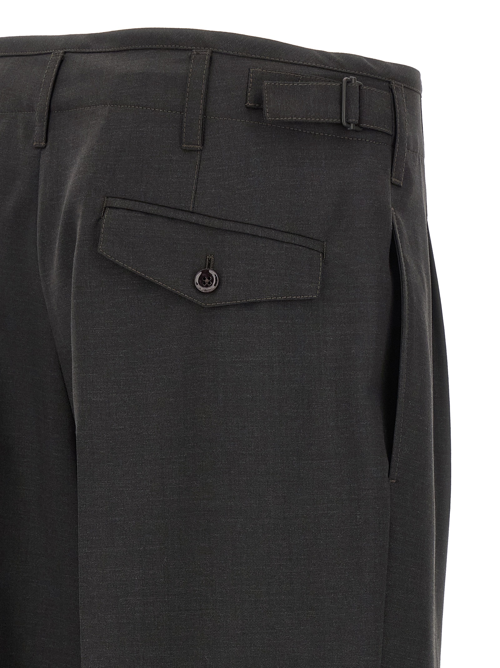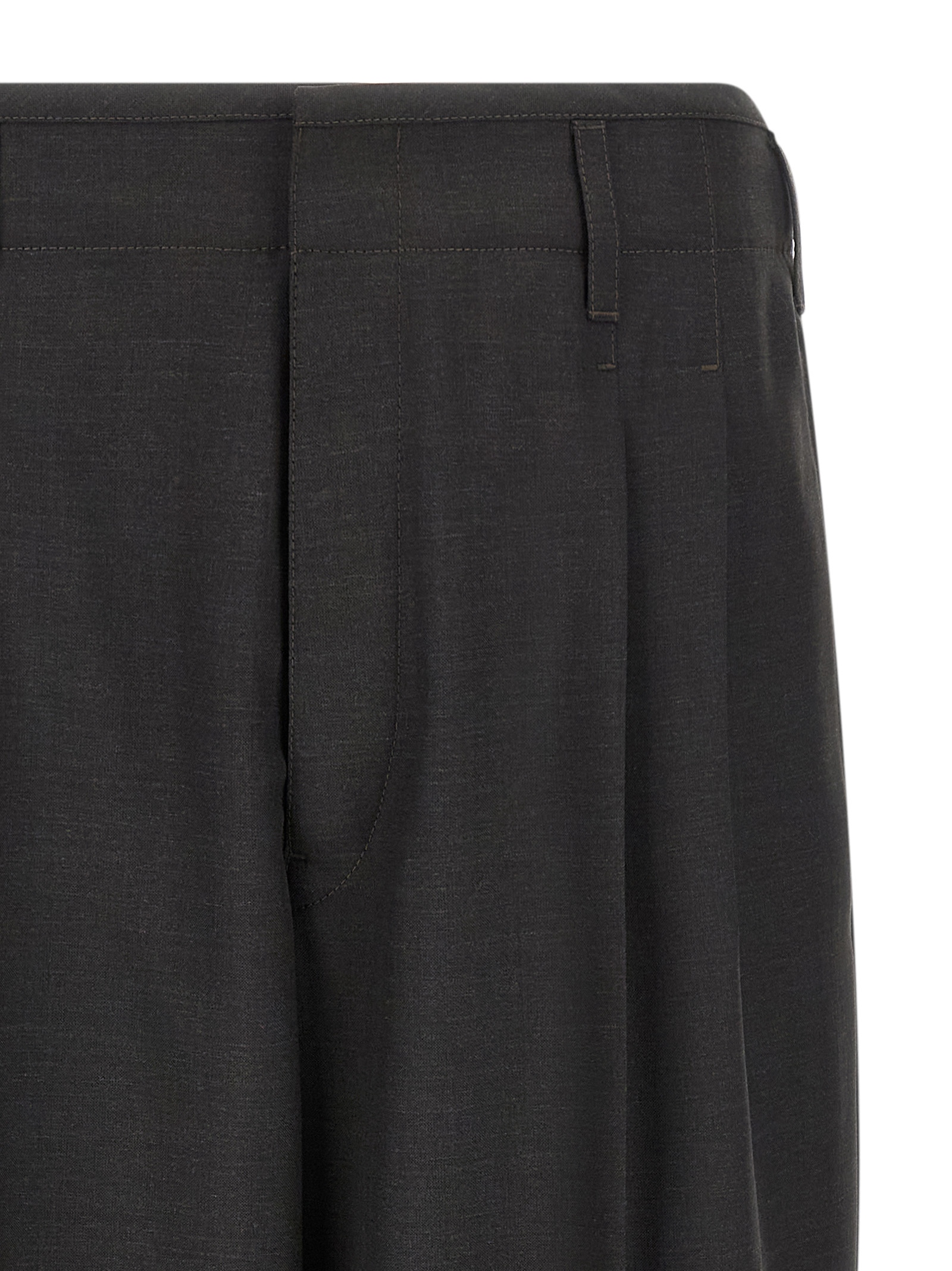 ‘Pleated’ trousers in tropical wool blend suiting fabric characterized by a mottled appearance and a dense and soft hand, pins, stretched pleat, waistband and tone-on-tone bias edge, front button and hook closure, pockets, high waist.