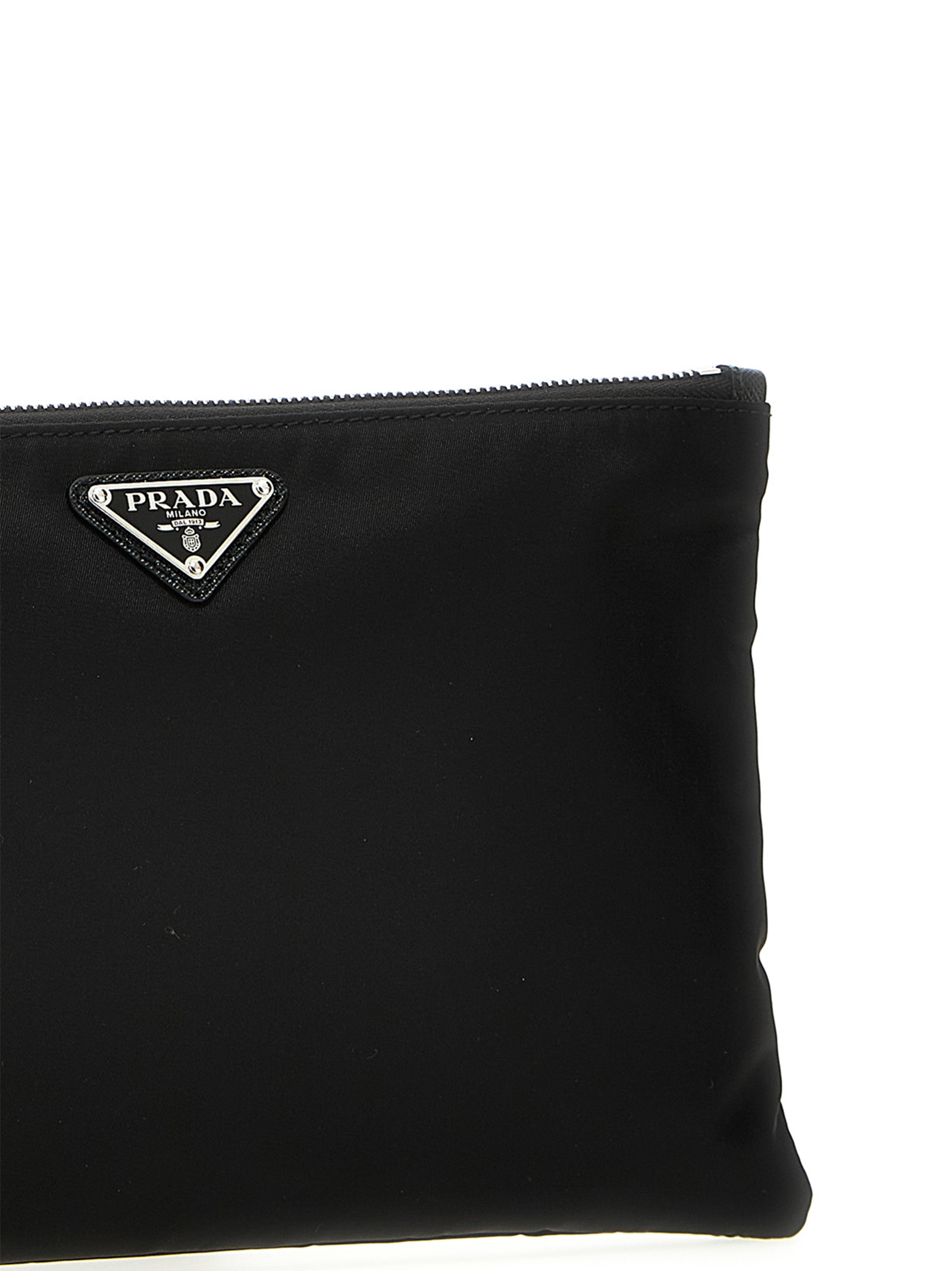 Pochette in Re-Nylon con applicazione logo triangolo in metallo smaltato frontale, manico da polso amovibile in pelle, chiusura zip. JULIAN SUSTAINABLE: Prodotto realizzato con Re-Nylon, un filato rigenerato realizzato dal riciclo e dalla purificazione delle materie plastiche raccolte in oceani, reti da pesca e fibre tessili.