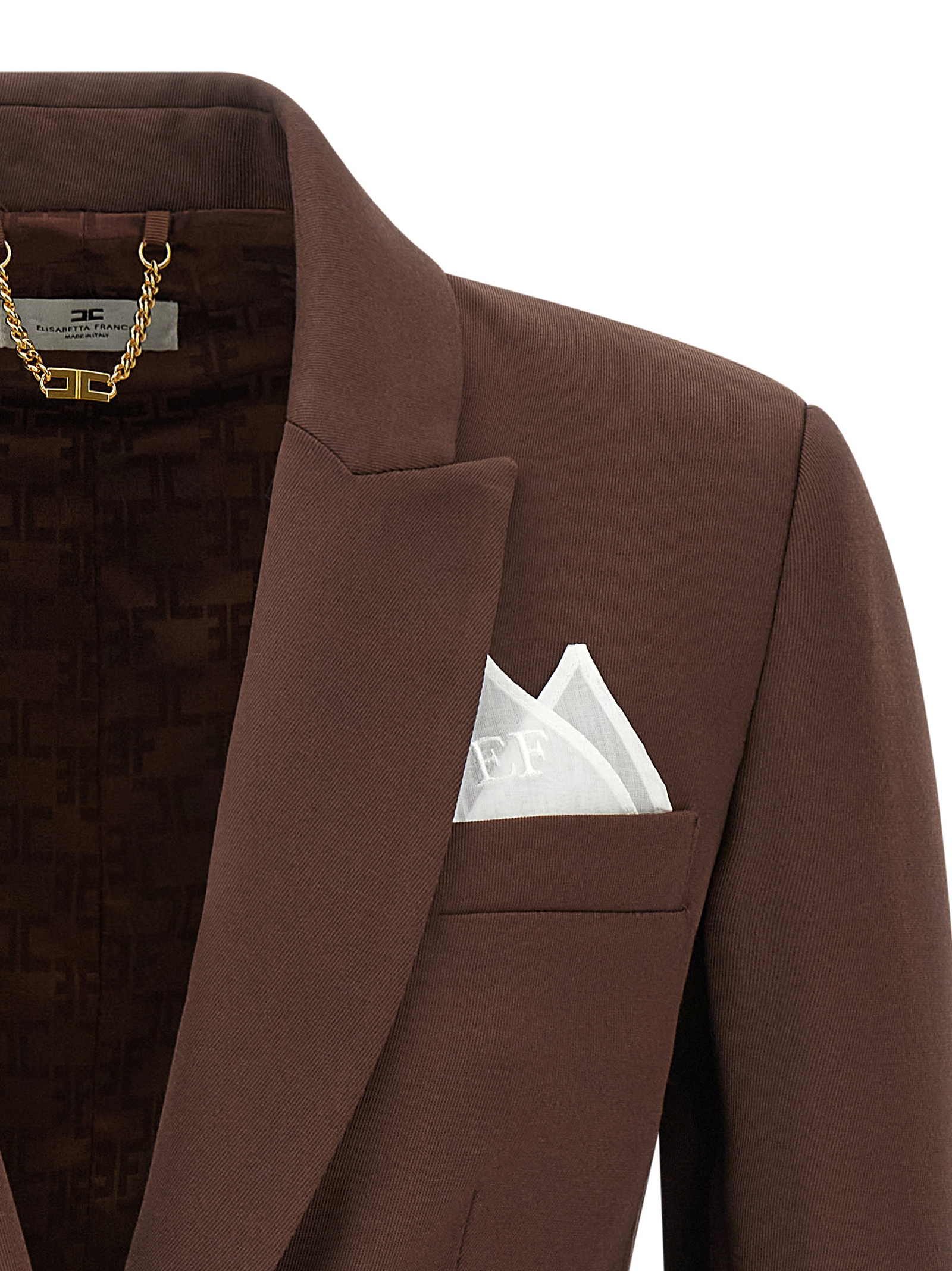 Single-breasted viscose blend blazer with front logo button closure, peak lapels, pocket with contrasting trompe l’oeil clutch detail, pockets, structured shoulder strap, long sleeves, back split, monogram fabric lining.