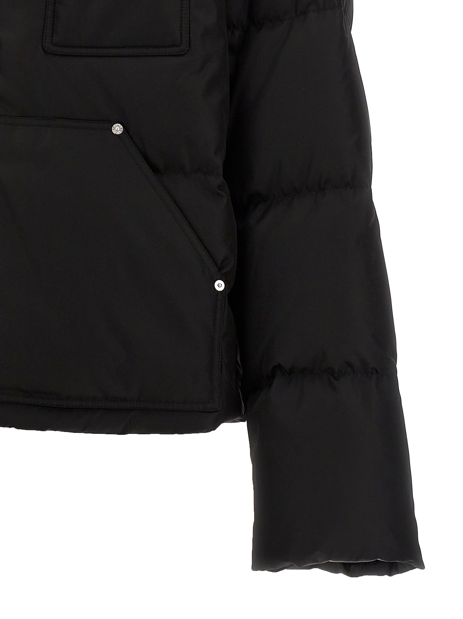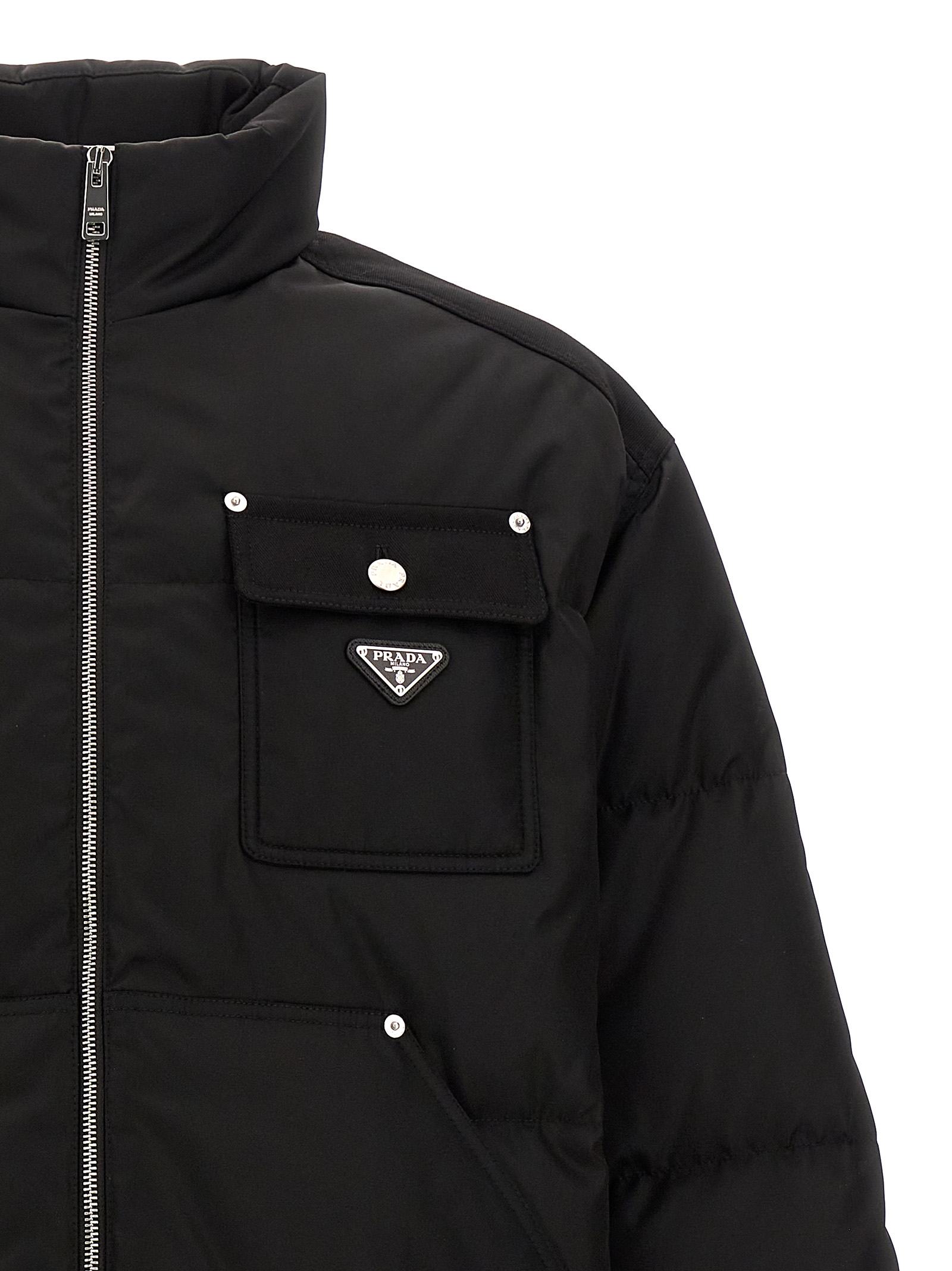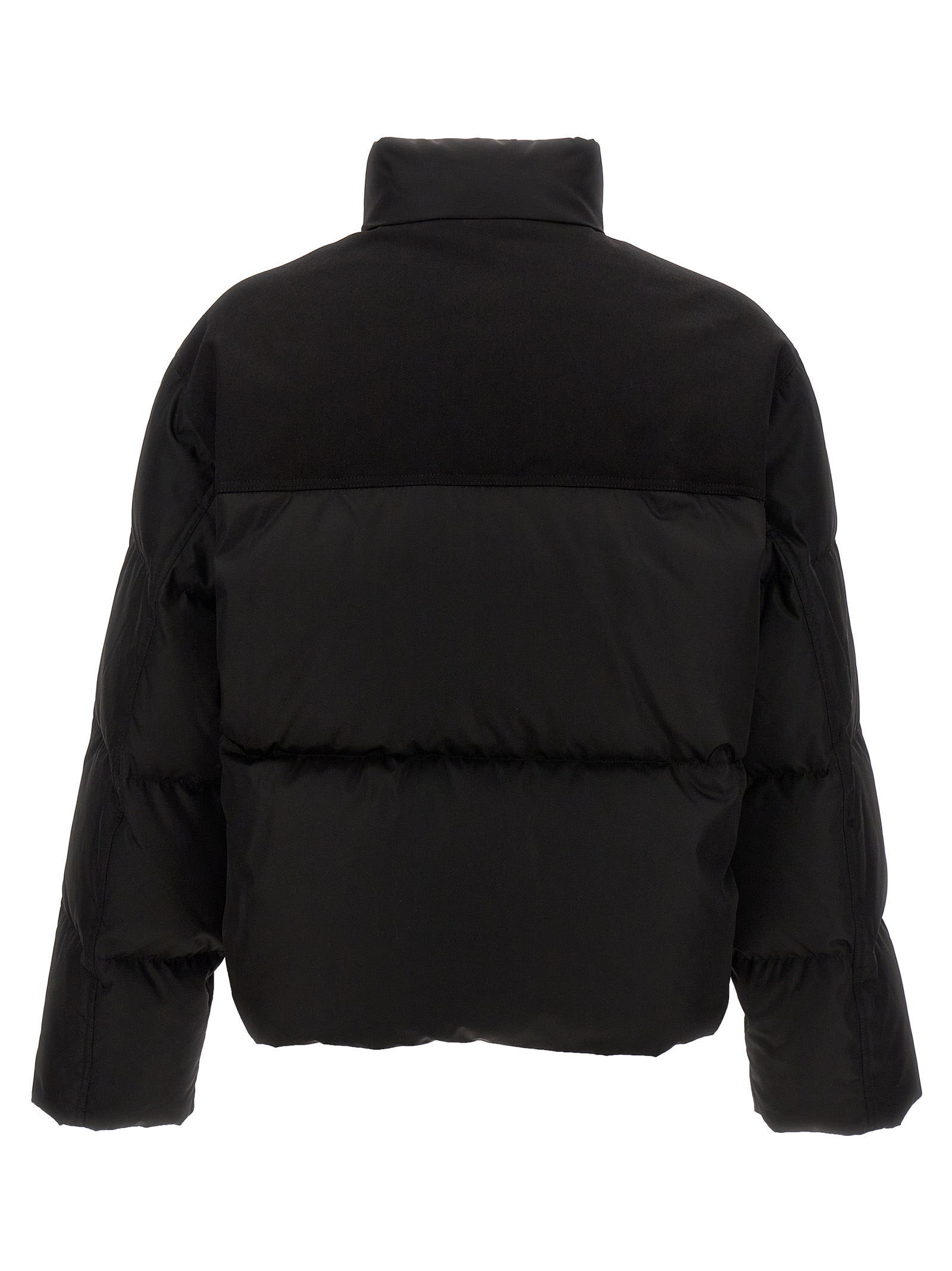 Crop down jacket, front patch pockets, metal triangle logo, contrast fabric on the shoulders, front zip closure.