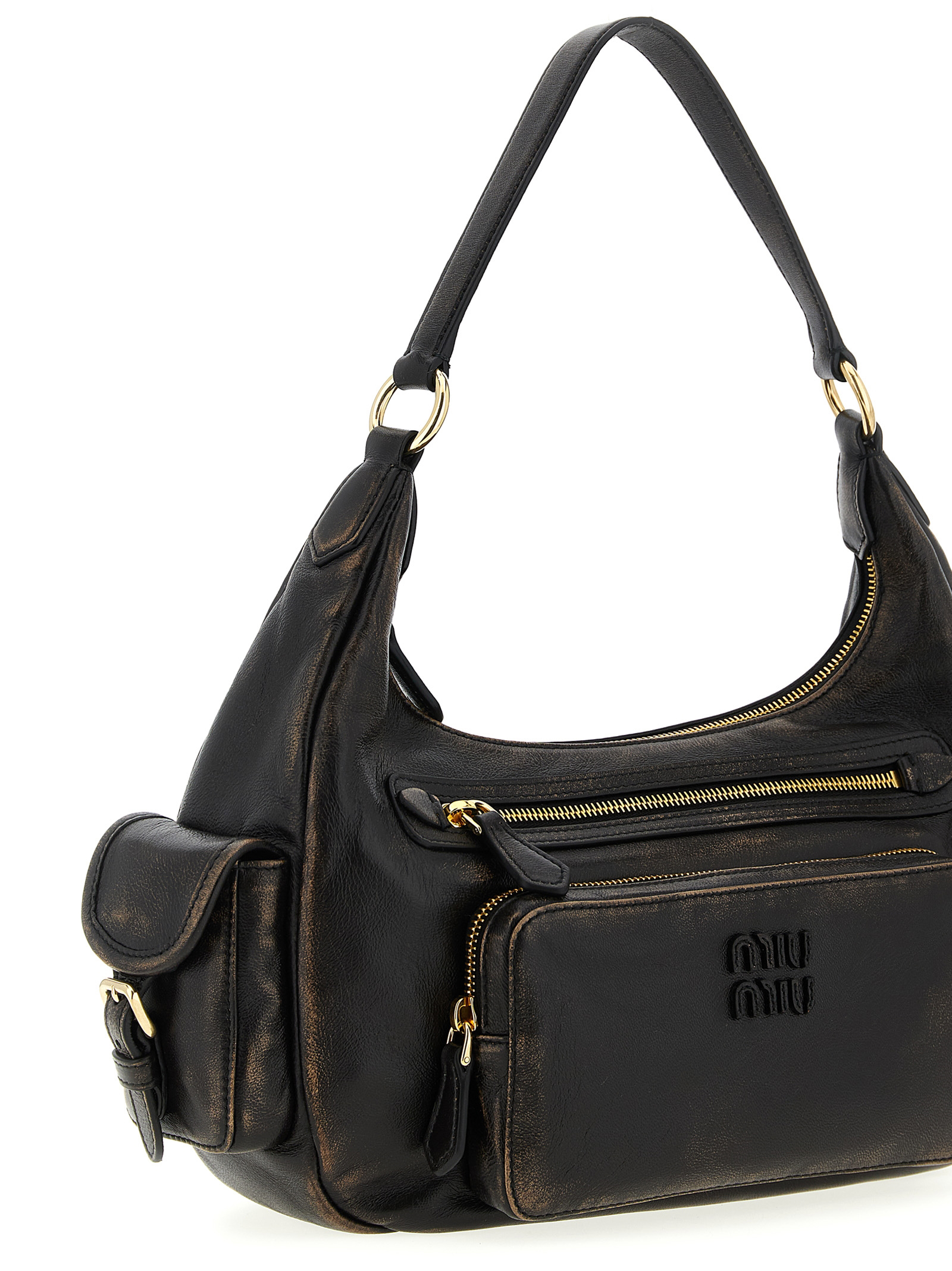 ‘Pocket’ shoulder bag in aged nappa leather, multi-pocket style, front embossed lettering logo, fixed handle, top zip closure, cotton satin lining.
