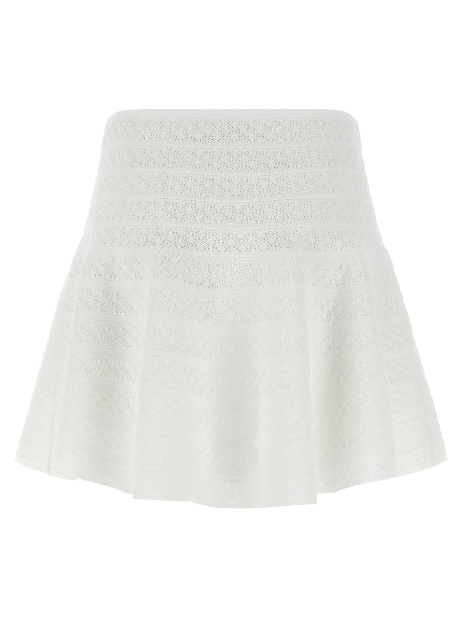 Mini skirt in perforated and slightly elasticized ‘Pointelle Knit’ knit, wheel model, elastic waistband, front jewel button detail.