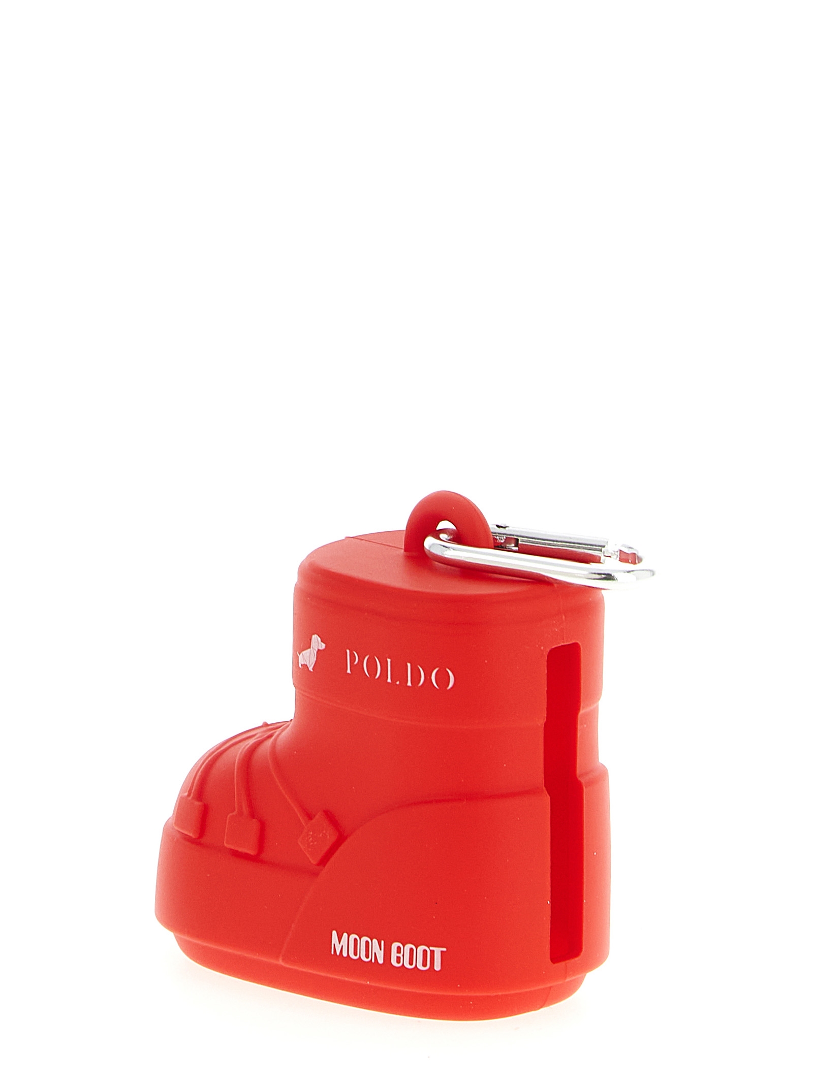 Poldo x MoonBoot holder Poldo’ silicone boot-shaped bag with a snap hook.