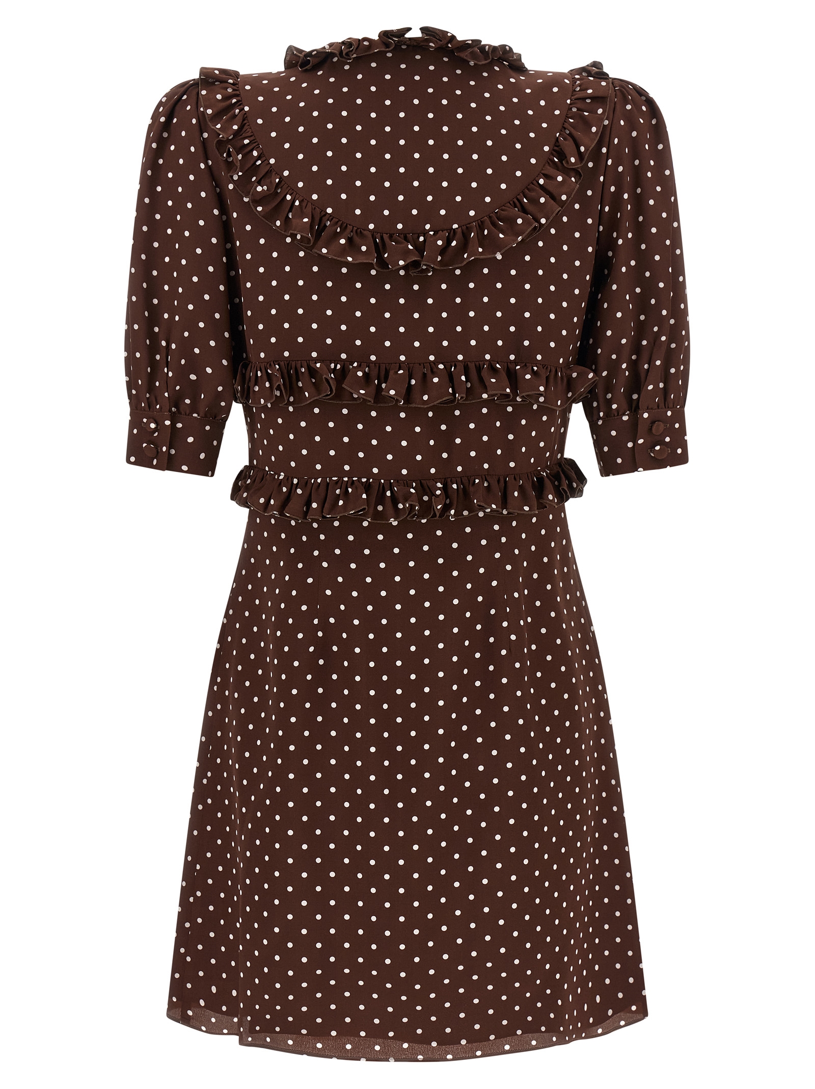Polka Dot Mini’ polka dot silk dress with ruffles at the top, V-neck, front jewel button closure, short puff sleeves with cuffs, lining.