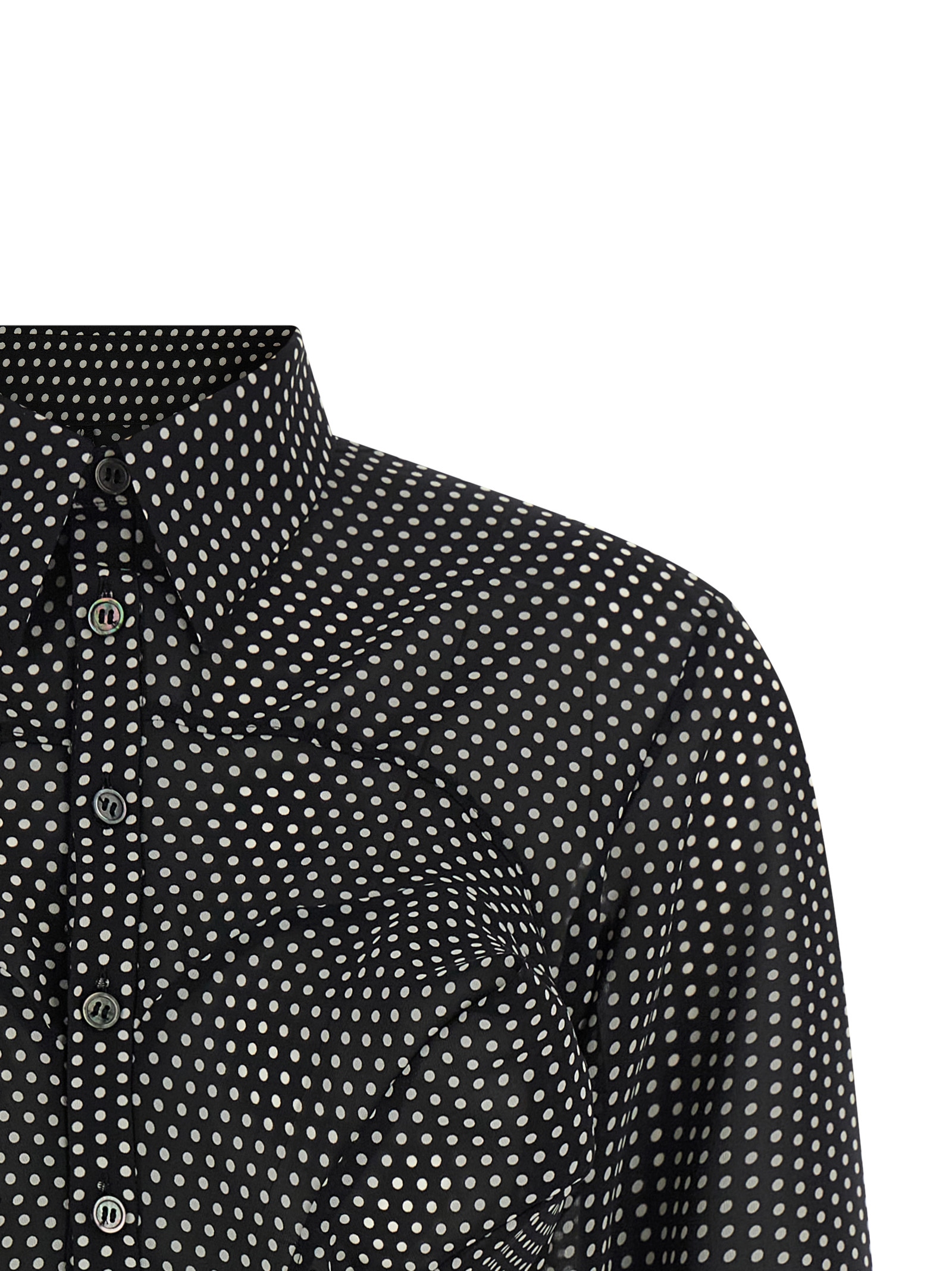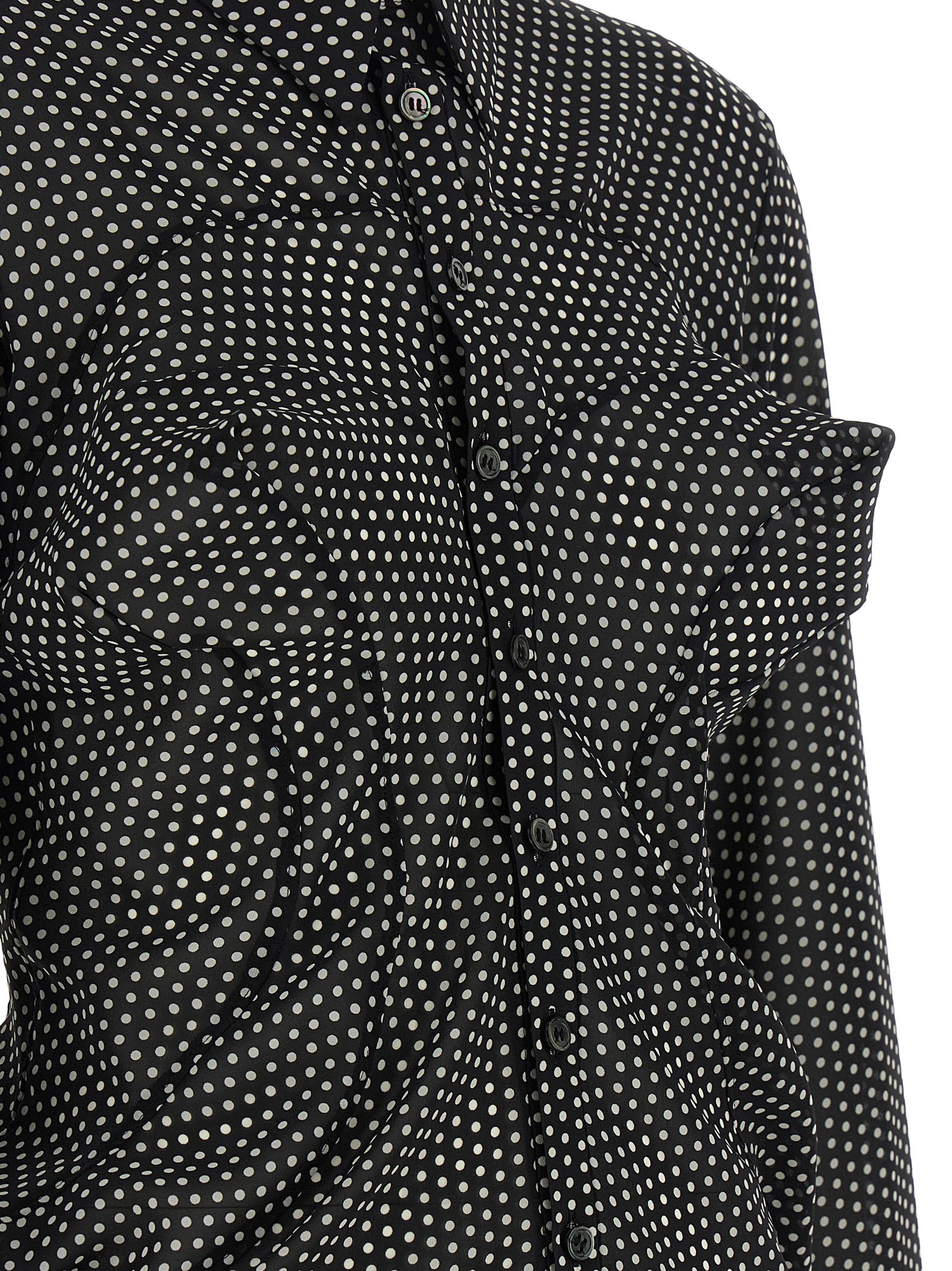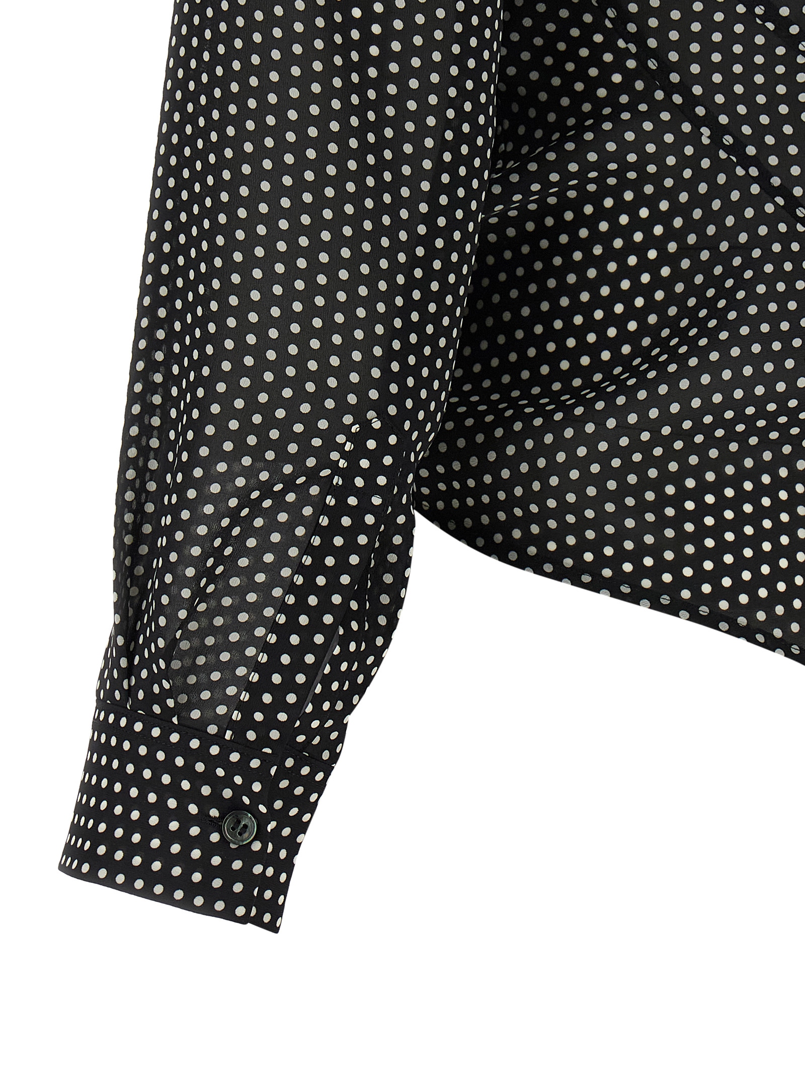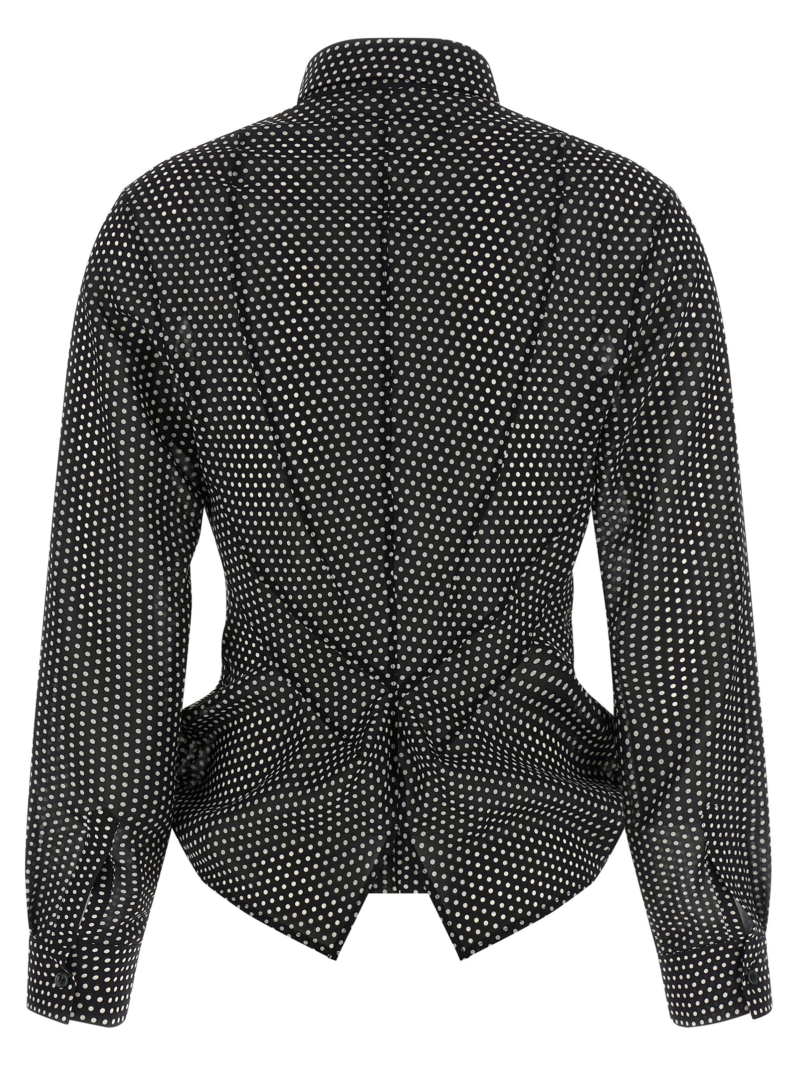 Polka dot patterned silk-effect fabric shirt, pins and volume games to create pointed areas, pointed collar, front button closure, long cuffed sleeves, back split, asymmetric hem.